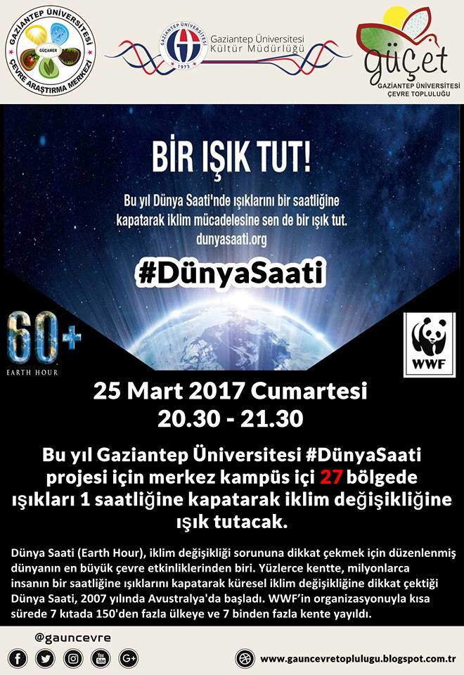 Dünyanın en büyük çevre etkinliklerinden birisi olan Dünya Saati (Earth Hour) uygulaması, Gaziantep Üniversitesi’nde, Gaziantep Üniversitesi Çevre Araştırmaları Merkezi (GÜÇAMER) ve Gaziantep Üniversitesi Çevre Topluluğu (GÜÇET) katkıları ile gerçekleşti. GÜÇAMER Müdürü Öğr. Gör. Mehmet Atılgan, Dünya Doğayı Koruma Vakfı’nın (WWF) misyonunun; dünyanın biyolojik çeşitliliğini korumak, yenilenebilir kaynakların sürdürülebilirliğini sağlamak, kirlilik ve aşırı tüketimin azaltılmasını teşvik ederek gezegenimizin doğal çevresinin bozulmasını durdurmak ve insanın doğayla uyum içinde yaşadığı bir geleceğin kurulmasına katkıda bulunmak olduğunu belirtti. Dünya Doğayı Koruma Vakfı’nın etkinliğine Gaziantep Üniversitesi olarak 27 birimde ışıkları bütün dünya ile aynı anda 20:30 ile 21:30 arasında bir saat kapatarak katkıda bulunduklarını ifade eden Öğr. Gör. Atılgan, Gaziantep ilinin plaka numarası 27 olduğu için üniversite içerisinde 27 bina seçtiklerini söyledi. Öğr. Gör. Atılgan, iklim değişikliğinin en büyük sorumlularının gelişmiş ülkeler olmasına rağmen iklim değişikliğinin bütün dünyayı etkilediğini ve önlem alınmaz ise dünyayı çok daha büyük çevre felaketlerinin beklediğini vurguladı.