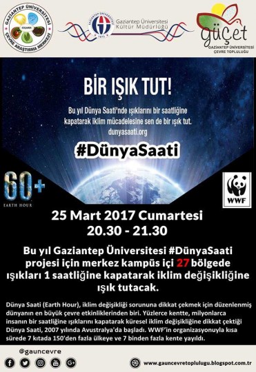 Gaziantep Üniversitesi’nde iklim değişikliğine dikkat çekmek ve Dünya Doğayı Koruma Vakfı’nın etkinliğine etkinliğe destek olmak amacıyla, 25 Mart 2015 günü bütün dünya ile aynı anda bir süreyle 27 binada ışıklar kapatıldı.