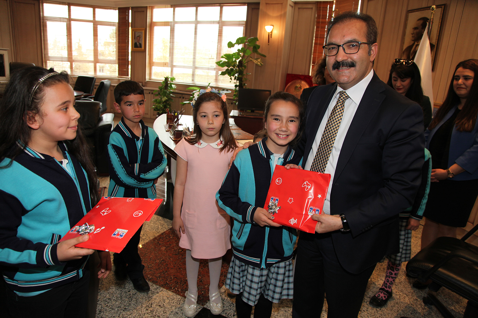 Rektör Gür’ ü makamında ziyaret ederek kendi yaptıkları sulu boya resimler ve çiçek takdim eden GAÜN Kreş ve Anaokulu öğrencileriyle, Vehbi Dai İlkokul öğrencileri, “Bizi kabul ederek çok mutlu ettiniz” dedi. İstiklal Marşı’nı okuyarak Gür’ü heyecanlandıran çocuklardan Taha Şirin ve Senanur Korkmaz, öğrencilerin sportif ve sosyal aktivitelerden daha çok yararlanması dileğinde bulundu.