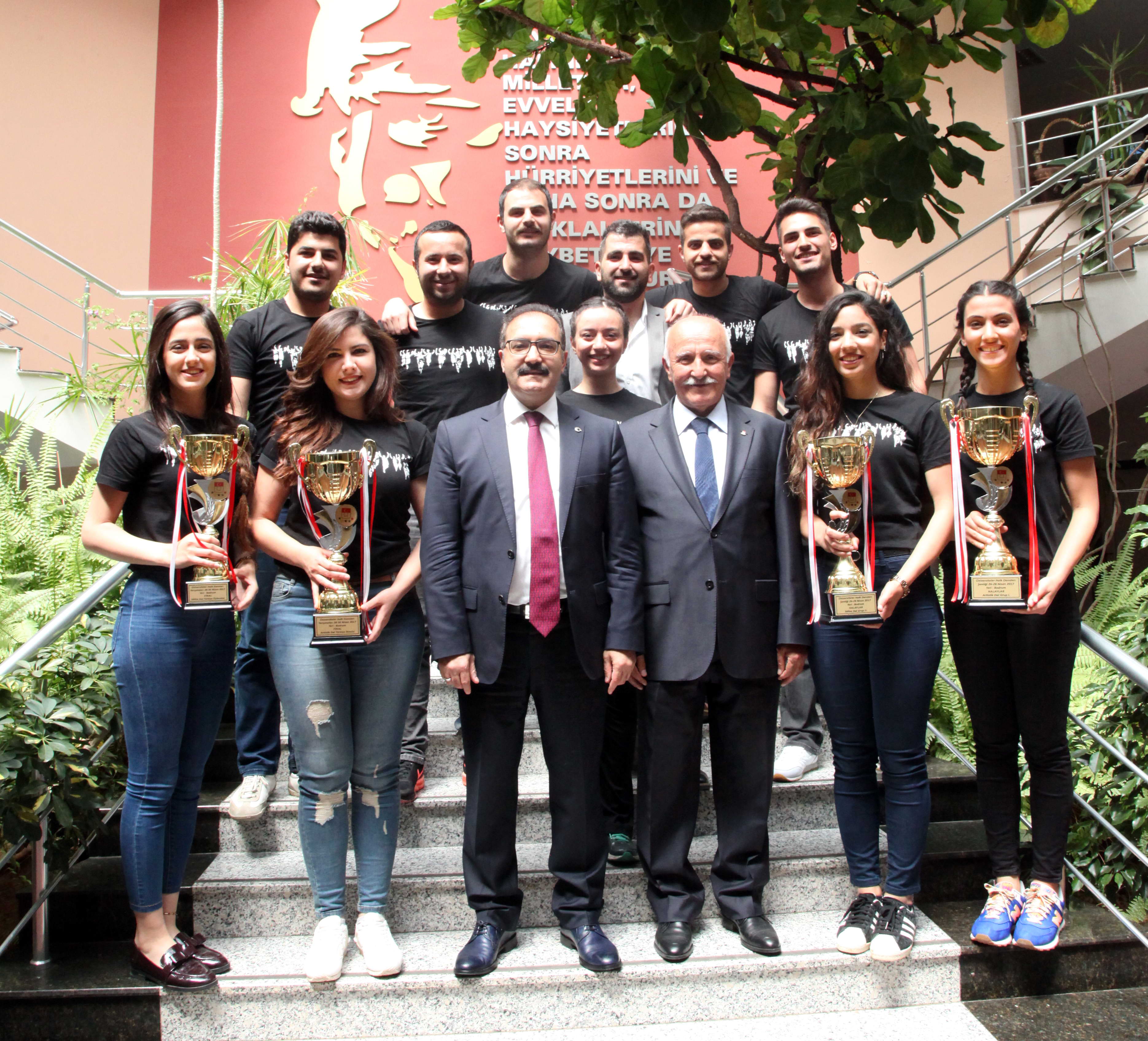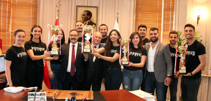 Muğla’da yapılan Üniversiteler Arası Halk Oyunları Yarışması’nda Türkiye ikincisi olan GAÜN Halk Oyunları Ekibi, ziyaret ettikleri Rektör Gür’e kupalarını sundu.