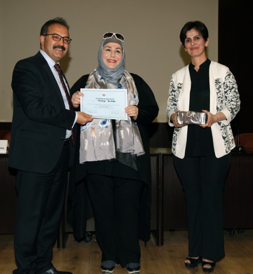 Sempozyumun sonunda Mehtap Yılmaz’a eşi GAÜN Rektörü Prof. Dr. Ali Gür ve Sağlık Bilimleri Fakültesi Dekan Yardımcısı Doç. Dr. Zeynep Güngörmez anısına hediye takdim edildi.