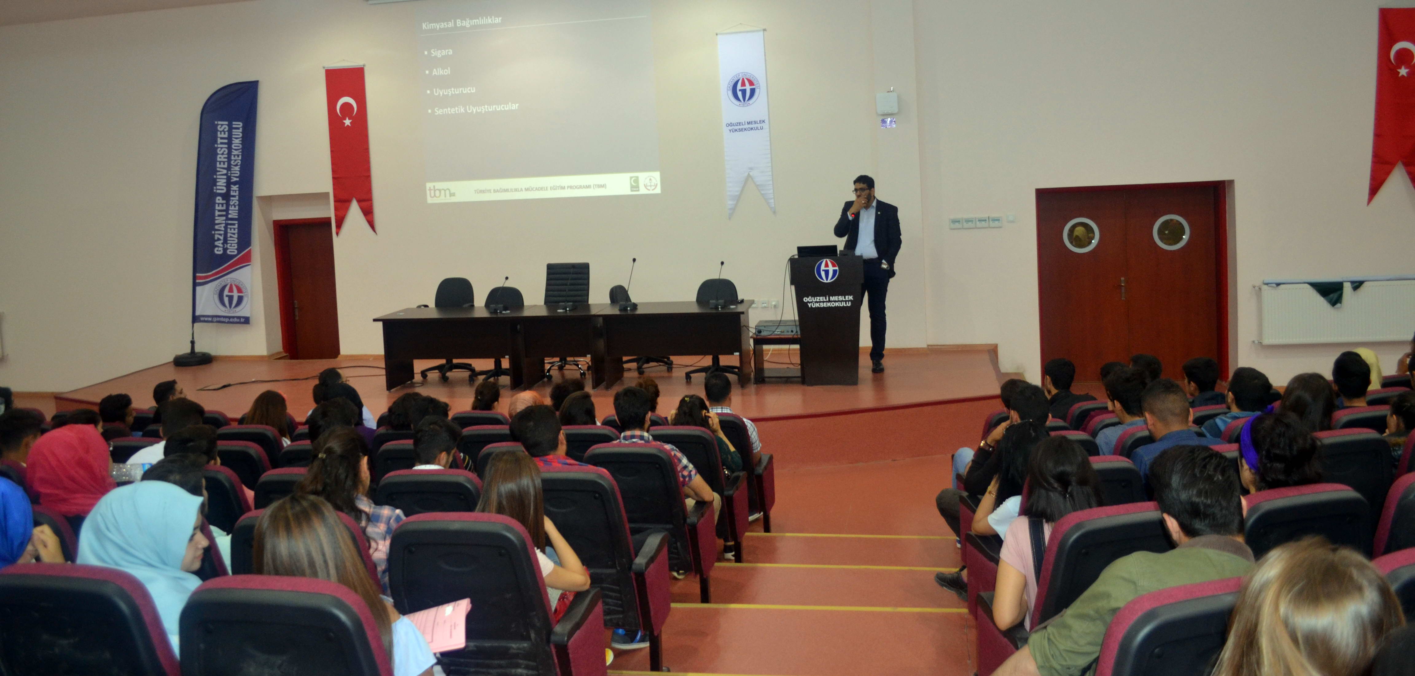 Gaziantep Üniversitesi (GAÜN) Oğuzeli Meslek Yüksekokulunda Yeşilay Derneği Gaziantep Temsilcisi ve GAÜN Teknik Bilimler Meslek Yüksekokulu Öğr. Gör. Fatih Tamer tarafından Tütün ve Alkol Bağımlılığı ile Mücadele konferansı verildi.