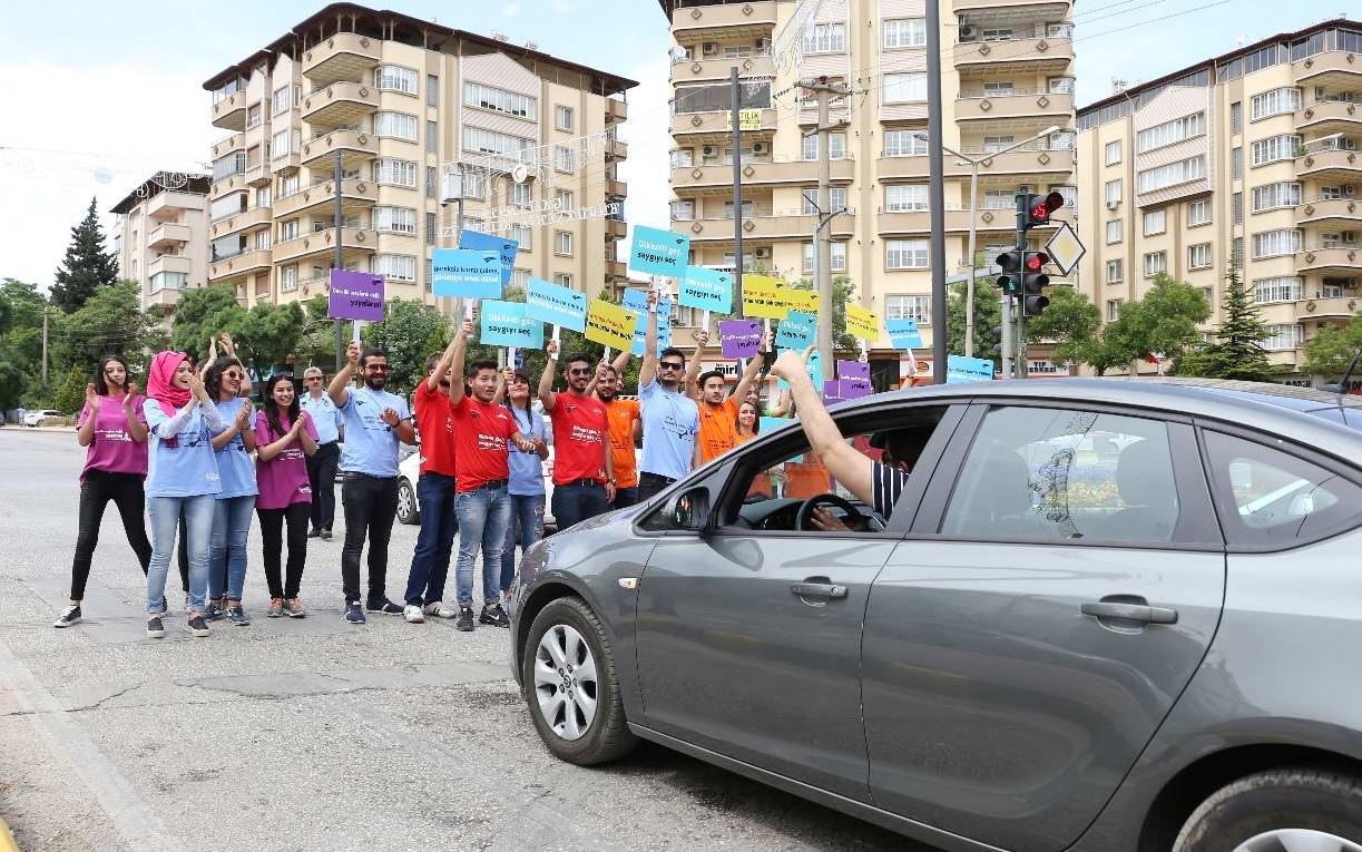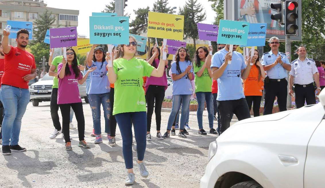 Üzerlerinde trafikle ilgili mesajların yer aldığı renkli tişörtler ve taşıdıkları pankartlarla yaya geçitlerinde “Dikkatli Geç Saygıyı Seç”, “Öncelik Araçların Değil Yayaların”, “Kırmızıda Geçti Ama Artık Çok Geçti”, “Gereksiz Korna Çalma, Gürültüye Ortak Olma”, “Aşırı Hıza Dikkat, Kaybolan Şey Hayat” gibi sloganlar atan öğrenciler, trafikte saygının önemine dikkat çekerken, halk tarafından da ilgiyle karşılandılar.