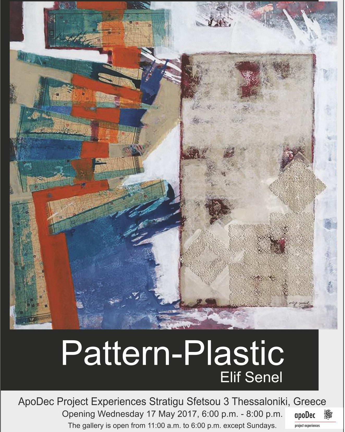 Gaziantep Üniversitesi (GAÜN) Güzel Sanatlar Fakültesi Dekan Yardımcısı Doç. Dr. Elif Şenel, “Pattern-Plastic” isimli kişisel resim sergisini Yunanistan’ın Selanik şehrinde bulunan, yaratıcılık esaslı tüm kültürel aktivitelere açık bir platform olan kültür stüdyosu Apodec’te açtı.