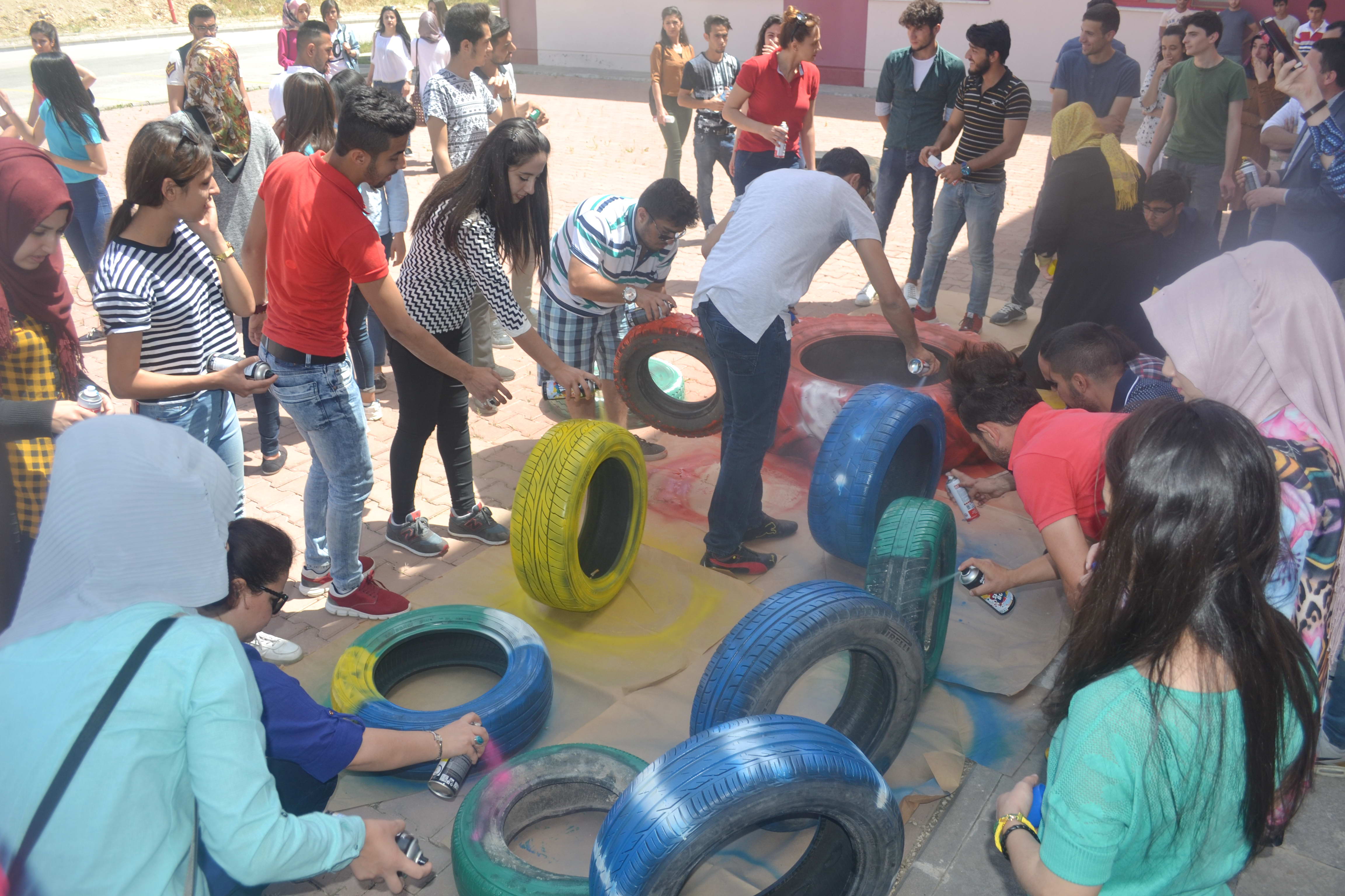 Geri dönüşümü desteklemek amacıyla hazırlanan “Renkli Lastikler” projesi kapsamında gerçekleştirilen; Proje Yürütücüleri Yrd. Doç. Dr. Aslı Özpolat, Öğr. Gör. Dr. Filiz Çayırağası, Öğr. Gör. Günbala Güven, Öğr. Gör. Derya Taşdemir tarafından organize edilen etkinlik Oğuzeli MYO kampüsünde renkli ve eğlenceli görüntülere sahne oldu.