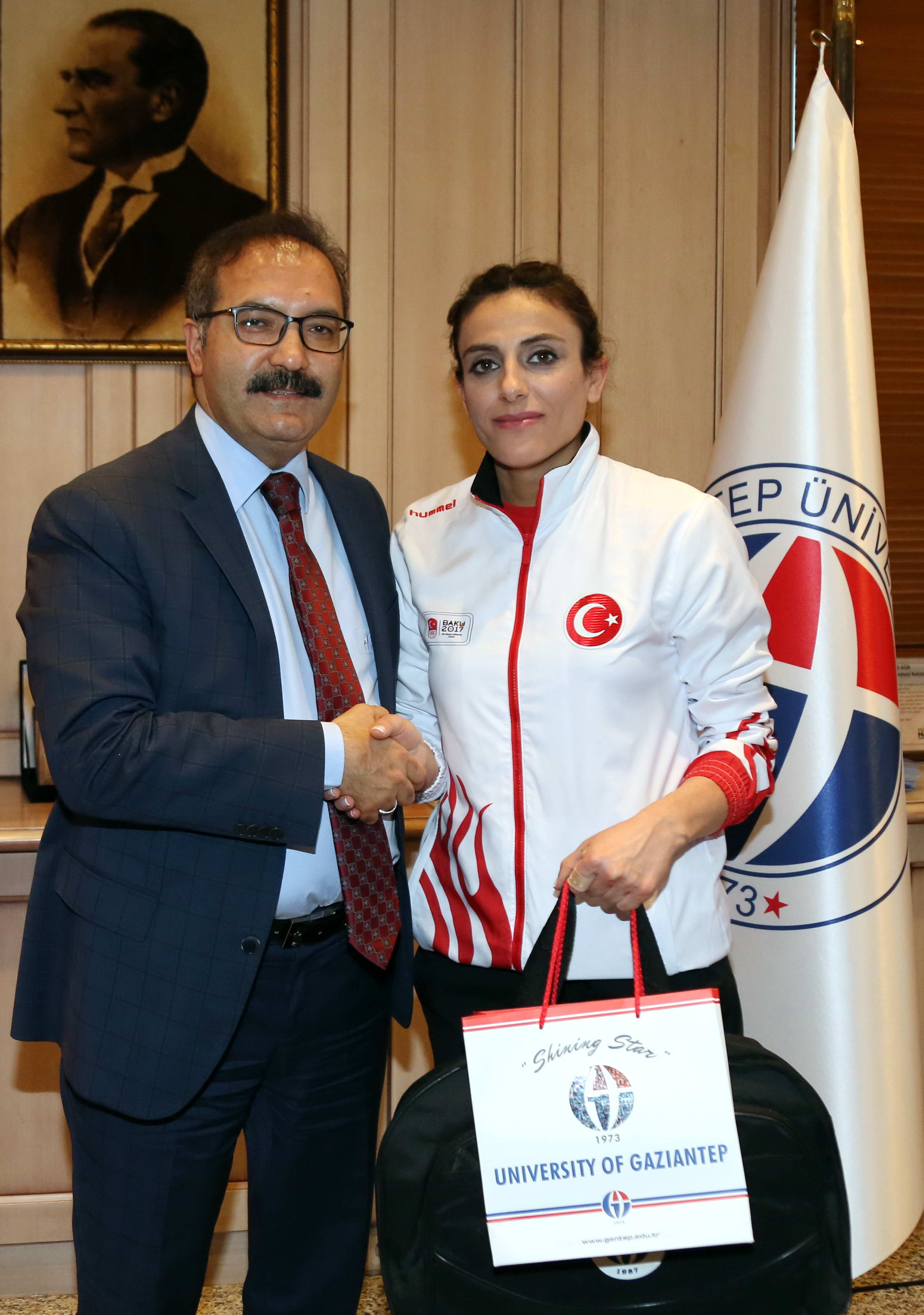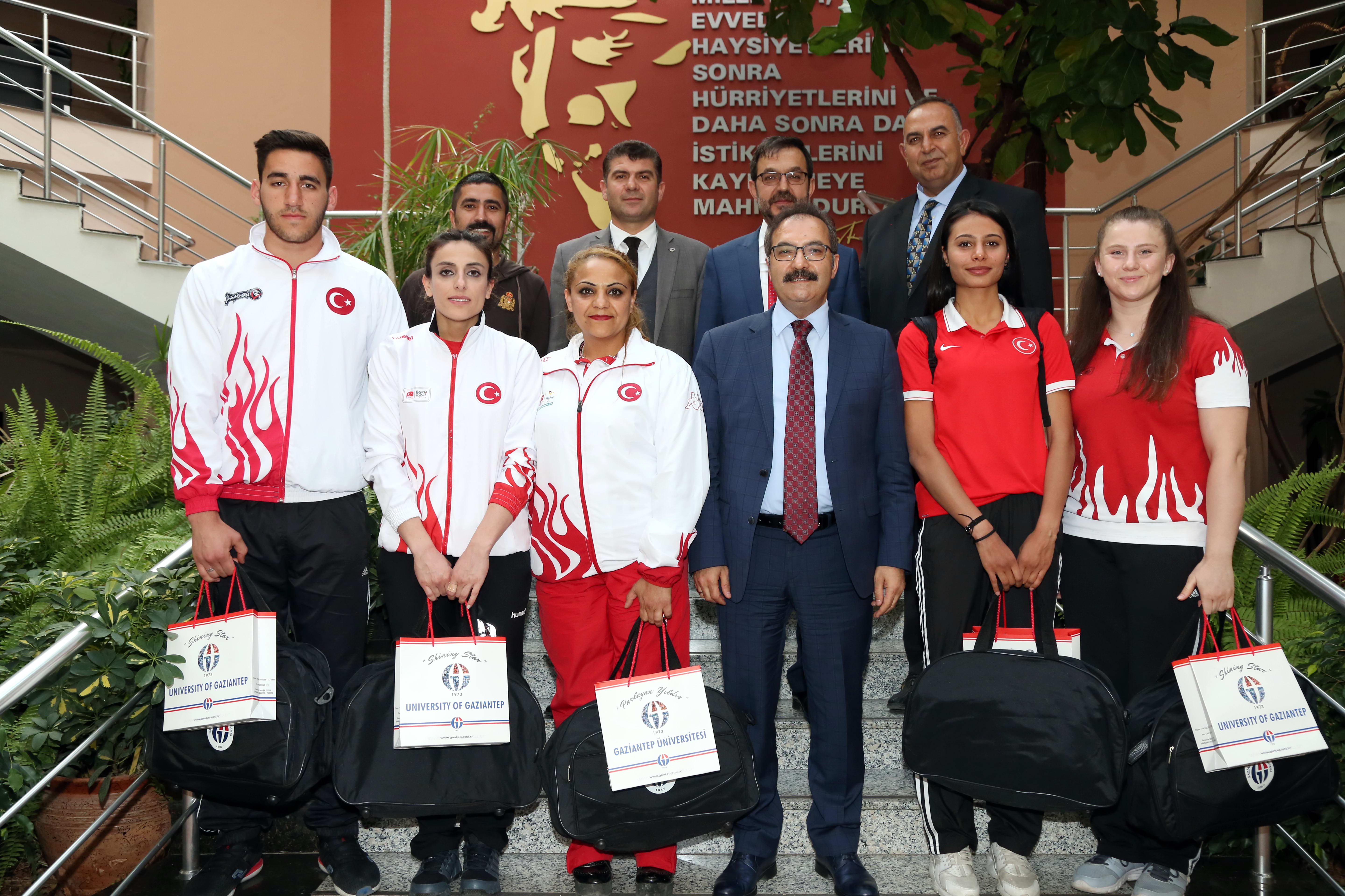 Belarus’ta yapılan Muay – Thai Dünya Şampiyonası’nda 91 kiloda dünya şampiyonu olan Serdar Yiğit Eroğlu, 4. İslam Dayanışma Oyunları’nda 72. Kiloda ikinci olan Jüdocu Çağrı Güzelsoy, aynı yarışmada halterde birinci olan Bediha Tunadağ, Dünya Taekwando Federasyonu Başkanlık Kupası’nda 3. Olan Zehra Döşüçukur ile Bedensel Engelliler Yarışması’nda 68. Kilodu Türkiye Şampiyonu olan Dilfiroz Kuzdağı, Rektör Gür’ü makamında ziyaret ederek, yarışmalara hazırlanmaları sırasında kendilerine gösterilen ilgi için teşekkür etti. Rektör Prof. Dr. Ali Gür de başarılı sporcuları kutlayarak, “İyi bir üniversite sadece eğitim başarısıyla değil, sosyal, kültürel ve sportif başarılarıyla da adından söz ettiren üniversitedir. Bu nedenle sizler bizim yüz akımızsınız. Başarılarınız devam ettikçe sizlere her konuda destek vermeye devam edeceğiz” dedi. Gür, başarılı sporculara çeşitli hediyeler verdi.