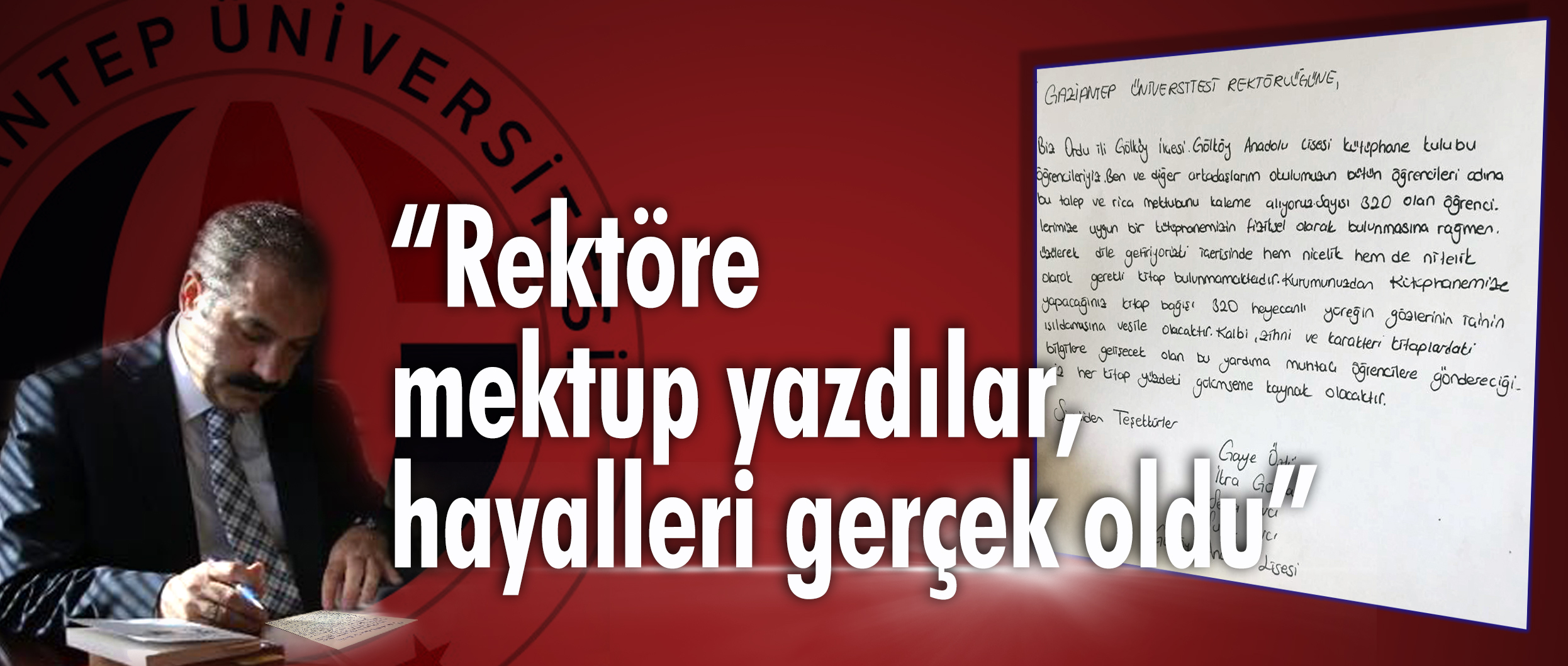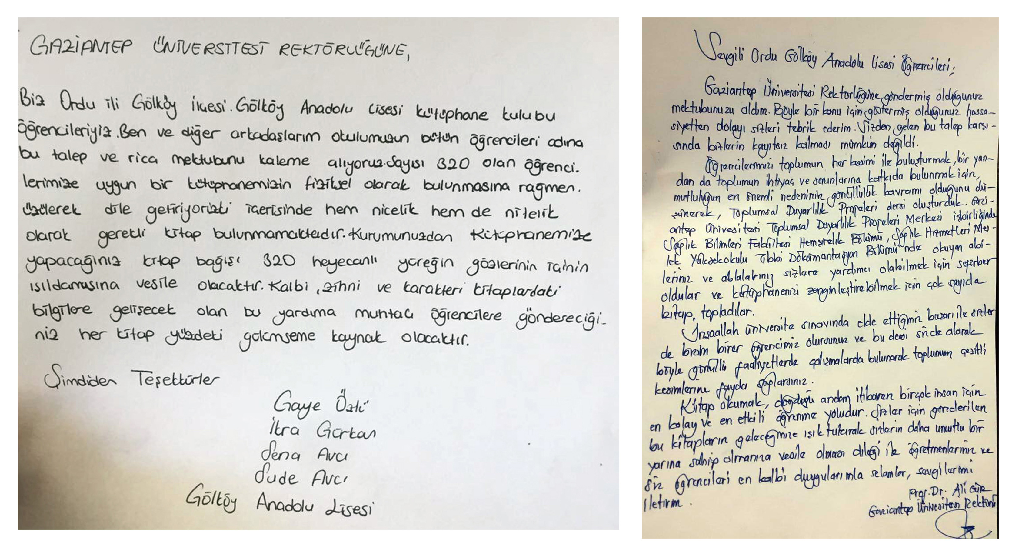 Ordu’nun Gölköy İlçesi Anadolu Lisesi öğrencilerinin kütüphanelerindeki kitap eksikliğini gidermek için Gaziantep Üniversitesi Rektörü Prof. Dr. Ali Gür’e yazdıkları duygu dolu mektup, hayallerini gerçeğe dönüştürdü.