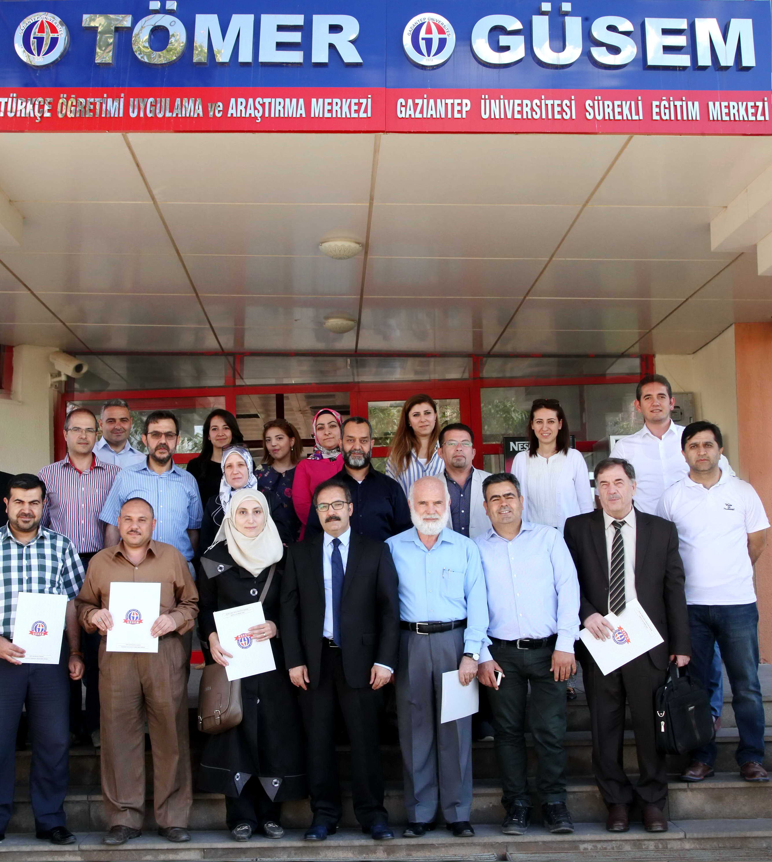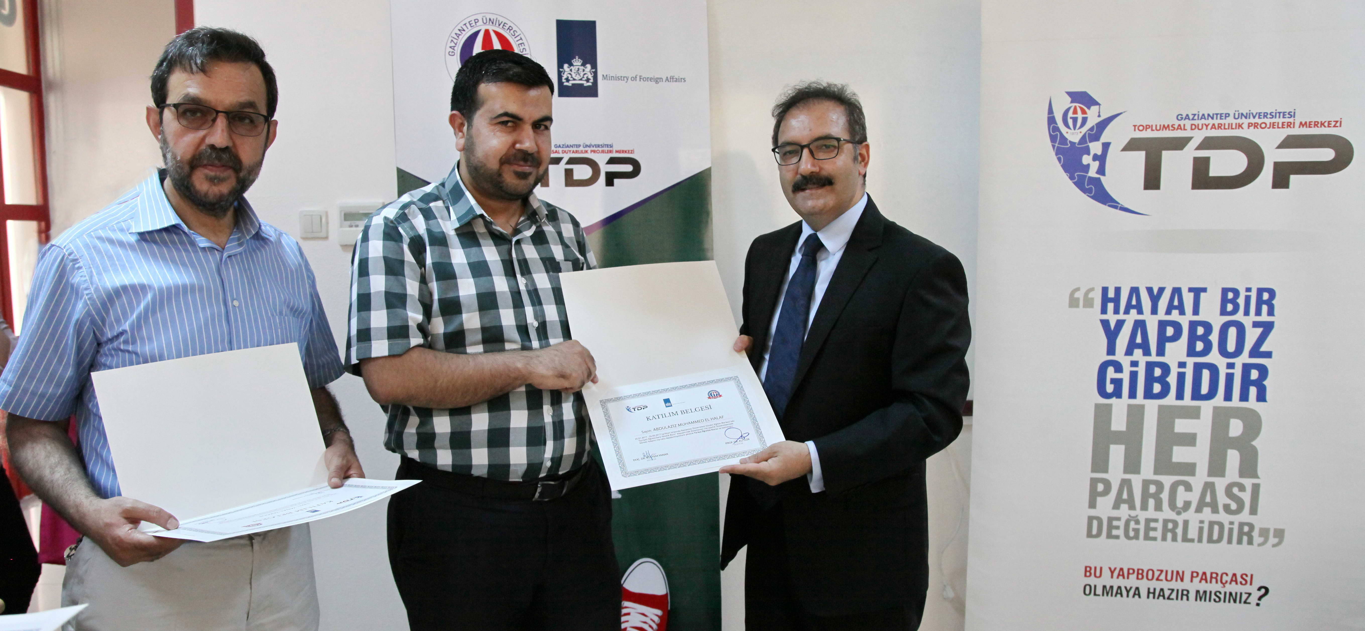 Toplumsal Duyarlılık Proje Merkezi ve Gaziantep Üniversitesi Sürekli Eğitim Merkezi’nin (GÜSEM) ortaklığıyla düzenlenen,144 saatlik Türkçe eğitimini tamamlayan Suriyeli 3 profesör ile 7 yardımcı doçentin sertifikalarını Rektör Prof. Dr. Ali Gür ve Rektör Yardımcısı Prof. Dr. Hilmi Bayraktar verdi. Sertifika töreninde konuşan TDP Merkezi Sorumlusu Simge Akbaş, projenin Hollanda Dışişleri Bakanlığı ortaklığıyla yaşama geçirildiğini belirterek, “Suriyeli hocalarımızın Türkçe eğitimlerinin ardından öğrencilerimize daha faydalı olacaklarına inanıyorum” dedi. GÜSEM Müdürü Doç. Dr. Rüstem Yanar ise, kursiyer akademisyenlerin A1 VE A2 seviyesini tamamladıklarını vurgulayarak, “Kurslarımızdaki desteklerinden dolayı Gaziantep Üniversitesi Türkçe Öğretim Merkezi’ne (TÖMER) teşekkür ederiz” diye konuştu.