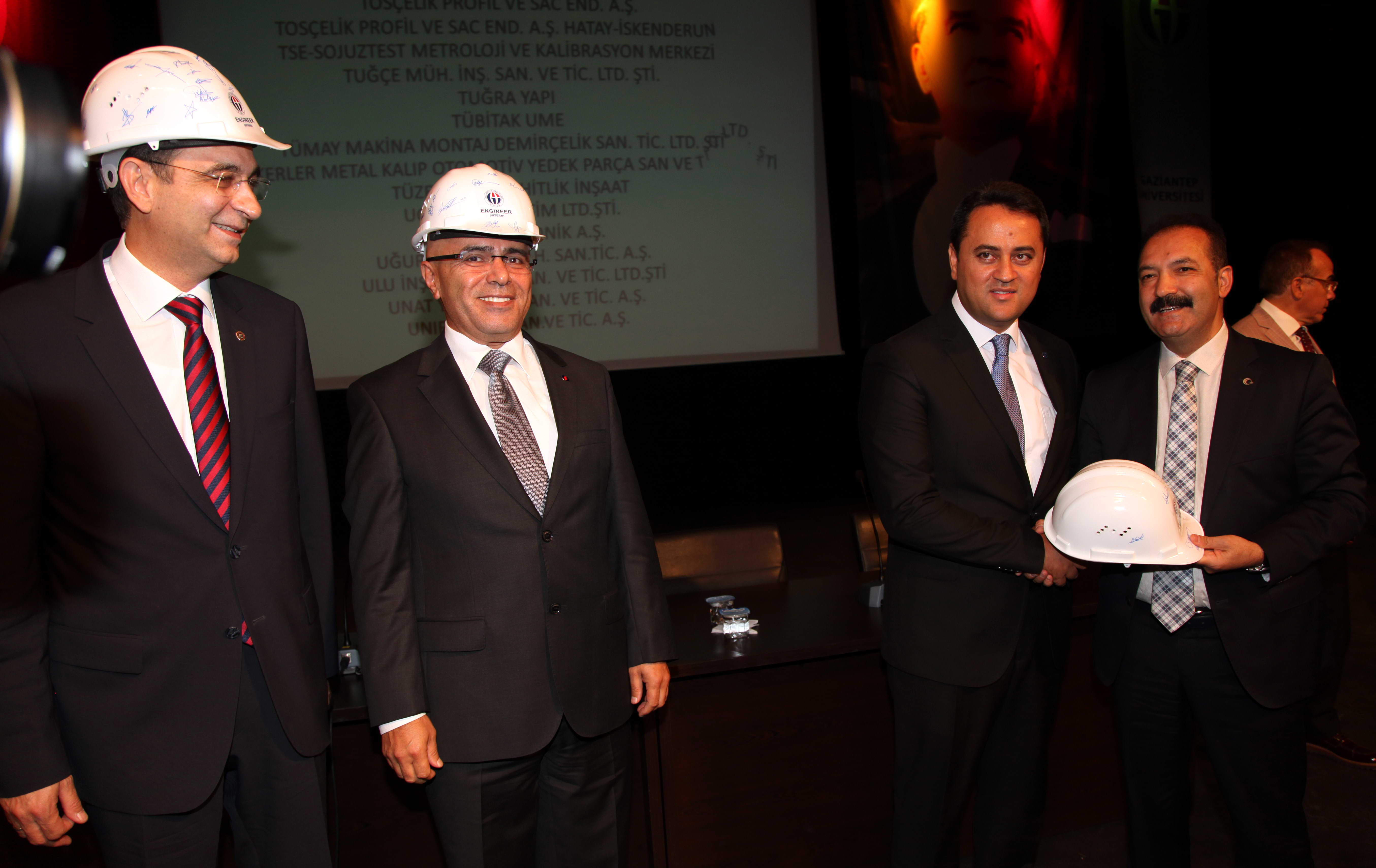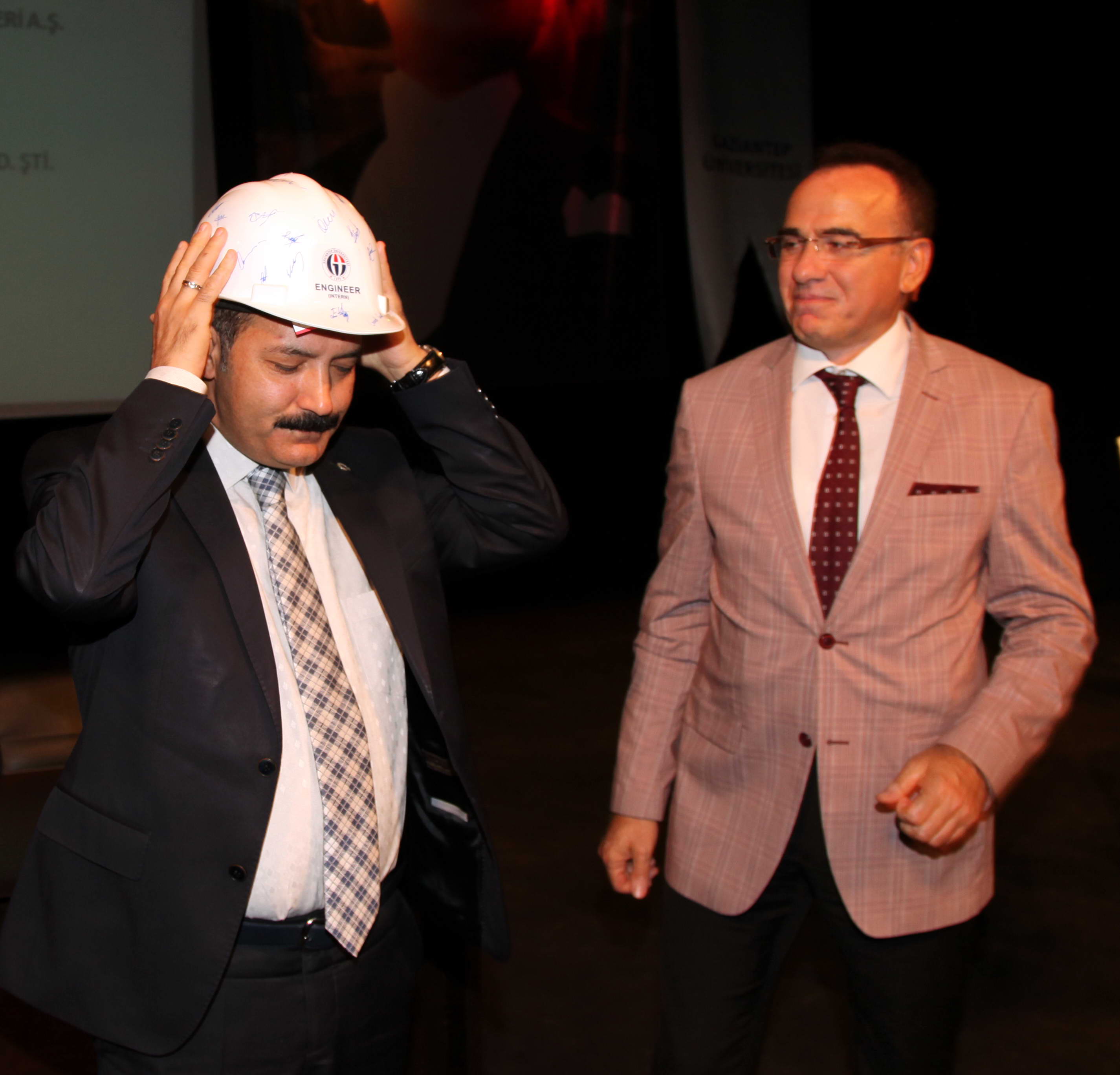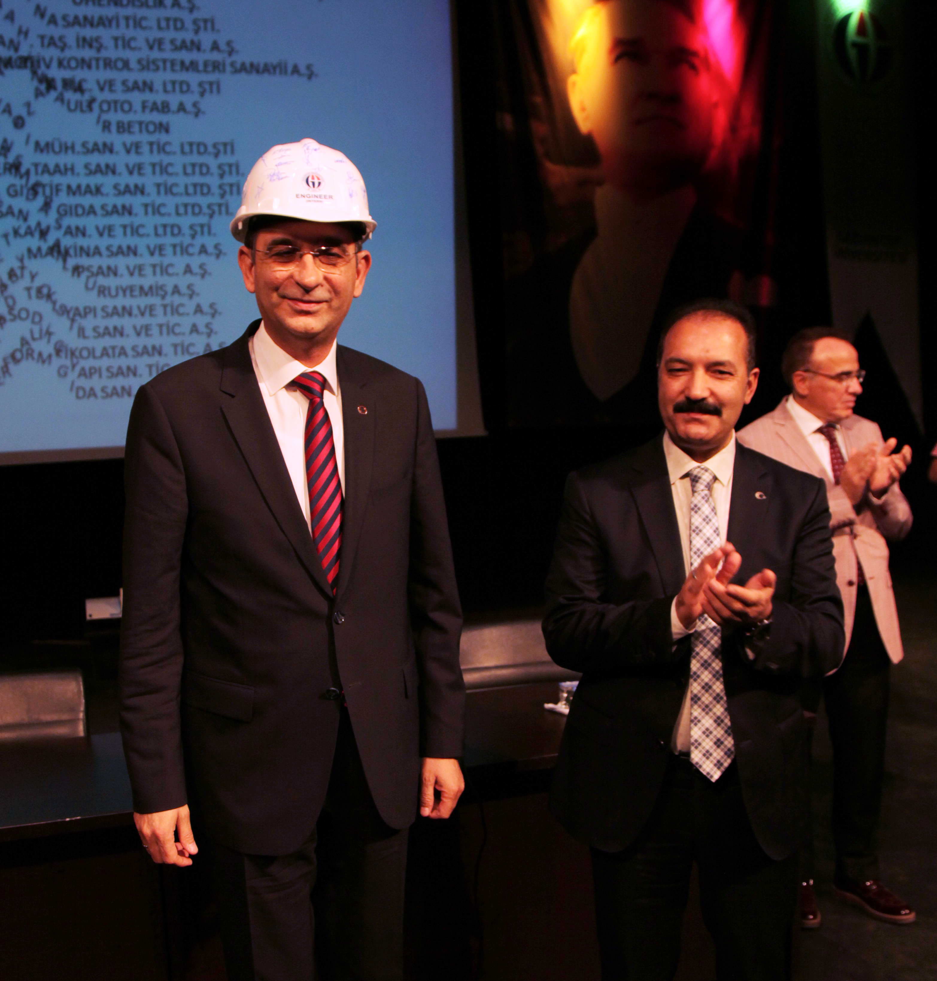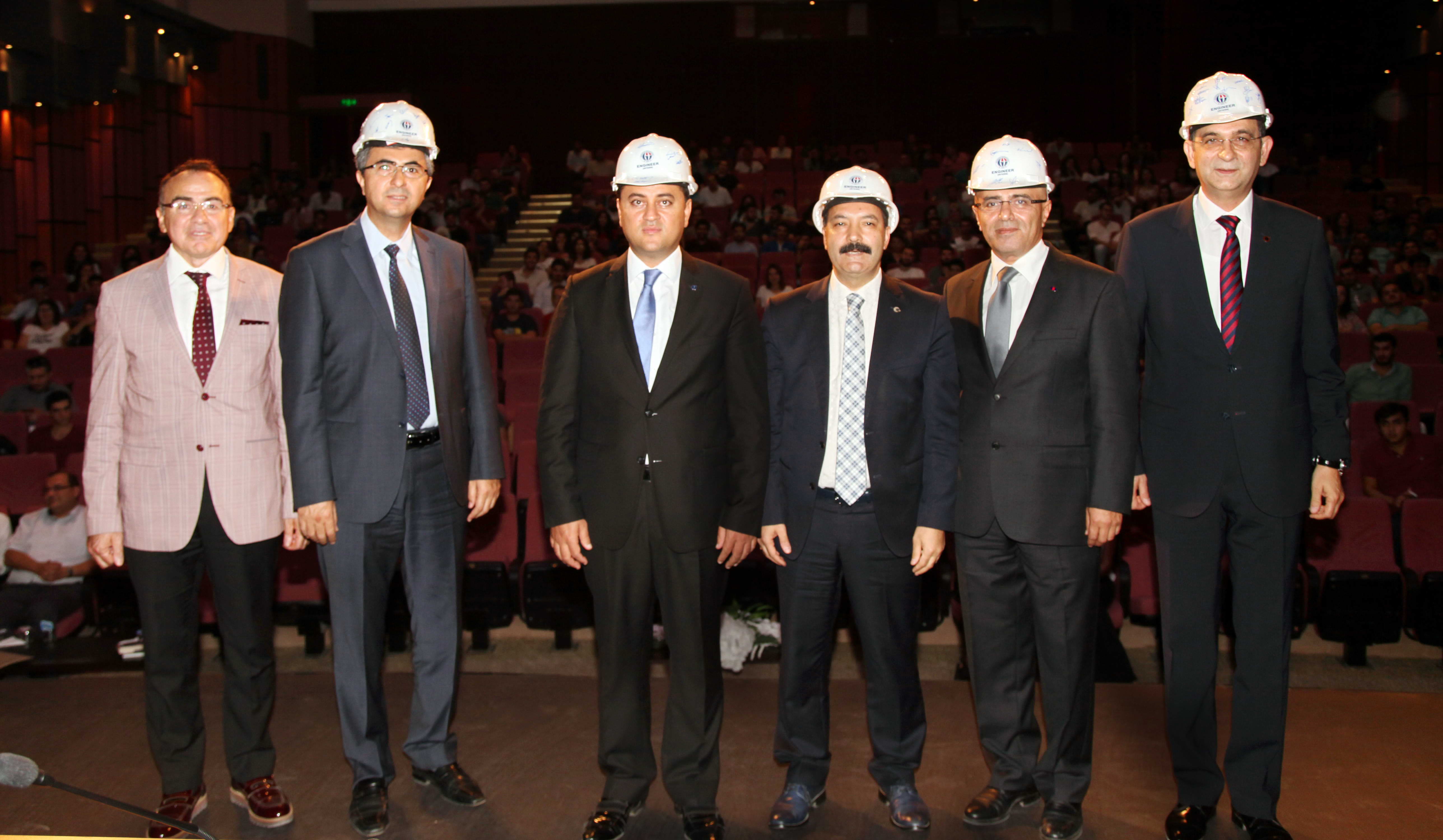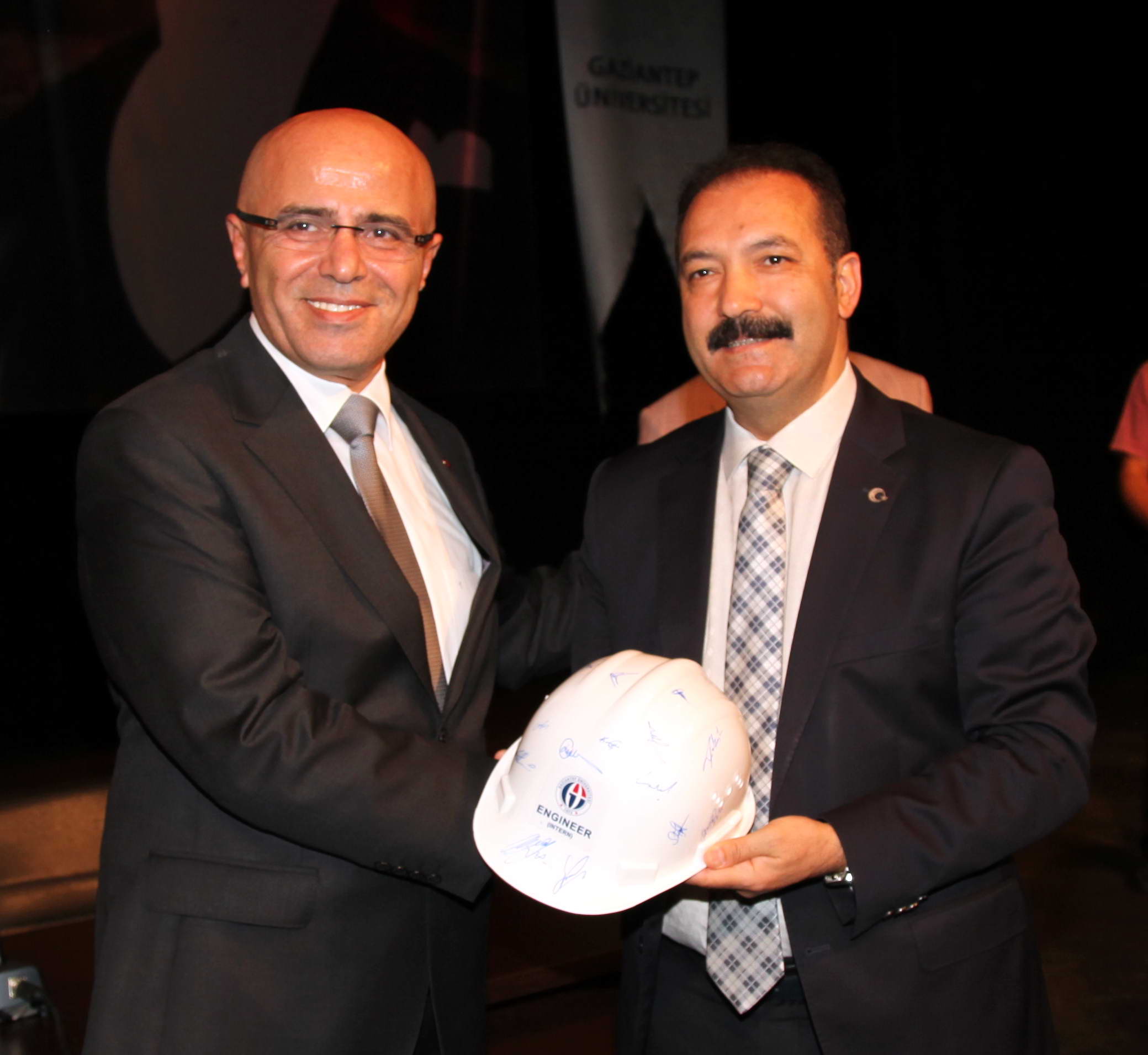 Konuşmaların ardından intörn mühendisler tarafından imzalanan baret Mühendislik Fakültesi Dekanı Prof. Dr. Mustafa Günal tarafından Prof. Dr. Ali Gür’e takdim edilirken, Rektör Gür de diğer katılımcılara baretlerini verdi.
