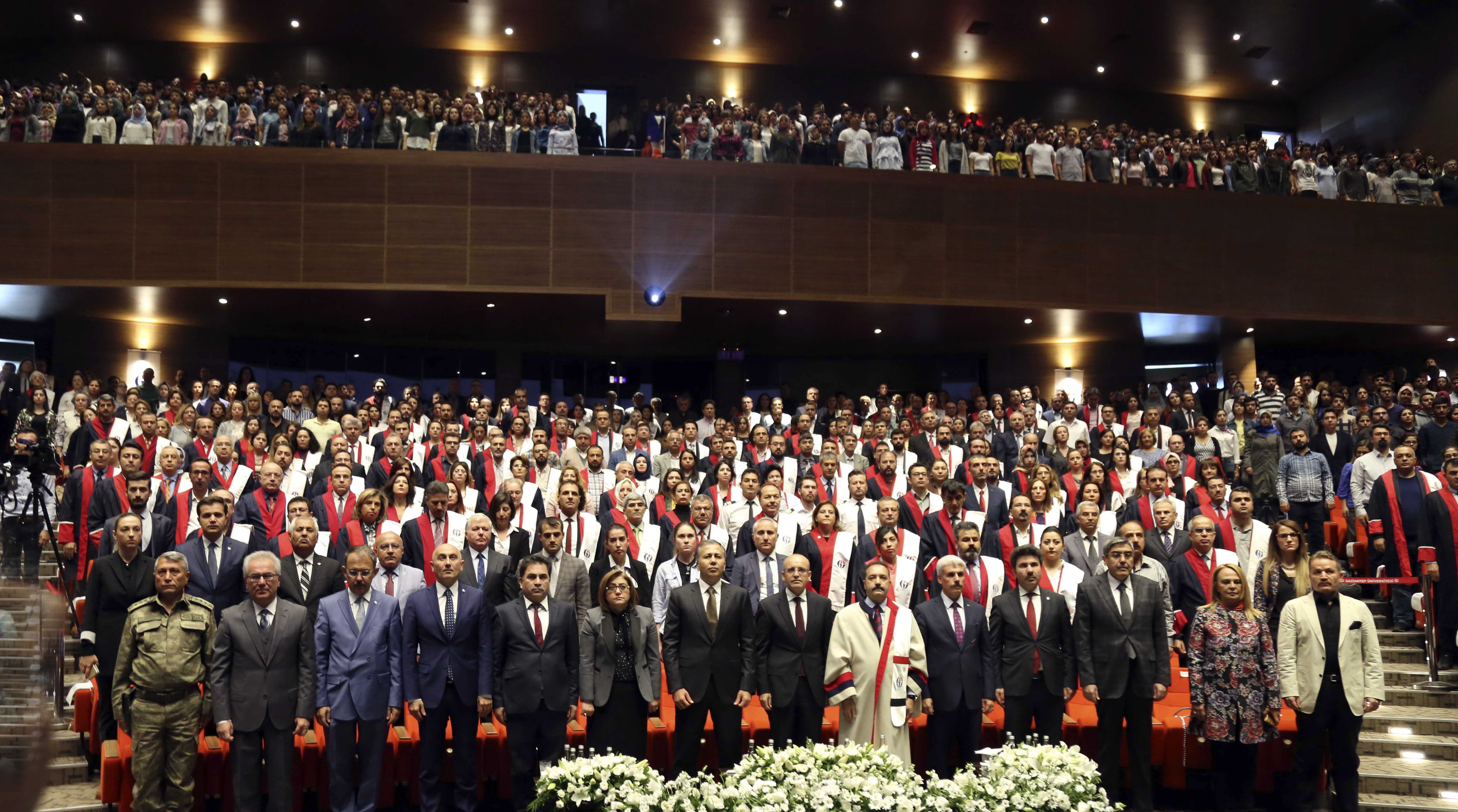 Bu süreçte Gaziantep Üniversitesi’nin de bir bilim yuvası olarak üstüne düşeni yerine getirdiğini kaydeden Rektör Prof. Dr. Ali Gür, sözlerini şöyle sürdürdü: “Her kurum ve her birey kendi üzerine düşen görevi yapıyor ve yapacaktır. Bu coğrafya kolay bir coğrafya değil. Yer üstü ve yer altı zenginliklerinden dolayı sürekli hakimiyet alanı olmaya çalışılmış, dönem dönem işgallere uğramışsa da asla bu coğrafyada var olan milletimiz bunlara boyun eğmemiştir. Biz, koca bir çınarız. Nerdeyse 50 yıllık ve tarihten gelen köklerimizle kurumsal kimliğimizi muhafaza ediyoruz. 53 bin öğrencisiyle. Dile kolay. Aynı zamanda Türkiye’nin farklı coğrafyalarından gelen öğrencilerle birlikte. Dünya coğrafyasından, bütün kıtalardan 108 ülkenin evlatları bizim bağrımızda huzur buluyorlar. Bizi tercih ediyorlar ve dezavantajlara rağmen bu bölgede huzur içerisinde yaşayarak eğitimlerini tamamlayıp ülkelerine dönüyorlar. Bizim hedefimiz birkaç yıl içerisinde 140 ülkeyi burada barındırmaktır. Çünkü bu coğrafyanın misafirperverliğini, kadirşinaslığını bildikten gördükten sonra bu coğrafyanın gelecek şekillenmesinde evlatlarımız her zaman gerekli olan temeli atacaklar.”