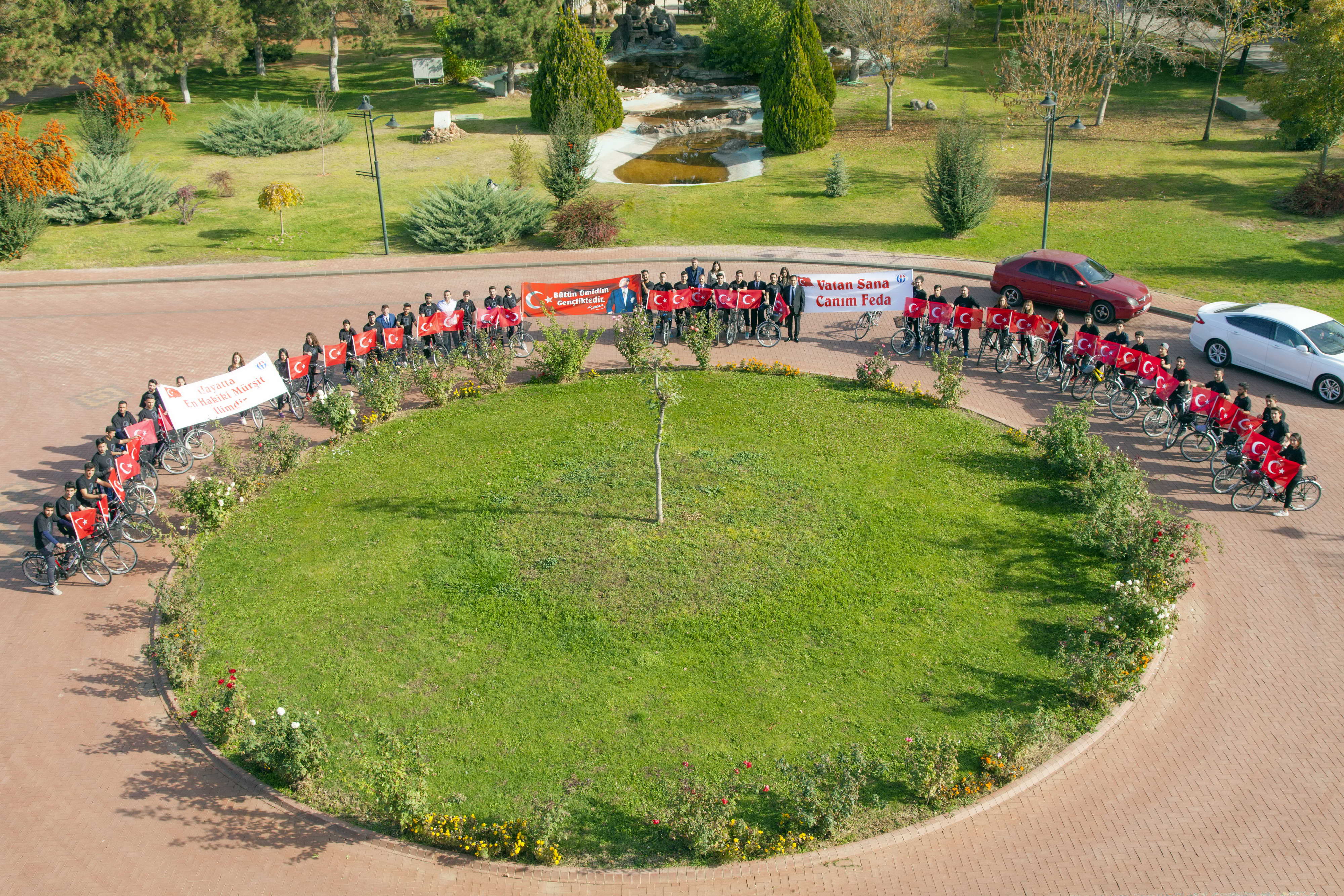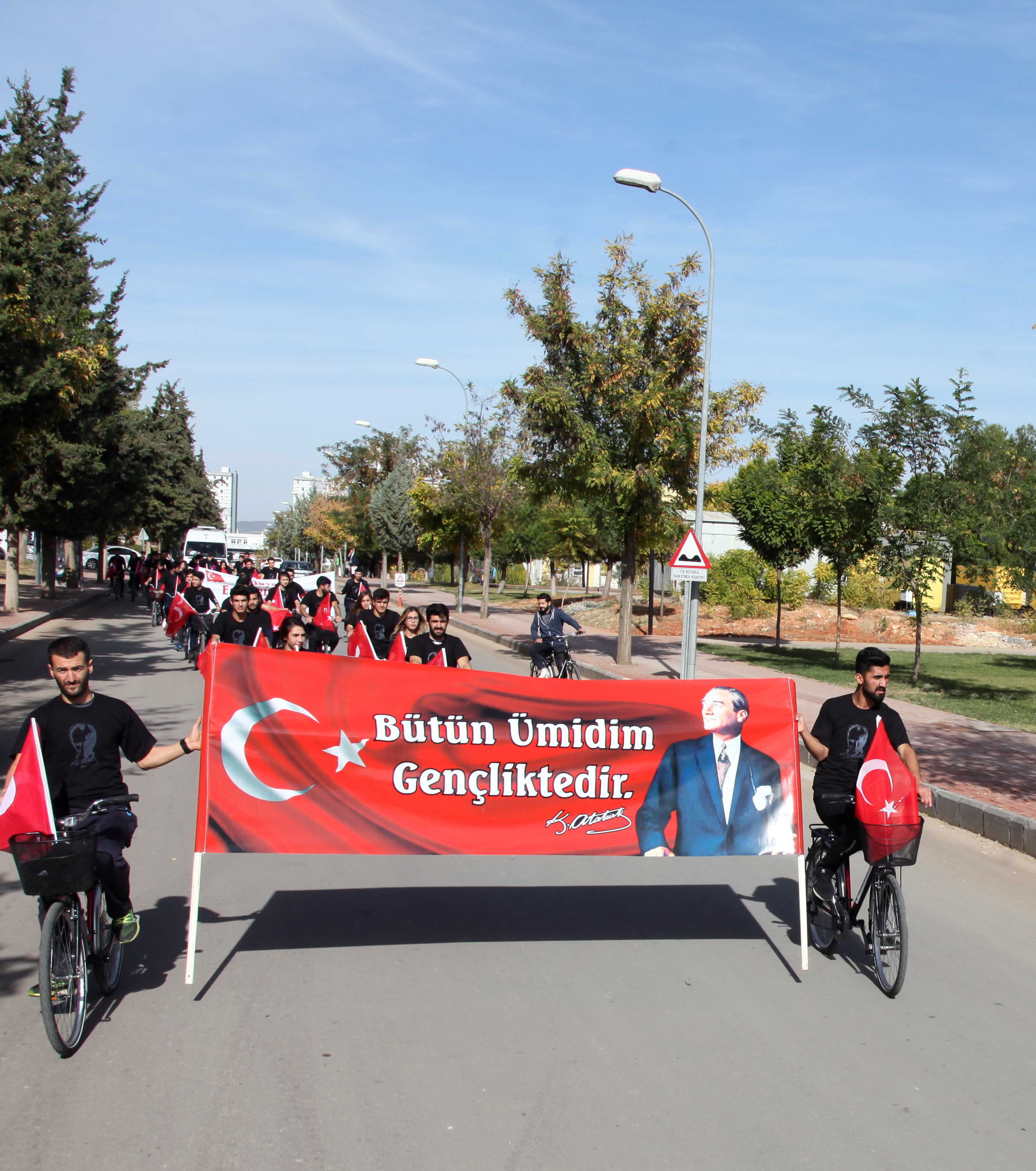 GAÜN Beden Eğitimi ve Spor Yüksekokulu Bisiklet Takımı öğrencileri kampuste yaptıkları tur sonrasında, Rektörlük binası önüne gelerek bisiklet gösterisi yaptı. Rektör Prof. Dr. Gür, 10 Kasım’larda hüzünle birlikte aynı zamanda Mustafa Kemal Atatürk’ü yaptıklarıyla muasır medeniyet seviyesine ulaşmak için teminat olarak gösterdiği gençlikle birlikte hareket ettiklerini belirterek, “Sabah bir çelenk koyma, arkasından anma, konferans, resim sergisi ve geleneksel hale getirdiğimiz Atatürk koşusunu gerçekleştirdik. Bugünü doya doya aynı zamanda da dolu programlarla geçiriyoruz. Gaziantep Üniversitesi her zaman dolu programlarıyla katkı vermeye hazır. Gençliği işin içerisine katarak güzel programlarla devam ettireceğiz” diye konuştu.