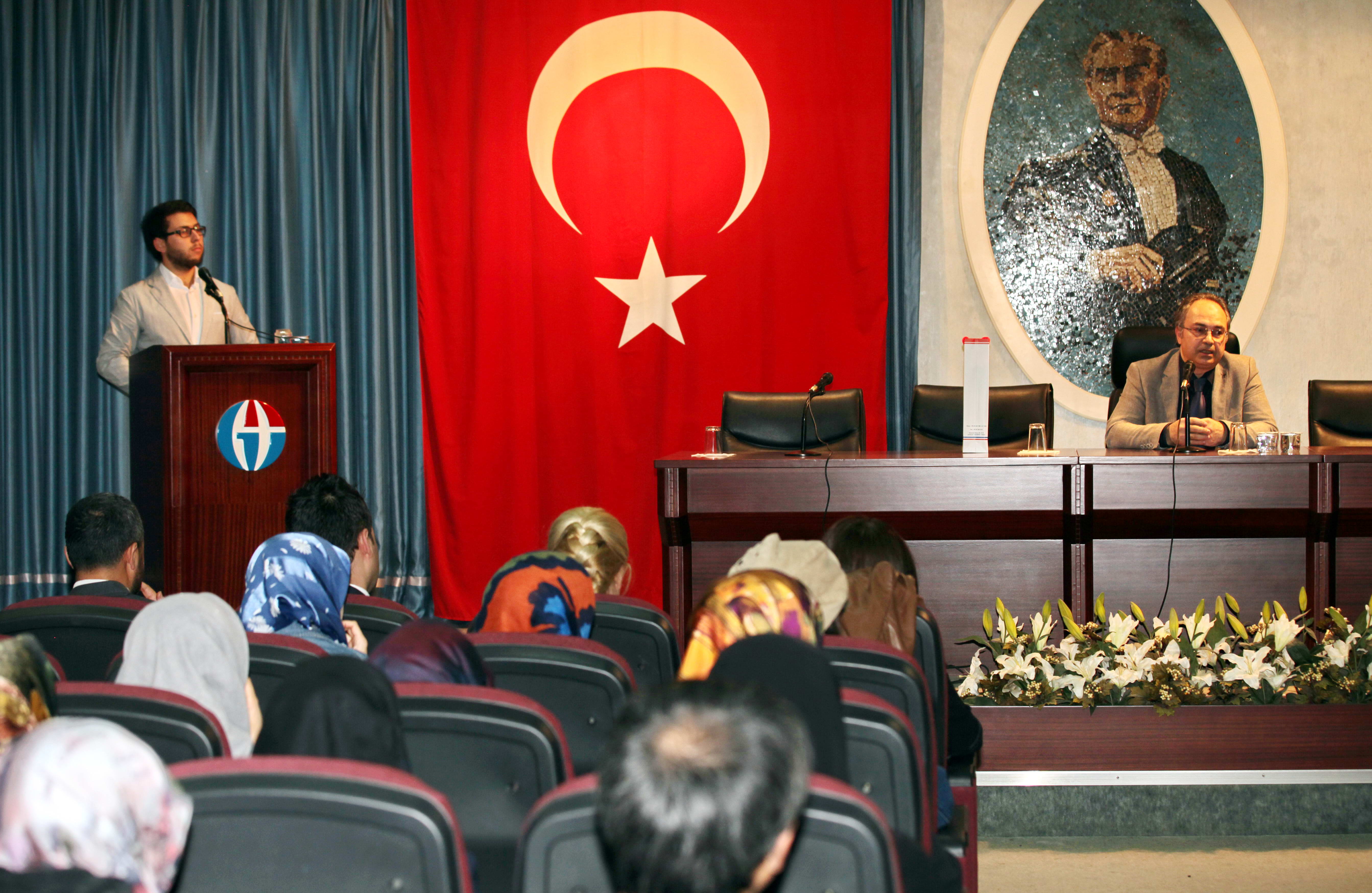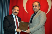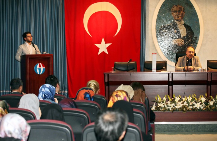 GAÜN Fen Edebiyat Fakültesi Ömer Asım Aksoy Konferans Salonu’nda düzenlenen konferansın sonunda, Yazar Lütfi Bergen’e teşekkür eden GAÜN Rektörü Prof. Dr. Ali Gür, Halep’te Adım Adım Osmanlı’nın İzinde Kitabı’nı hediye etti.