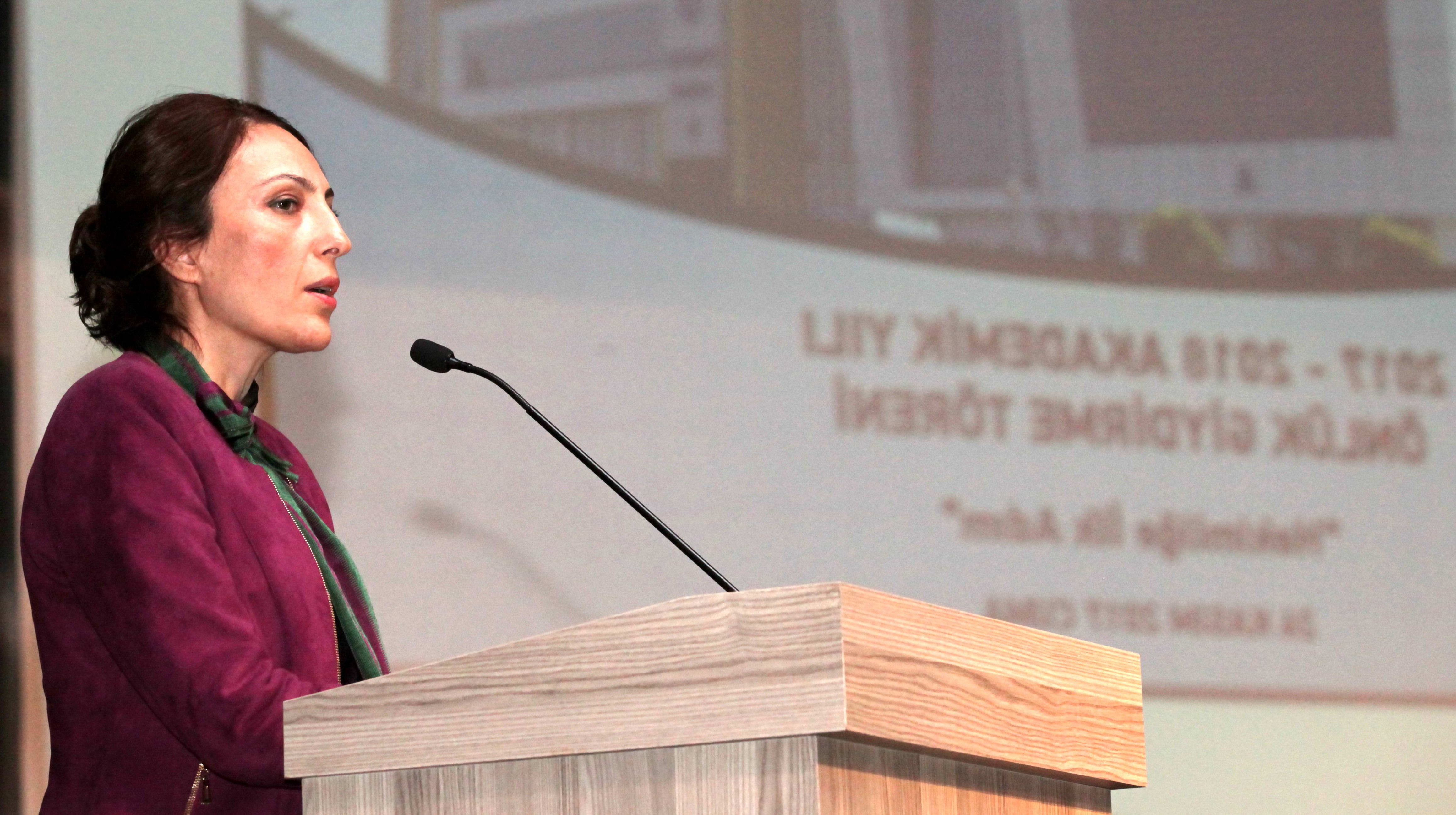 Konuşmasında töreni izleyen öğrenci ailelerine seslenen Prof. Dr. Gür, “Gerçekten iyi evlatlar yetiştirdiniz. Akranlarına göre fark atan ve aynı zamanda toplum tarafından da benimsenen bir meslek sahibi olarak bizlerin eline teslim ettiniz. Bu yüzden çocuklarınızla ne kadar gurur duyarsanız azdır” dedi. Prof. Dr. Gür, öğretim elemanlarına ise, “Elinize işlenmeye müsait harika bir pırlanta, elmas gibi çocuklar teslim edildi. Lütfen onları en güzel şekilde işleyin, bezeyin ve tekrar topluma, vatana, millete saygılı, inançlarla bezenmiş vatan sevdasından uzak durmayan gençler olarak tekrar topluma kazandıralım” şeklinde konuştu.