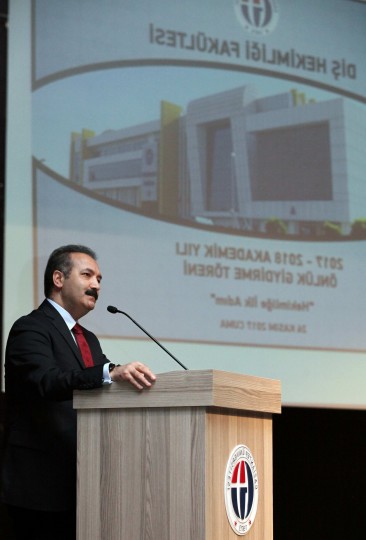 Törenin açılışında konuşan GAÜN Rektörü Prof. Dr. Ali Gür, öğrencilerin büyük bir yarışma içerisinde çalışarak, emeklerinin karşılığında Türkiye’nin güzide üniversitelerinden birinde iyi bir bölüm olarak Diş Hekimliği Fakültesi’ne geldikleri belirtti. Prof. Dr. Gür, “Daha fazla yorulacaksınız. Şimdiye kadar ki çalışmalarınız ideali belirlemeydi bundan sonra da idealinizi gerçekleştirmek için gecenizi gündüzünüze katma zamanı. Kolay bir meslek değil. Birkaç açıdan kolay değil çünkü insan sağlığıyla uğraşıyorsunuz. En küçük bir ihmaliniz telafisi mümkün olmayan zararlara yol açabilir. İkincisi muhataplarınız ağrılı, sancılı. Gece gündüz demeden kapınıza gelebilirler. Onlara çok büyük bir özveriyle sabır göstermeniz gerekiyor. Sizin ağrınız olabilir ama işlem yaparken o ağrınızı unutacaksınız. Hastalarınız belki onlara yaptığınız iyiliğin farkına varmayacak. Belki sizi incitecekler ama bu mesleğin de böyle zor bir yanı var. Üçüncüsü de bir taraftan teorik derslerle diğer taraftan pratik uygulamalarla geceniz gündüzünüze karışacak ama bu meslek böyle zaten” diye konuştu.