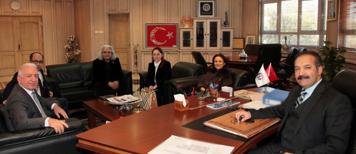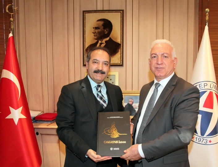 Rektör Prof. Dr. Ali Gür’ü makamında ziyaret eden Fırat Üniversitesi Öğretim Üyesi Prof. Dr. Ahmet Buran’a konferansın sonunda hediye takdim edildi.