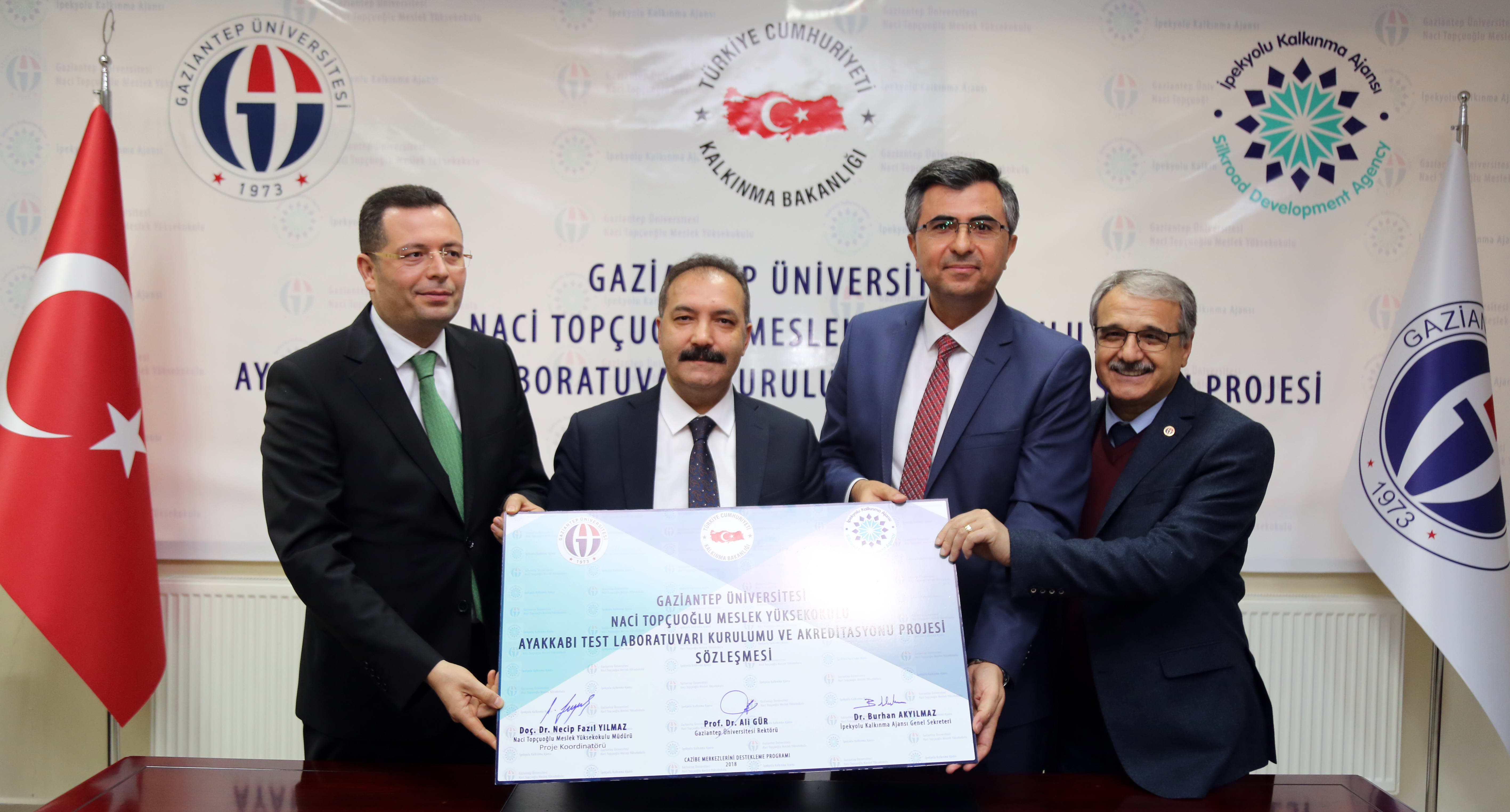 Naci Topçuoğlu Meslek Yüksekokulu’ndaki protokol imza törenine GAÜN Rektörü Prof. Dr. Ali Gür, İpekyolu Kalkınma Ajansı Genel Sekreteri Dr. Burhan Akyılmaz, GAÜN Rektör Yardımcısı Prof. Dr. Metin Bedir ve Naci Topçuoğlu Meslek Yüksek Okulu Müdürü Doç. Dr. Necip Fazıl Yılmaz ile proje yetkilileri ve akademik personel katıldı. 18 ayda tamamlanması planlanan, bölgenin ilk akredite ayakkabı test laboratuvarının Türkiye’nin en önemli ayakkabı üretim merkezlerinden Gaziantep’in yanı sıra Adana, Hatay, Şanlıurfa, Adıyaman, Kahramanmaraş ile diğer Doğu ve Güneydoğu illeri üreticileri de yararlanabilecek. Protokol töreninde konuşan GAÜN Rektörü Prof. Dr. Ali Gür, üniversite-sanayi işbirliğinin önemine bir kez daha vurgu yaparak, “Gaziantep Üniversitesi Naci Topçuoğlu Meslek Yüksekokulu, Türkiye’nin ‘Trimester Eğitim Modeli’ ile eğitim veren, sanayinin içindeki ilk Meslek Yüksekokulu olup, bu model daha sonra diğer üniversitelere de örnek olmuştur. Gaziantep iş dünyasıyla hep kol kola olan Üniversitemiz, başta gazi şehrimiz olmak üzere bölgemize ve ülkemize katma değer yaratacak hizmetler vermeye devam edecektir. Bu kapsamda İpekyolu Kalkınma Ajansı ile imzaladığımız protokolle, Türkiye’nin ayakkabı sektöründe önemli merkezlerinden birisi olan Gaziantep’e akredite ayakkabı test laboratuvarı kuruyoruz. Bu laboratuvardan sadece Gaziantep değil, diğer bölge illeri de yararlanacak. Kurulduğu günden bu yana yenilikçi ve girişimci olma özelliği ile vizyonunu sürekli geliştirerek ön plana çıkan üniversitemiz, Gaziantep’in eğitim-öğretimin yanı sıra, topluma fayda sağlayan çalışmalarını sürdürmeye devam edecek” dedi.