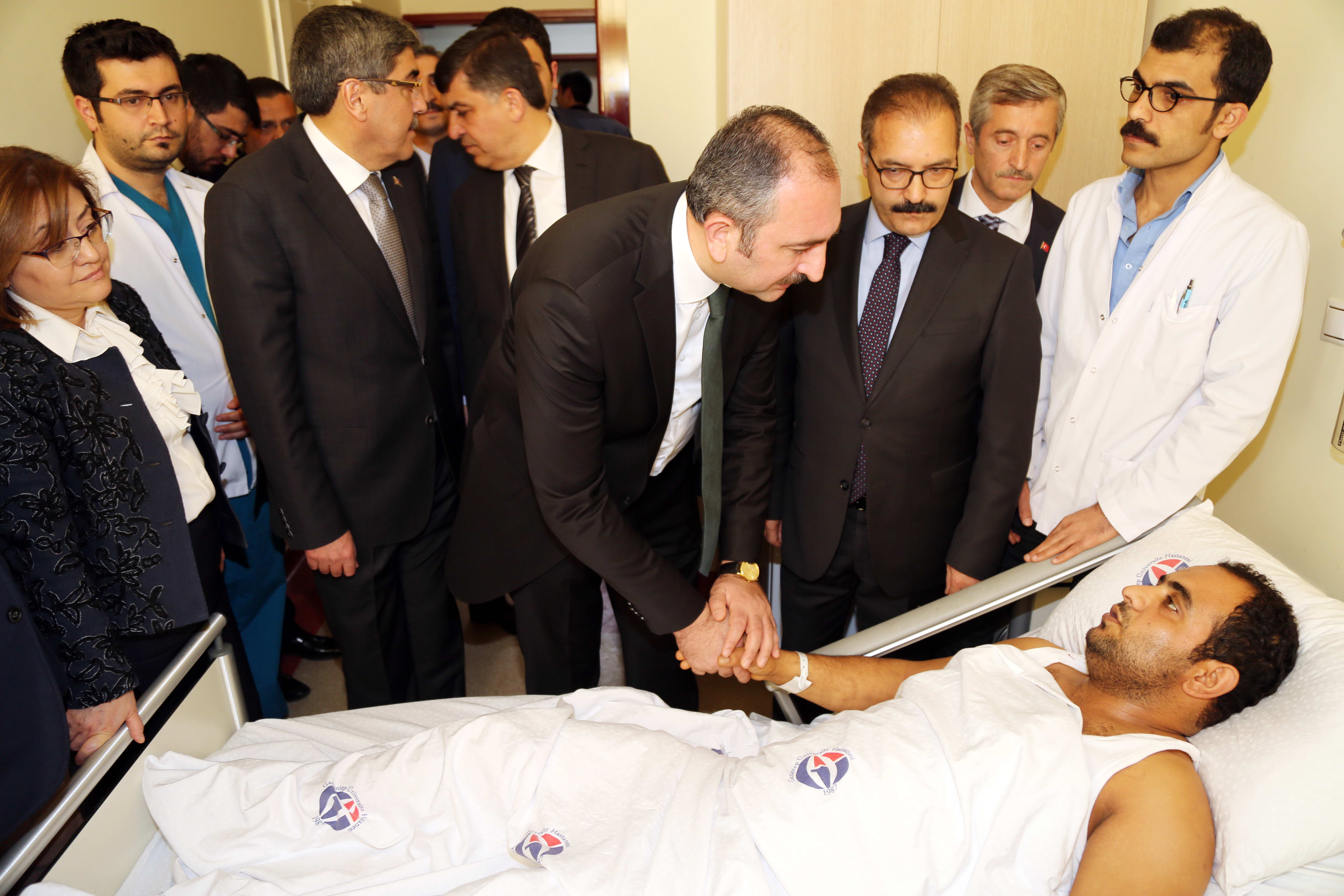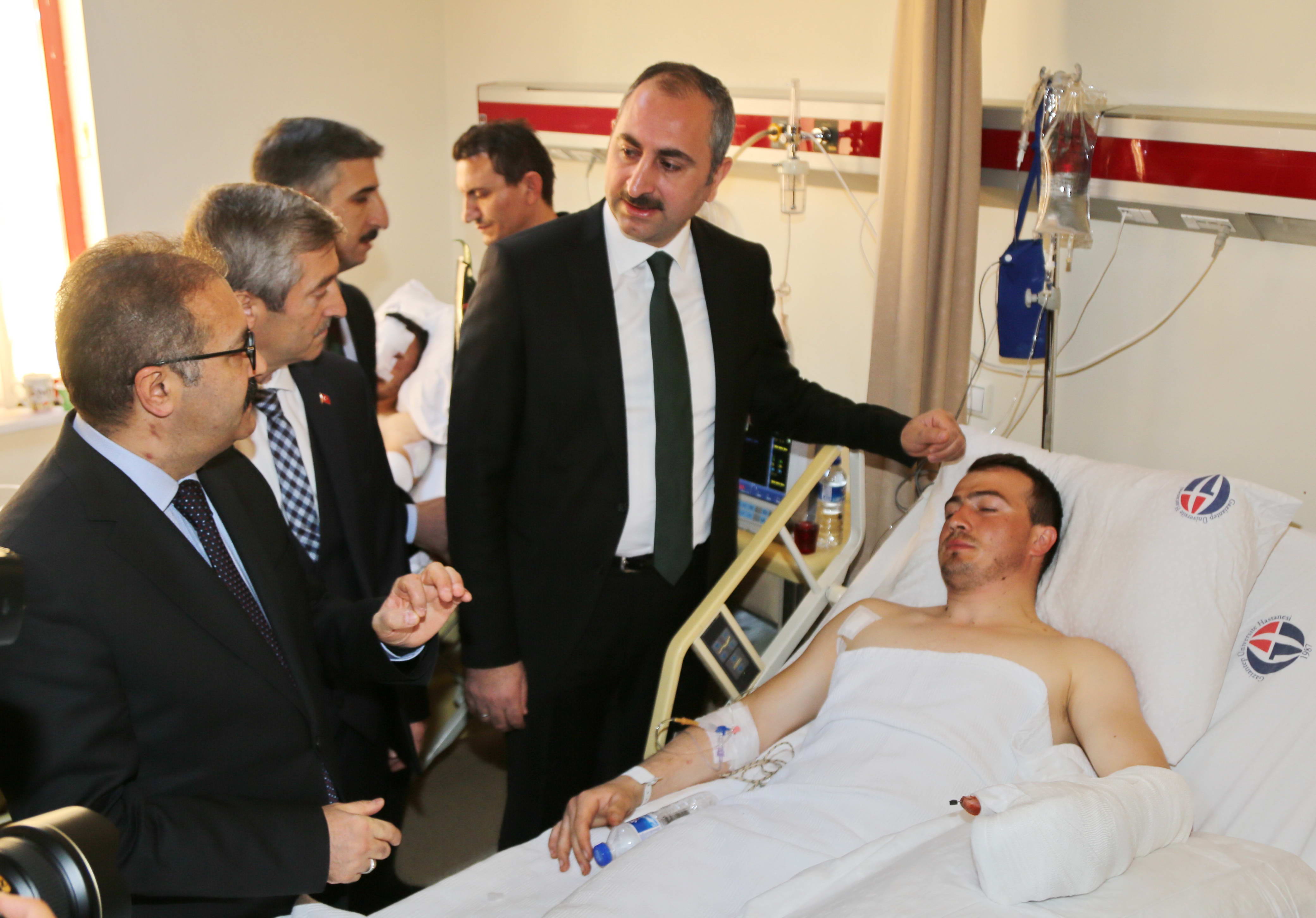 Gaziantep Büyükşehir Belediye Başkanı Fatma Şahin, Ak Parti İl Başkanı Eyyüp Özkeçeci, Şahinbey Belediye Başkanı Mehmet Tahmazoğlu ve Şehitkamil Belediye Başkanı Rıdvan Fadıloğlu’nun da bulunduğu ziyarette, Gaziantep Üniversitesi Rektörü Prof. Dr. Ali Gür ve Hastane Başhekimi Doç. Dr. Suat Zengin refakatinde gazi askerler, Ekrem Kabakçı, Yasin Yalçın, Seyit Yüzgeç ve Mustafa Karaoğlu’nu ziyaret eden Bakan Gül, “Üniversitemiz, hastanemiz, doktorlarımız emrinizde. İnşallah en kısa sürede sağlığınıza kavuşacak ve evlerinize, kışlalarınıza döneceksiniz. Askerimiz de inşallah terör unsurlarını temizleyerek huzurlu bir şekilde ülkemize geri dönecek” diye konuştu.