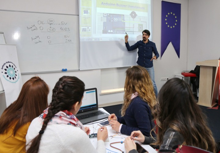 STEM eğitimi hakkında bilgiler veren Eğitmen Mehmet Başaran, “Fen, Mühendislik, Teknoloji, Matematik branşlarının bütünleşik olarak öğretilmesi olarak tanımlanan STEM, ABD ve Avrupa’da uzun süredir uygulanmaya çalışılan, ülkemizde ise 2011 yılları itibariyle hız kazanmaya başlayan bir eğitim programı modeli. Bu eğitimi Milli Eğitimdeki öğretmenlere veriyoruz. Gaziantep Üniversitesi Teknoloji Transfer Ofisi ile verdiğimiz bu eğitimde diğer STEM eğitimindeki benzerlikleri içermekle birlikte farklılık STEM ve Maker eğitimini birlikte yürütüyoruz. Öğretmenler STEM eğitimi kısmında derse nasıl entegre olabileceklerini öğreniyorlar. Maker’da ise daha çok kodlama ve robotik ağırlıklı eğitimler alıyorlar. Biz 5 günlük ve her gün 10 saati aşkın eğitim sunuyoruz” diye konuştu.