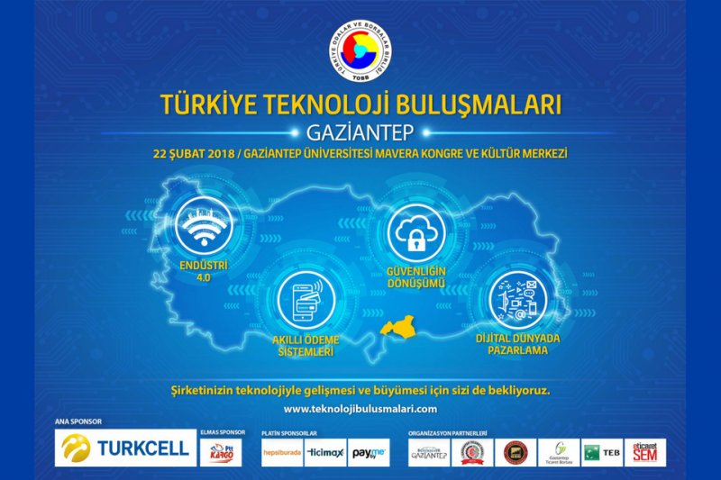 Türkiye Teknoloji Buluşmalarının bu yılki ana konusu olan “Dijitalleşme ve e-ticaret”, TOBB ve Türk Ekonomi Bankası iş ortaklığı ile Turkcell ana sponsorluğunda, Gaziantep Ticaret Odası, Gaziantep Ticaret Borsası ve Gaziantep Sanayi Odası ev sahipliğinde, 22 Şubat 2018 Perşembe günü saat 09:30’da Gaziantep Üniversitesi ev sahipliğinde Mavera Kongre ve Sanat Merkezi’nde gerçekleşecek.