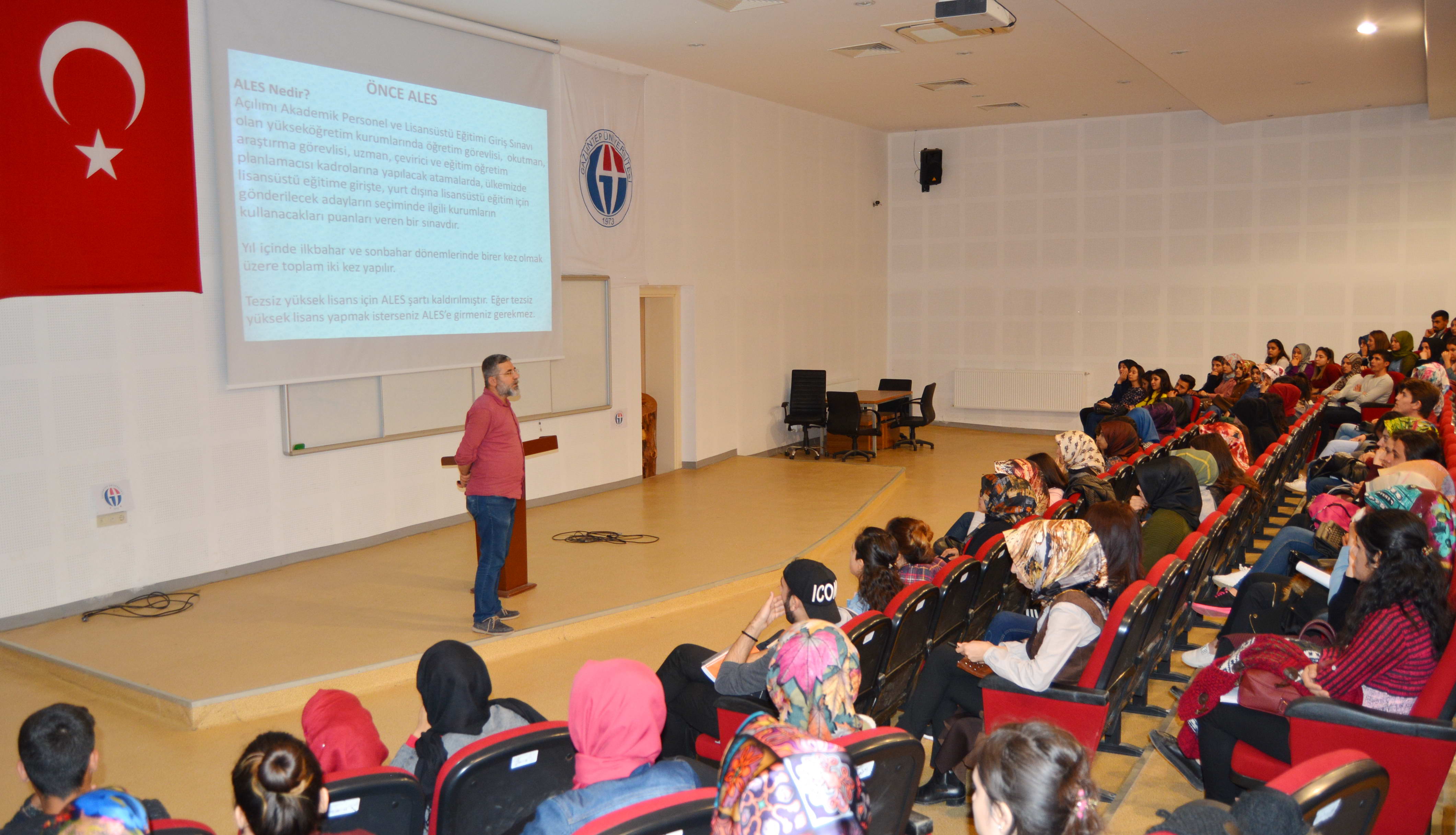 GAÜN İslahiye İİBF Konferans Salonunda gerçekleştirilen konferansta konuşan Öğr. Gör. Yıldız, yüksek lisans, doktora ve akademik kariyere dönük olarak yapılan Akademik Eğitim Lisansüstü Sınavı’nın (ALES) içeriği, soru sayıları, puan hesaplaması ve akademik süreçte kariyer kazanılması gibi konular hakkında katılımcıları bilgilendirdi.