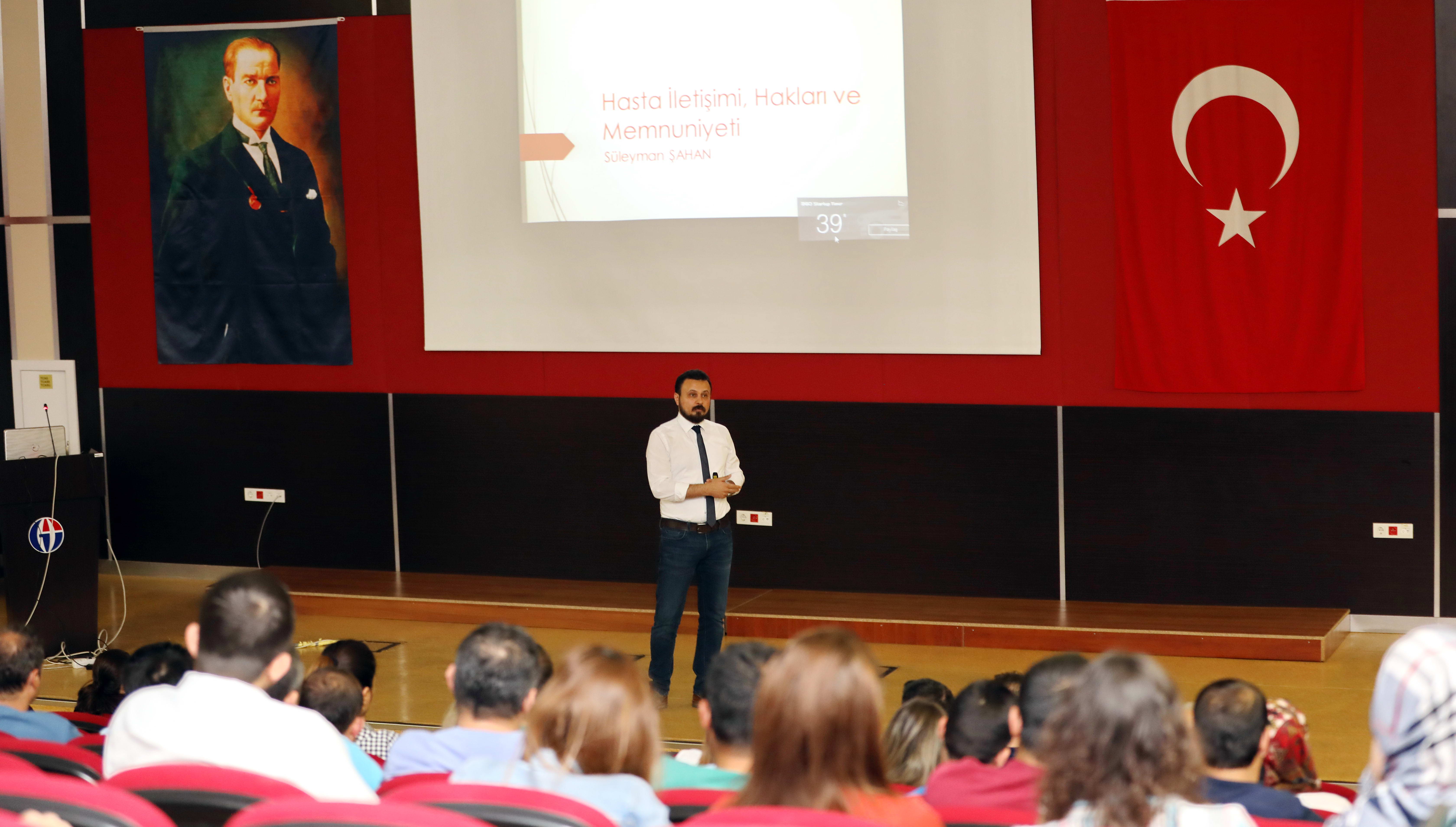 Sosyal Bilimler Meslek Yüksekokulu Öğretim Görevlisi Süleyman Şahan tarafından gerçekleştirilen eğitimde etkin iletişimin hasta memnuniyetine olan yansımaları üzerinde duruldu. İletişim önündeki psikolojik etkenlerin, etkili bir iletişim için gerekli olan yol ve yöntemler ile beden dilinin iletişim sürecindeki rolünün çok önemli olduğunu belirten Şahan, “Olaylar basit bir dille anlatılmalı, konuşurken karşımızdaki kişiyle mutlaka göz teması kurmalıyız. Ancak doğru iletişimle düşüncelerimiz ilgili herkes tarafından doğru bir şekilde algılanabilir. Doğru mesajları verebilmek için de beden dilinin etkisi göz ardı edilmemeli“ dedi.