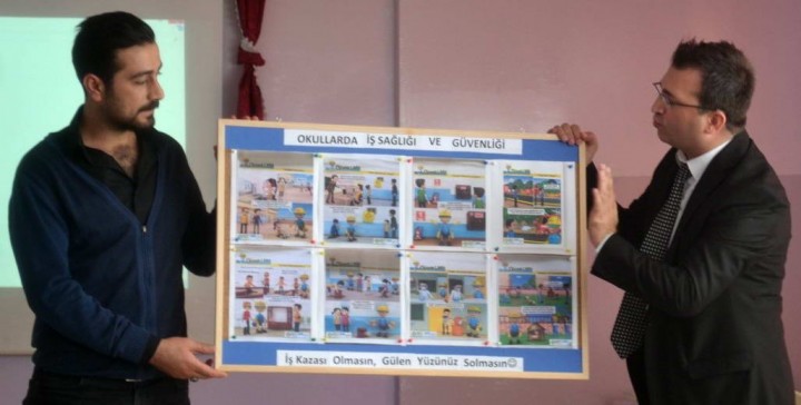 Öğr. Gör. Yaşar Ede tarafından İnkılap İlkokulu’nda öğrencilere iş sağlığı ve güvenliği konusunda bilgi verildi. Pek çok öğrencinin yaşamış olduğu tehlikeli olaylarla ilgili bilgiler verilirken bu olayların tekrar yaşanmaması için nelerin gerekli olduğu öğretildi. Yarının mühendis, doktor, avukatları olacak öğrencilere şimdiden iş sağlığı ve güvenliği bilincinin yerleştirilmesi gerektiği vurgusu yapılan eğitimde, evde, okulda, trafik de güvenliğin nasıl sağlanması gerektiği ile ilgili bilgiler de verildi.
