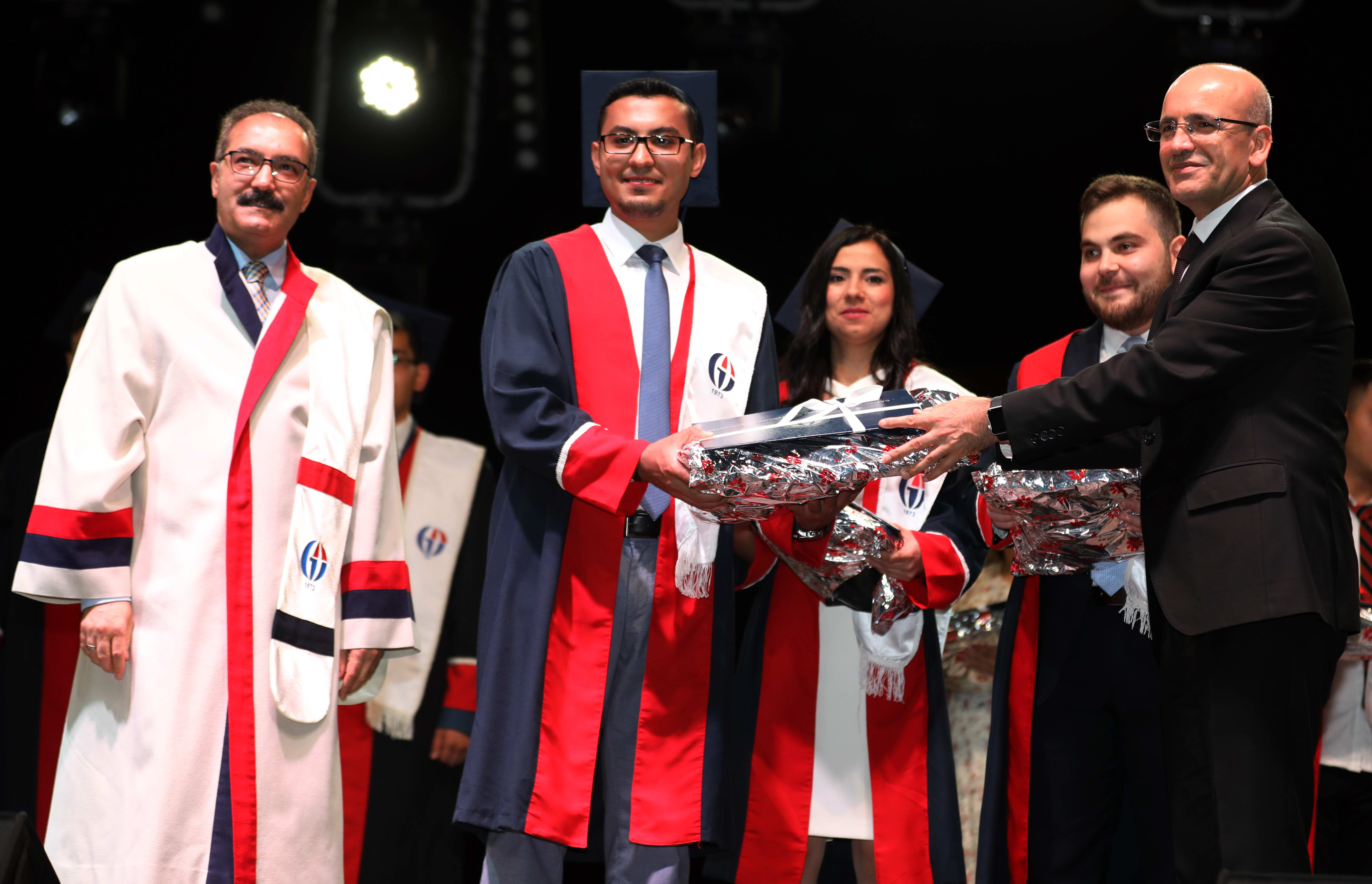 “Her zaman için azimli olmak, çalışmak esastır, bu nedenle hiç vazgeçmeyin” diyen Başbakan Yardımcısı Şimşek, “Mezun oldunuz, zorlu bir maraton bitti ama yeni maratonlar başlıyor. İş ararken, çalışırken başarı için çok daha ısrarcı olun, asla vazgeçmeyin ve şunu unutmayın ki, bir kapı kapanırsa mutlaka onlarca, binlerce kapı açılır. Kendinize ve başkalarına güvenin. Duygusal zekânın en önemli bileşenlerinden bir tanesi güvendir. Asla kötümser olmayın çünkü kendinize olan güven, kararlılık, azim, inanç mutlaka başarıyı getirir. Empati yapmayı unutmayın, nerede olursanız olun, ne iş yaparsanız yapın kendinizi zaman zaman diğer arkadaşlarınızın, başkalarının yerine koyun çünkü empati yapmakta duygusal zekanın en önemli bileşenidir. Önümüzdeki dönemde bunu yaptığınız ölçüde hem kendinizle, hem toplumla, hem de çevrenizle daha barışık ve başarılı olabilirsiniz” diyerek, öğrencilerin yetişmesinde emeği geçen öğretim elamanlarına teşekkür etti.