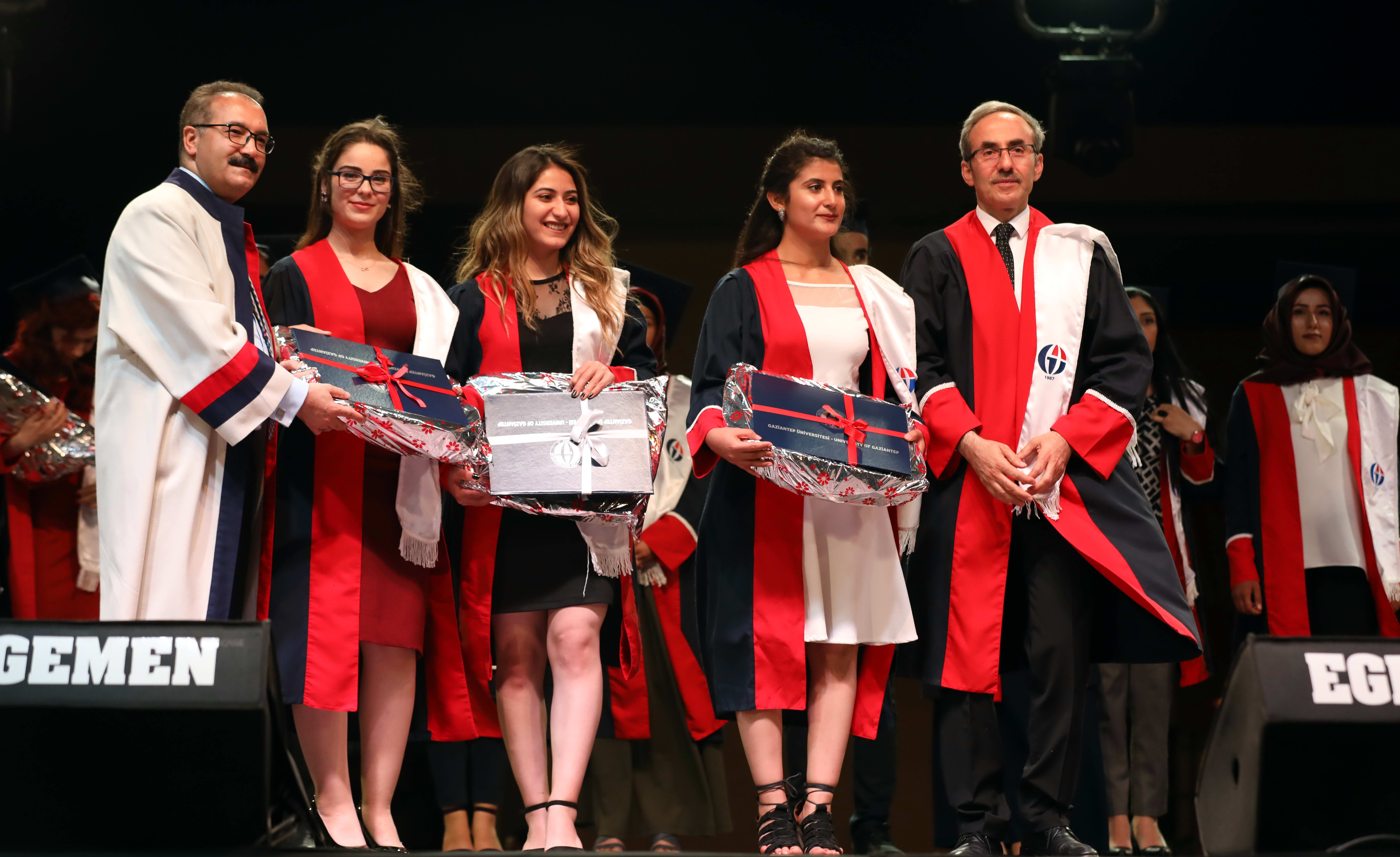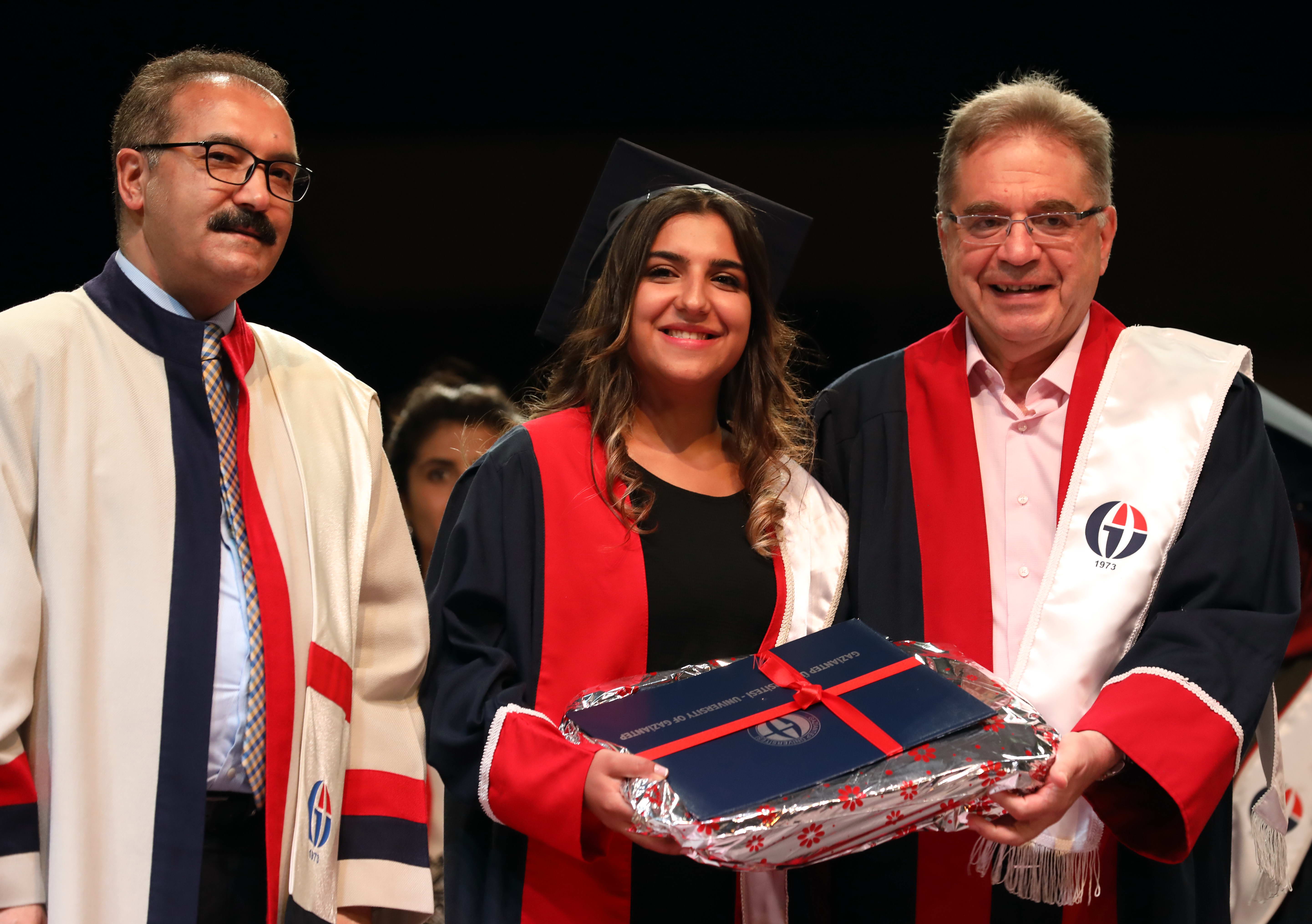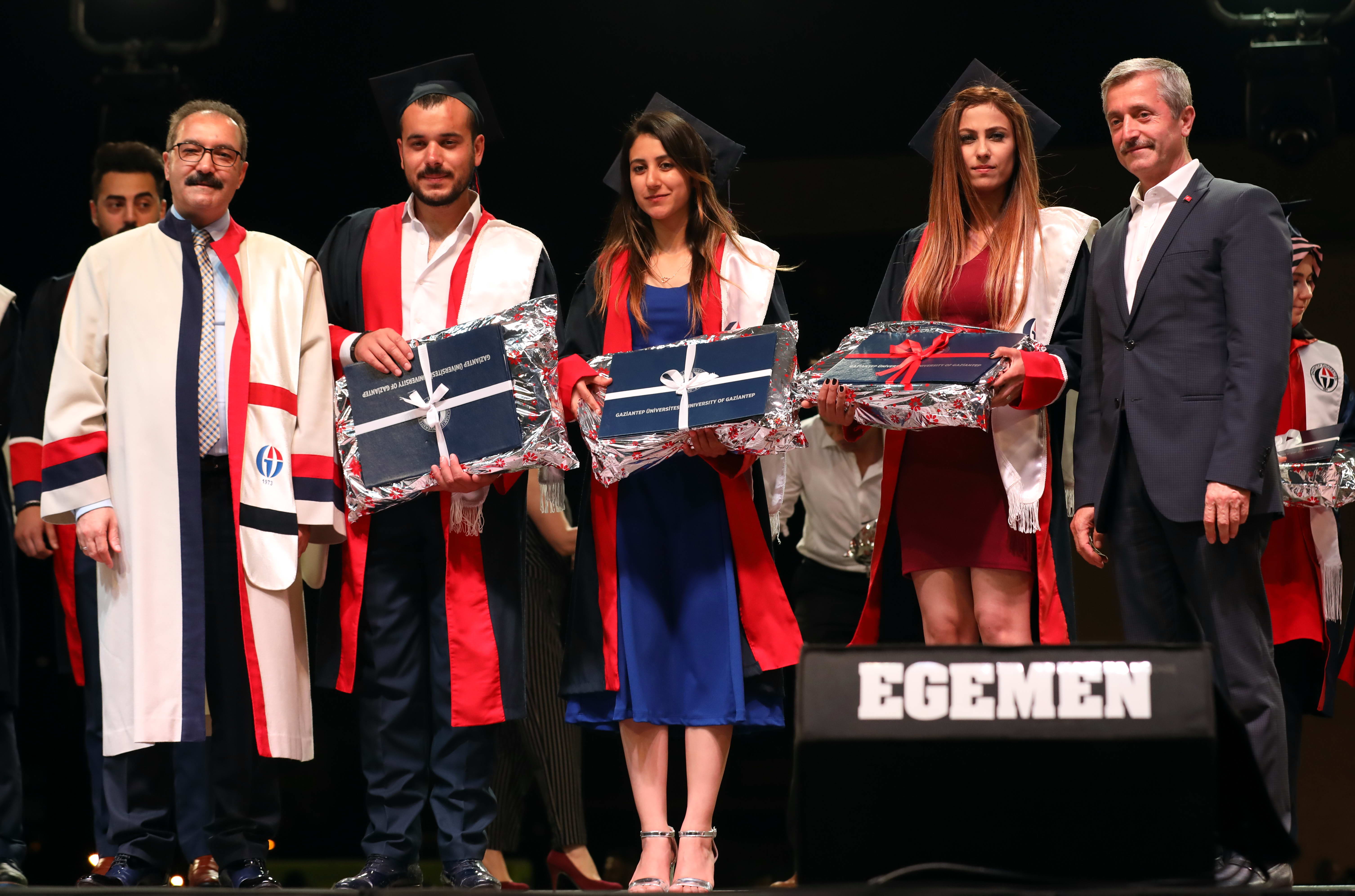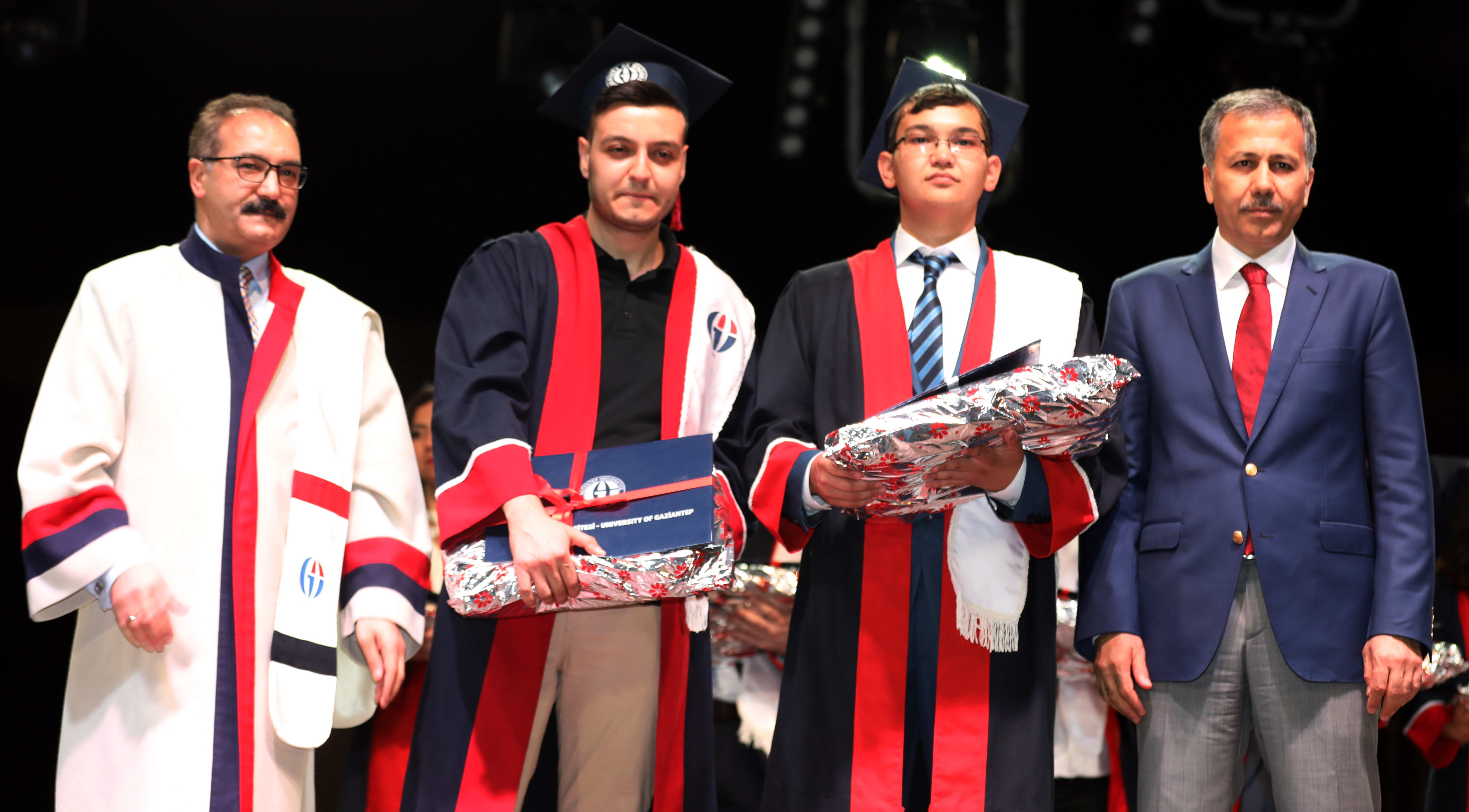 Mezun öğrencilerin Gaziantep Üniversitesi andını okuması sonrasında diploma ve hediyeleri Başbakan yardımcısı Mehmet Şimşek, Gaziantep Valisi Ali Yerlikaya, Gaziantep milletvekilleri, Ahmet Uzer, Mehmet Erdoğan, Derya Bakbak, Müslüm Yüksel, Mehmet Sait Kirazoğlu, Bayram Yılmazkaya, Sermet Atay, Gaziantep Üniversitesi Rektörü Prof. Dr. Ali Gür, Hasan Kalyoncu Üniversitesi Rektörü Prof. Dr. Tamer Yılmaz, SANKO Üniversitesi Rektörü Prof. Dr. Güner Dağlı, Şehinbey Belediye Başkanı Mehmet Tahmazoğlu, Gaziantep İl Emniyet Müdürü Faruk Karaduman, Gaziantep Sanayi Odası Yönetim Kurulu Başkanı Adnan Ünverdi, Gaziantep Üniversitesi Rektör Yardımcıları Prof. Dr. Metin Bedir, Prof. Dr. Şehmus Demir, Prof. Dr. Avni Gökalp, Gaziantep Üniversitesi Genel Sekreteri Doç. Dr. Ayhan Doğan, Rektör Danışmanları Prof. Dr. Süleyman Ganidağlı, Doç. Dr. Necip Fazıl Yılmaz tarafından verildi.