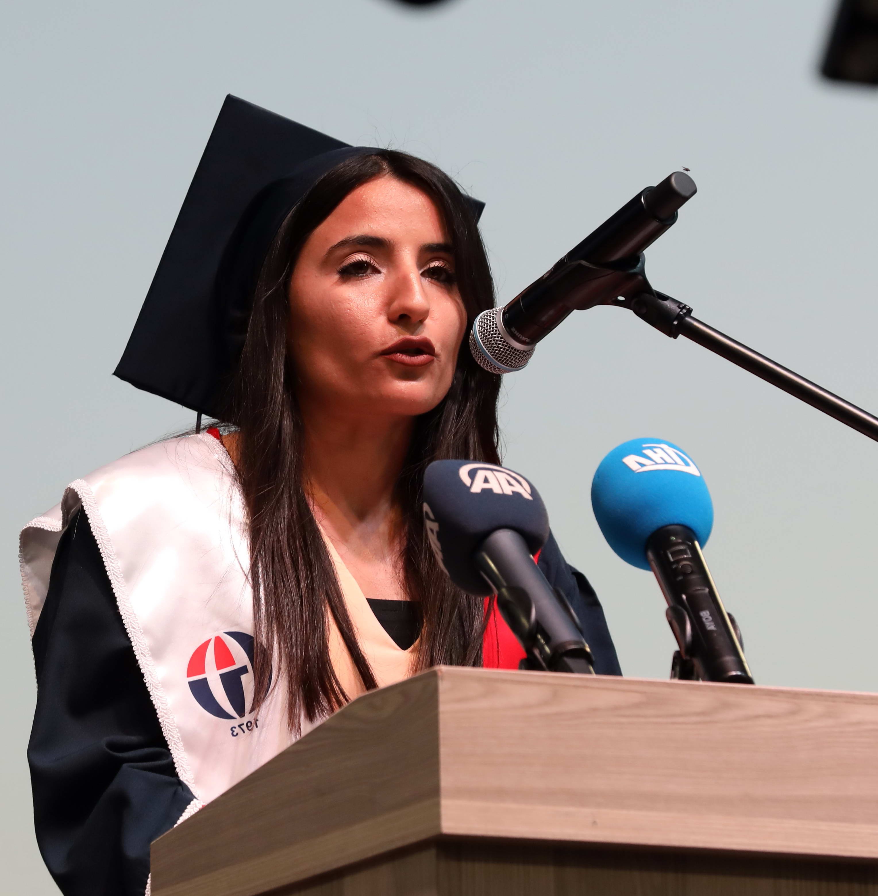 Mezunlar adına konuşma yapan GAÜN İslahiye İktisadi ve İdari Bilimler Fakültesi Kamu Yönetimi Bölümü Öğrencisi Birsen Polat, Rektör Prof. Dr. Ali Gür’e, Üniversite yönetimine, öğretim elamanlarına, öğrenci arkadaşlarına ve öğrencilik yaşamında emeği geçen herkese teşekkür ederek, mezun olmanın gururu içerisinde seslendiğini ifade ederek, “Senelerce gördüğümüz yönetimi, ekonomiyi, siyaseti konuşturma vakti. İşte şimdi bu halkın kazanımlarından aldığımız adımların nişanelerini görme vakti” diyerek, mezun arkadaşlarına bu yolda hep iyi insanlarla karşılaşın dileğinde bulundu.