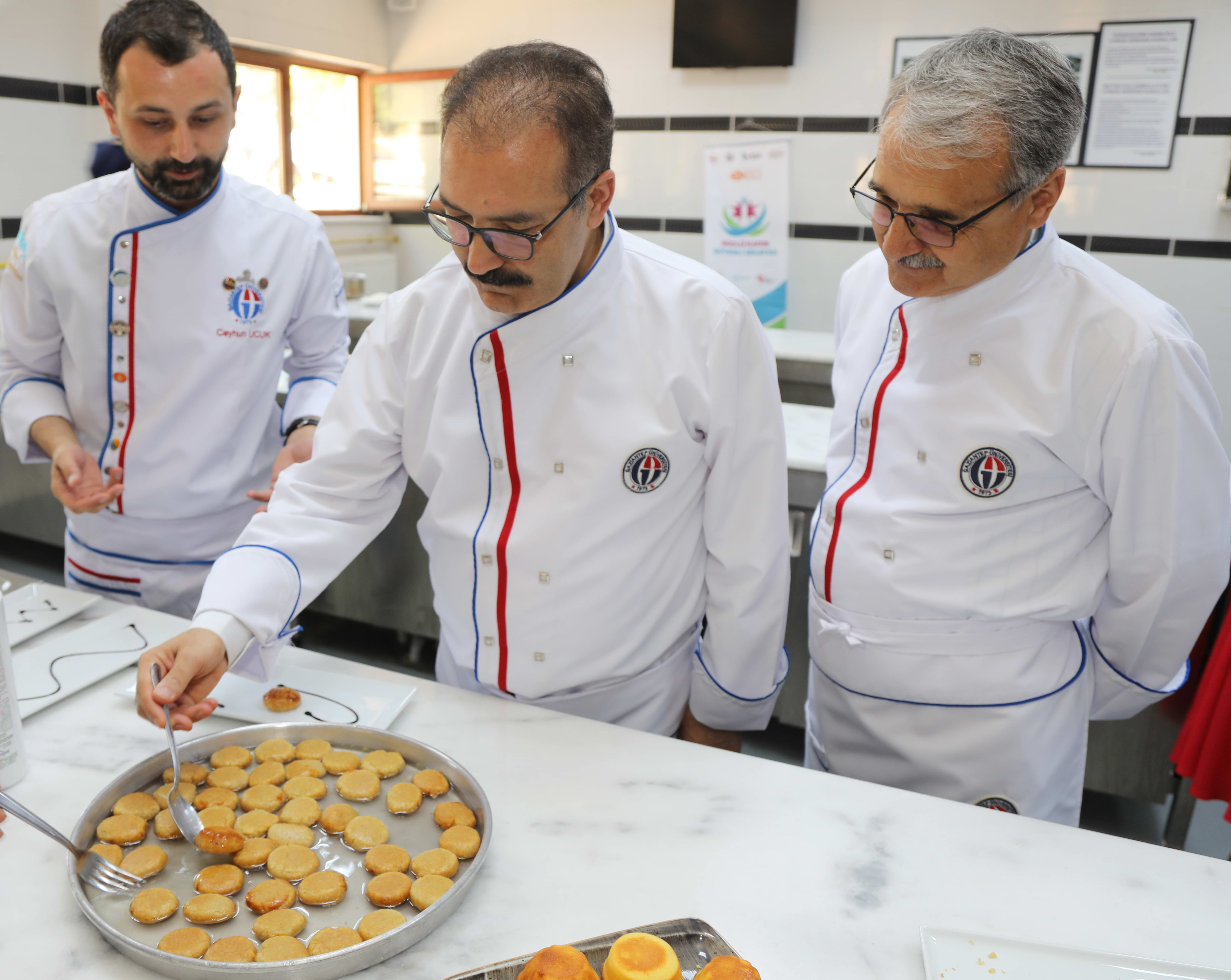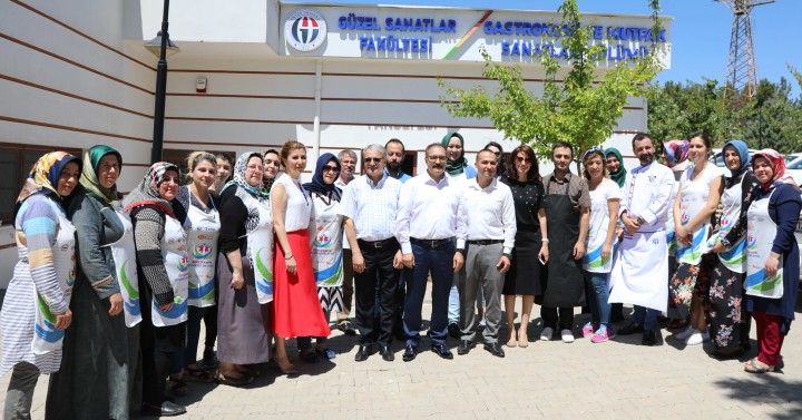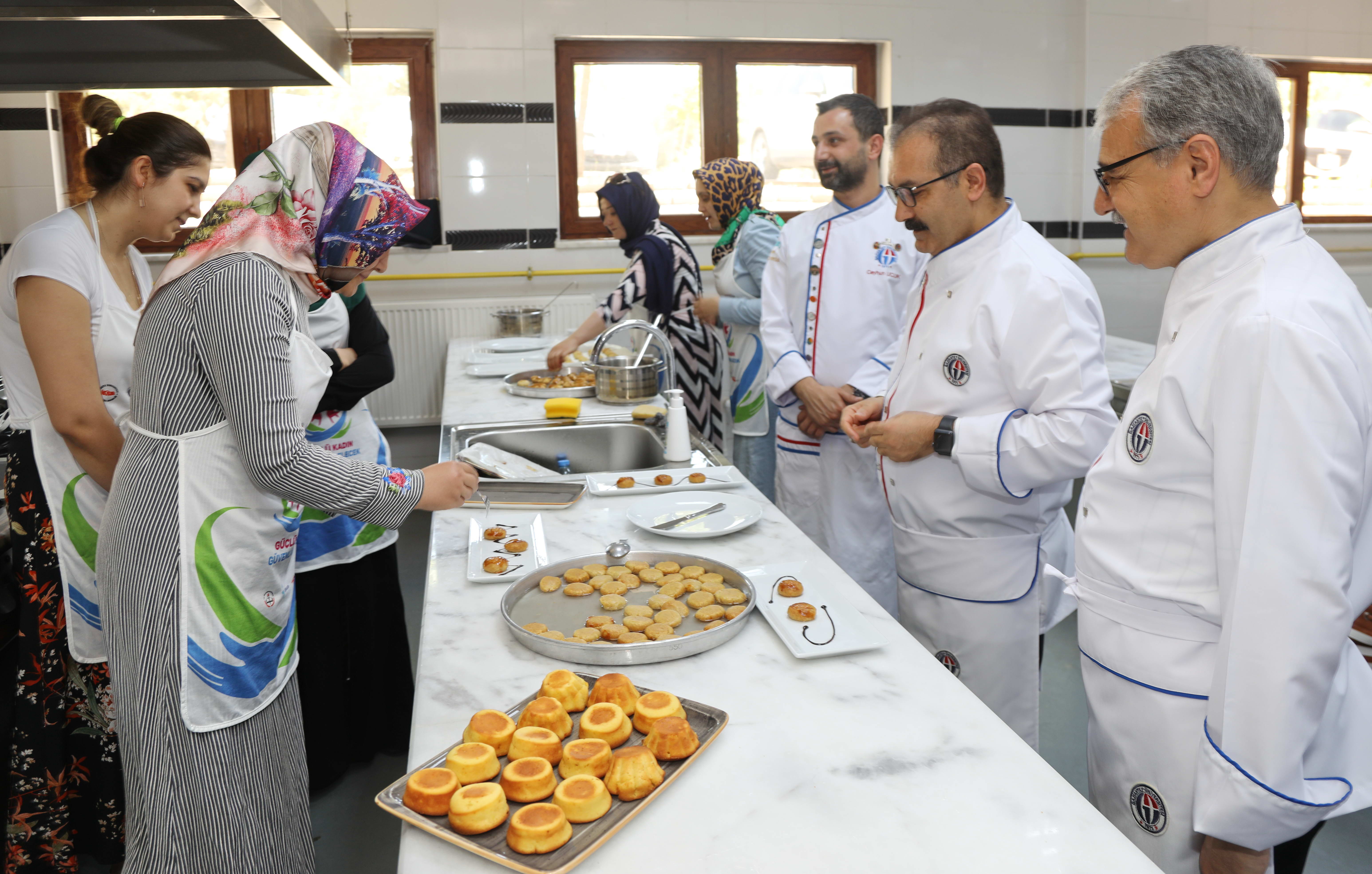 GAÜN Rektörü Prof. Dr. Ali Gür ve Rektör Yardımcısı Prof. Dr. Metin Bedir, Temel Pastacılık Kursu kapsamında Şehit ve gazi yakını kursiyerlerle, Güzel Sanatlar Fakültesi Mutfak Atölyesinde bir araya geldi.
