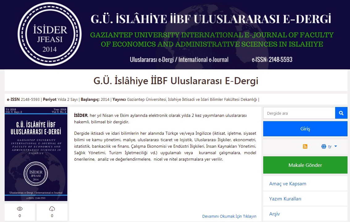 Gaziantep Üniversitesi (GAÜN) İslahiye İktisadi ve İdari Bilimler Fakültesi (İİBF) tarafından 2014 yılında yayına başladıktan sonra pasif durumda kalan İslahiye İİBF e- dergi yeniden yayına başladı.