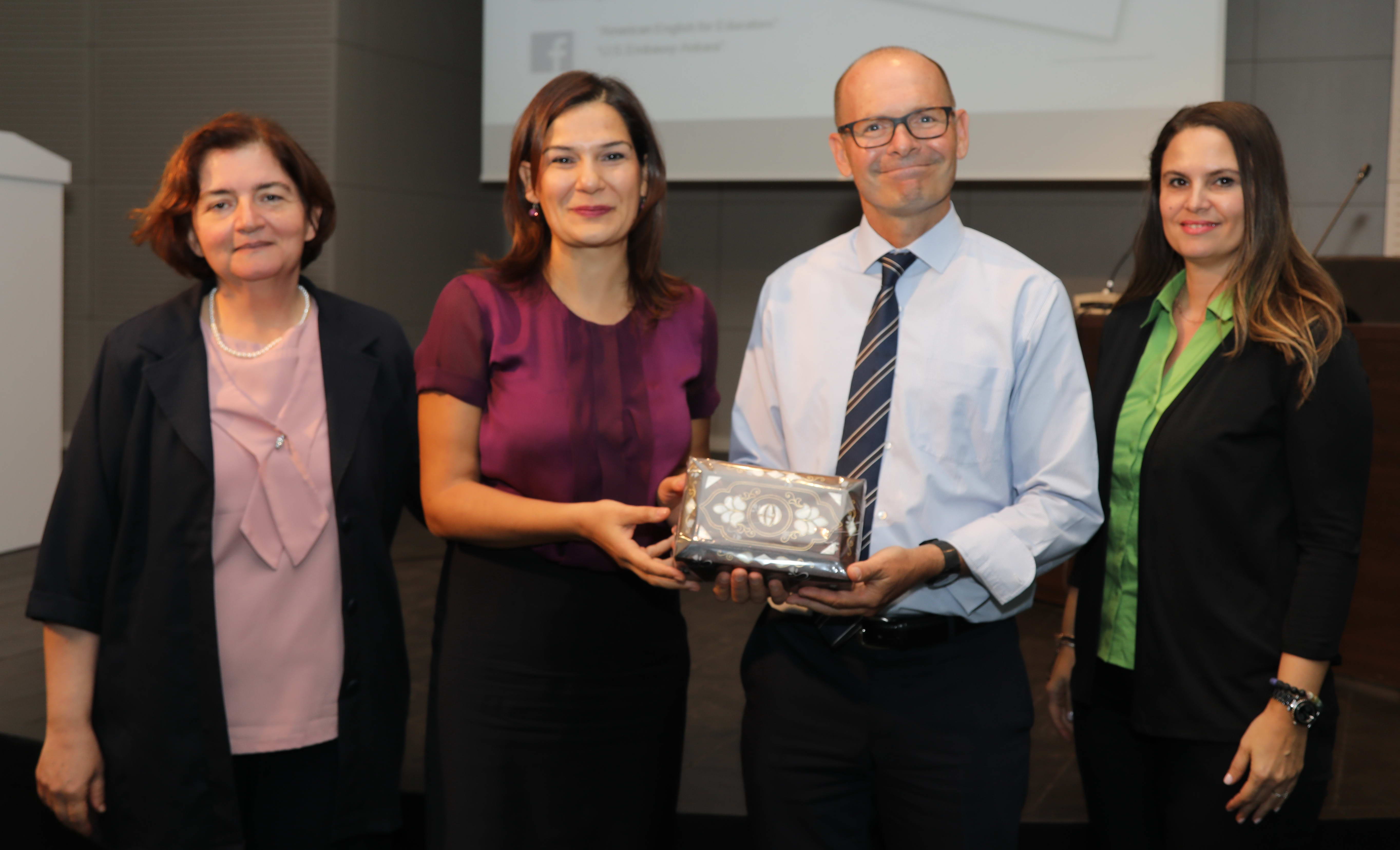Program sonunda Eğitim Fakültesi Dekan Yardımcısı Dr. Öğr. Üyesi Melike Özyurt ve Yabancı Diller Eğitimi Bölüm Başkanı Doç. Dr. Filiz Yalçın Tılfarlıoğlu tarafından Eğitim Fakültesi Ateşesi David Fay ve Regional English Language Programs Koordinatörü Aycan Yaman Esen’e çiçek ve hediye takdim edildi.