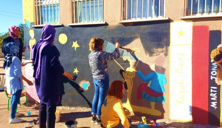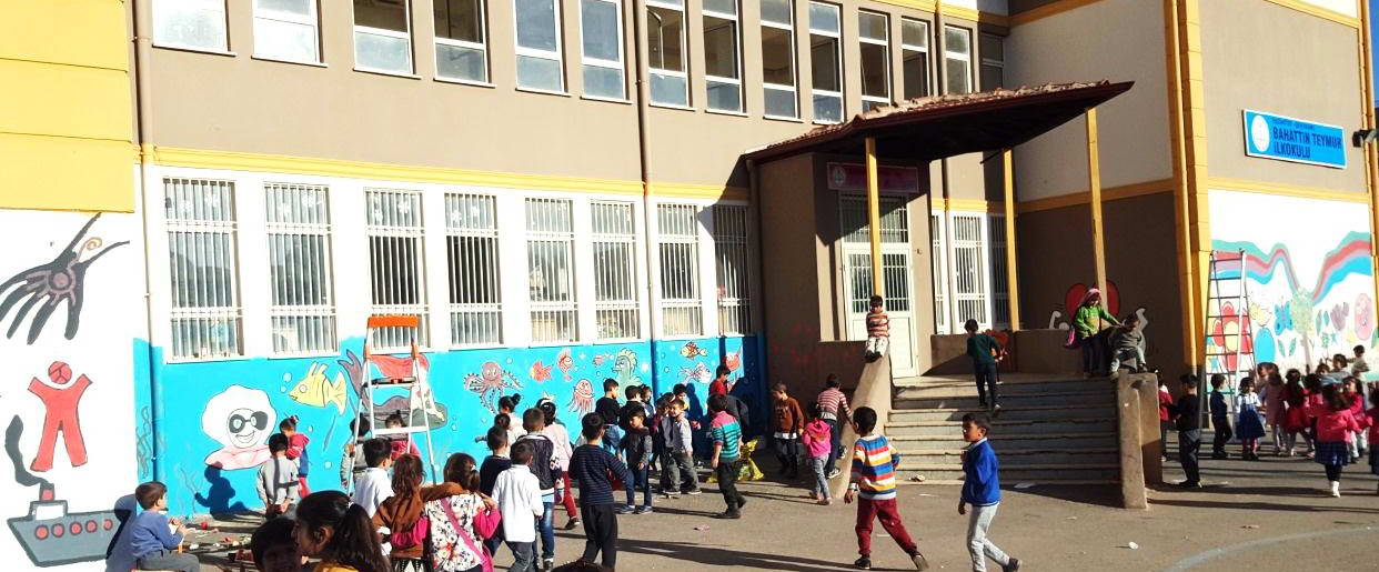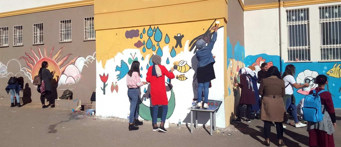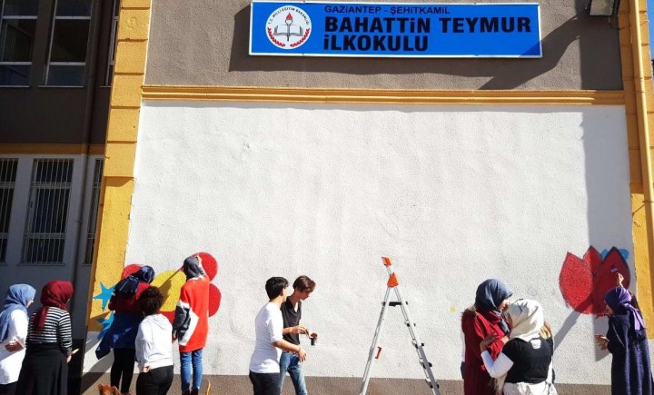 Gaziantep Şehitkâmil Bahattin Teymur İlkokulu’nun dış cephe duvarları 30 moda ve tekstil tasarım öğrencisi ve 30 resim bölümü öğrencisinin katılımıyla oluşan 60 kişilik bir ekiple boyandı.