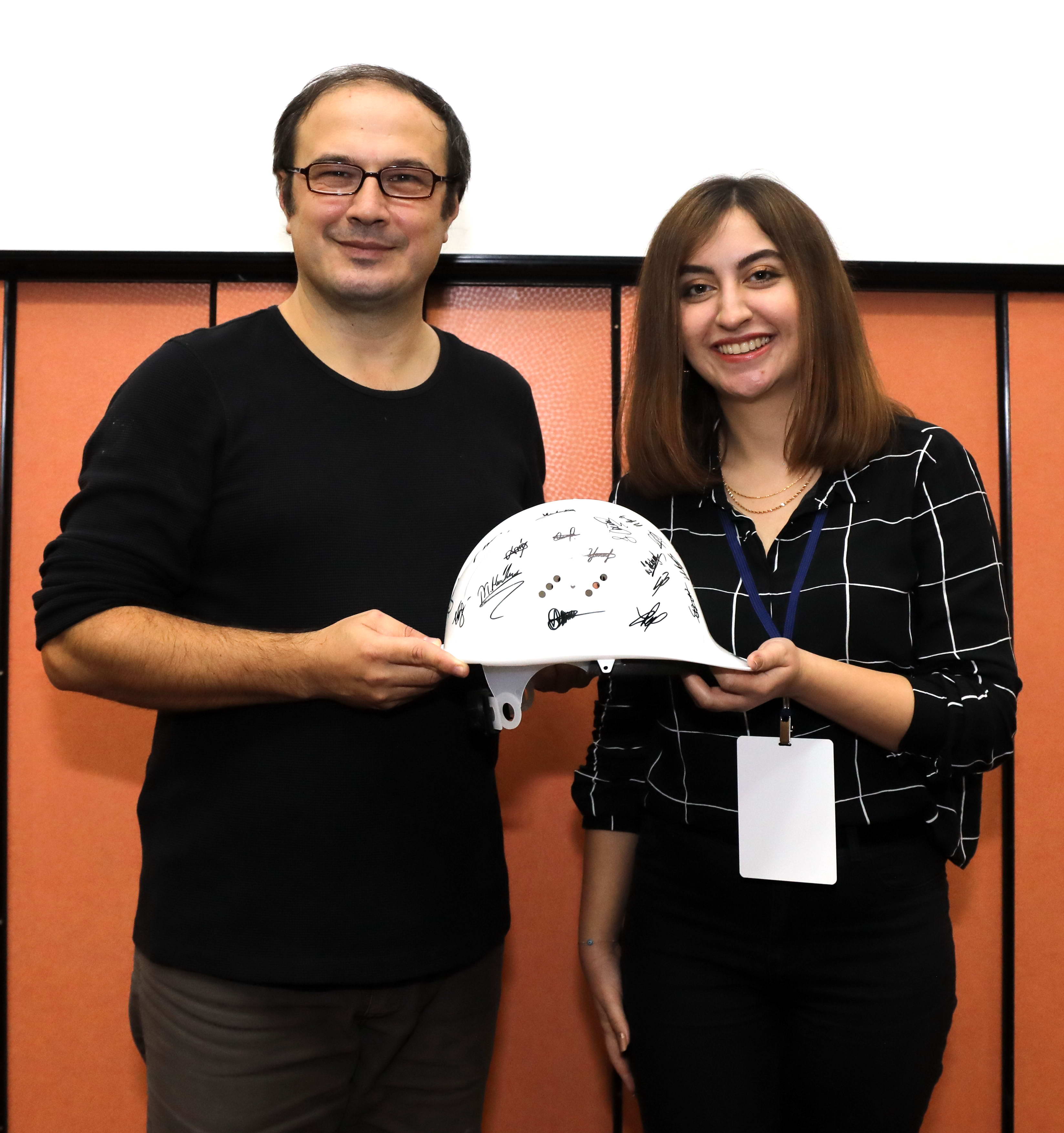 Program sonunda GAÜN Mühendislik Topluluğu Mesleki Faaliyetler Koordinatörü Merve Çamcı tarafından İnanç Ayar’a mühendis adaylarının imzaladığı baret takdim edildi.