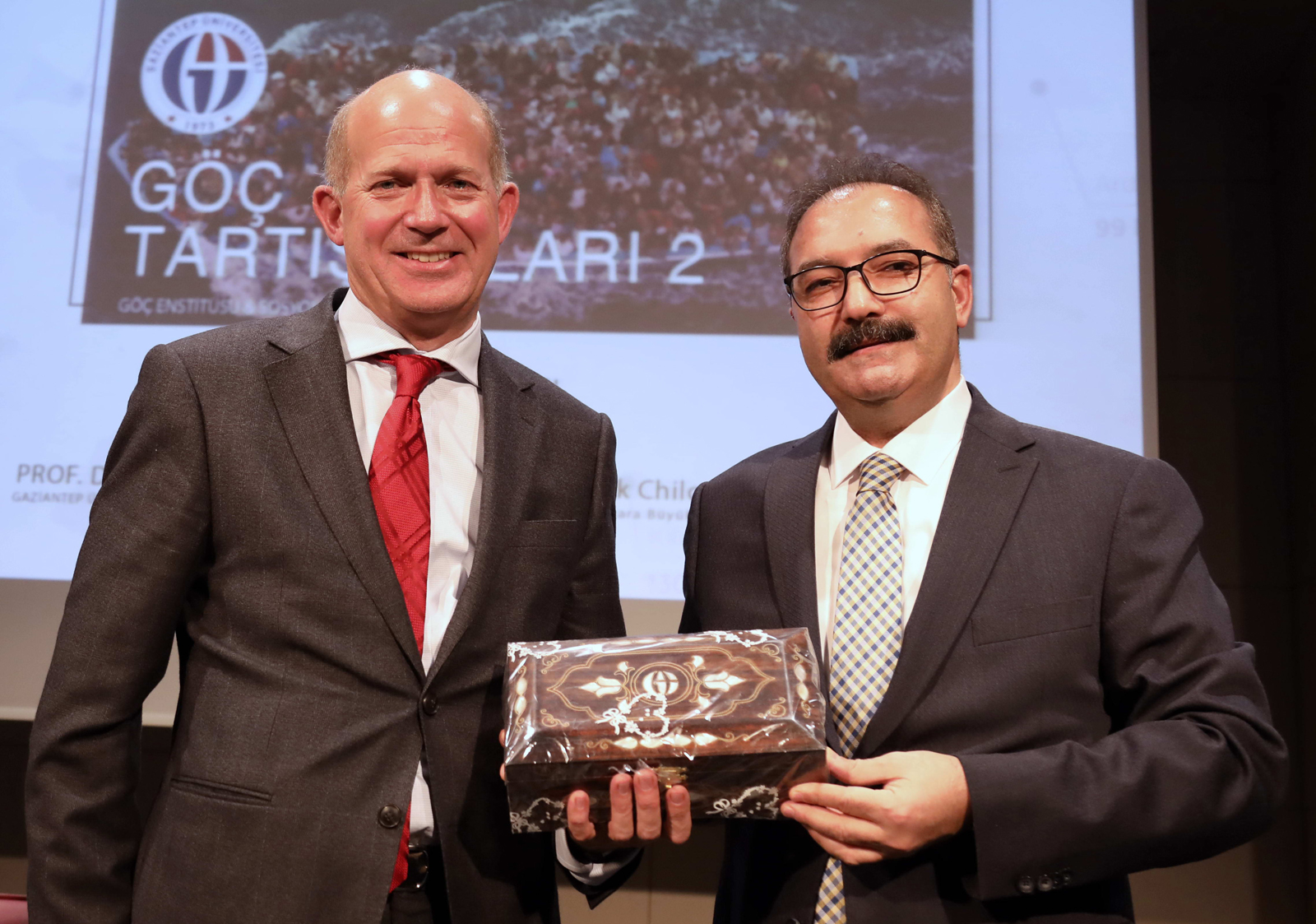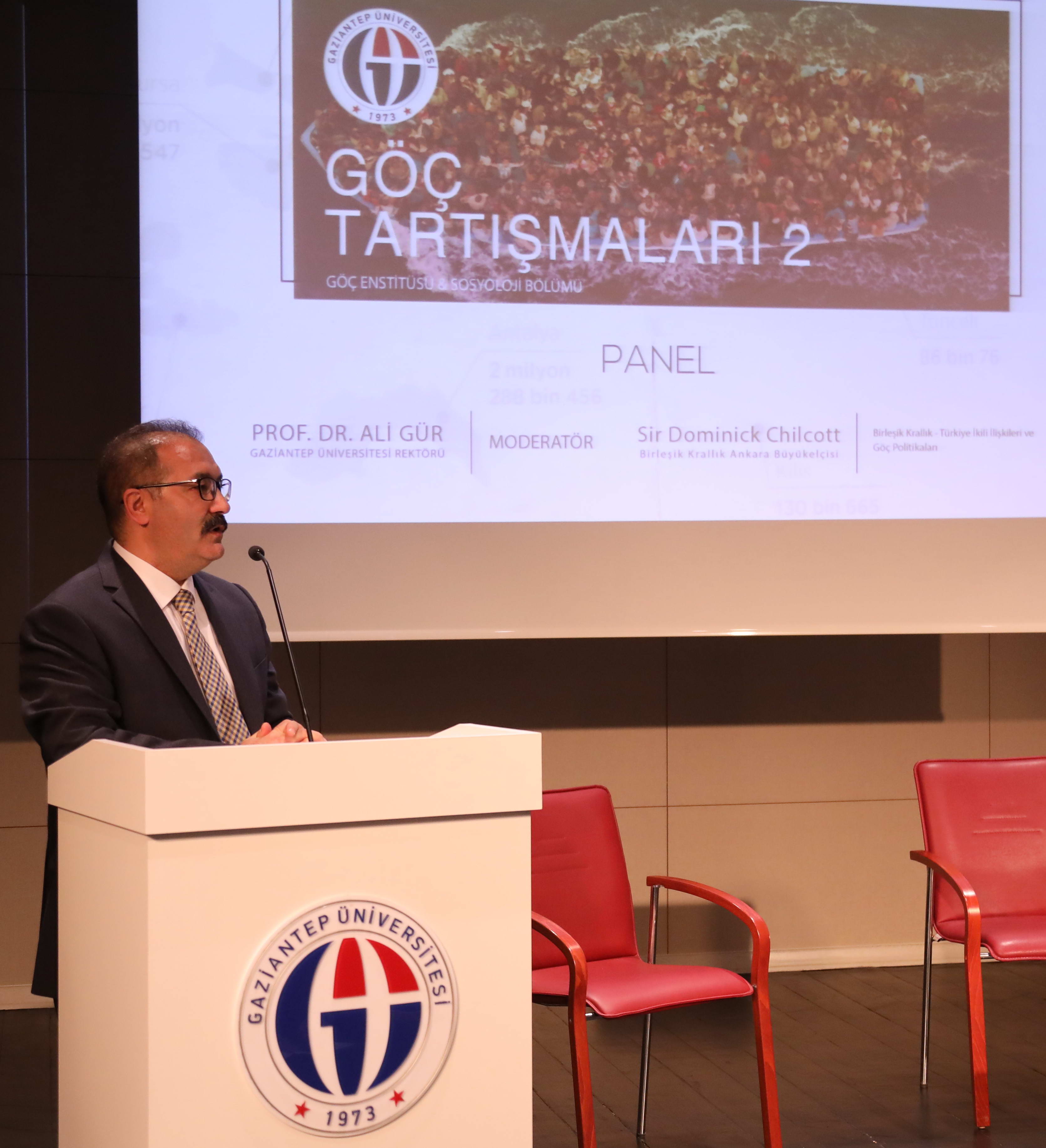 GAÜN Rektörü Prof. Dr. Ali Gür ise konuşmasında, üniversite olarak göç konusunda önemli tecrübeler edindiklerini ve bu konudaki deneyimlerini dünyayla paylaşmaya hazır olduklarını dile getirdi. Gaziantep Üniversitesi’nin çok büyük ve uluslararası bir üniversite olduğunu vurgulayan Rektör Prof. Dr. Gür, konuşmasını şöyle sürdürdü: “Suriyeli öğrencilerimiz dahil olmak üzere onları entegre etmek ve eğitim alanında onları desteklemek açısından en büyük riski alan ve elin taşın altına koyan üniversite biziz. Bununla iftihar ediyoruz. Eğitilmiş her birey toplum açısından kazanılmış bireylerdir. Gaziantep açısından baktığımızda 480 bin Suriyeliyi burada misafir ederken herhangi bir asayiş olayı olmaması ve eğitimlerine büyük katkı sağladığımız için mutluyuz. Londra, Paris, Tokyo ya da dünyanın başka hangi şehrine bu kadar Suriyeli misafiri koyarsanız kaotik bir durum olur ama Türkiye’nin bir devlet oluşu ve misafirperverliği burada ortaya çıkıyor. Türkiye’nin güvenliği Avrupa’nın güvenliğidir. Türkiye’nin teknolojik gelişmişliği aynı zamanda Avrupa’nın da pazar payı anlamına geliyor.