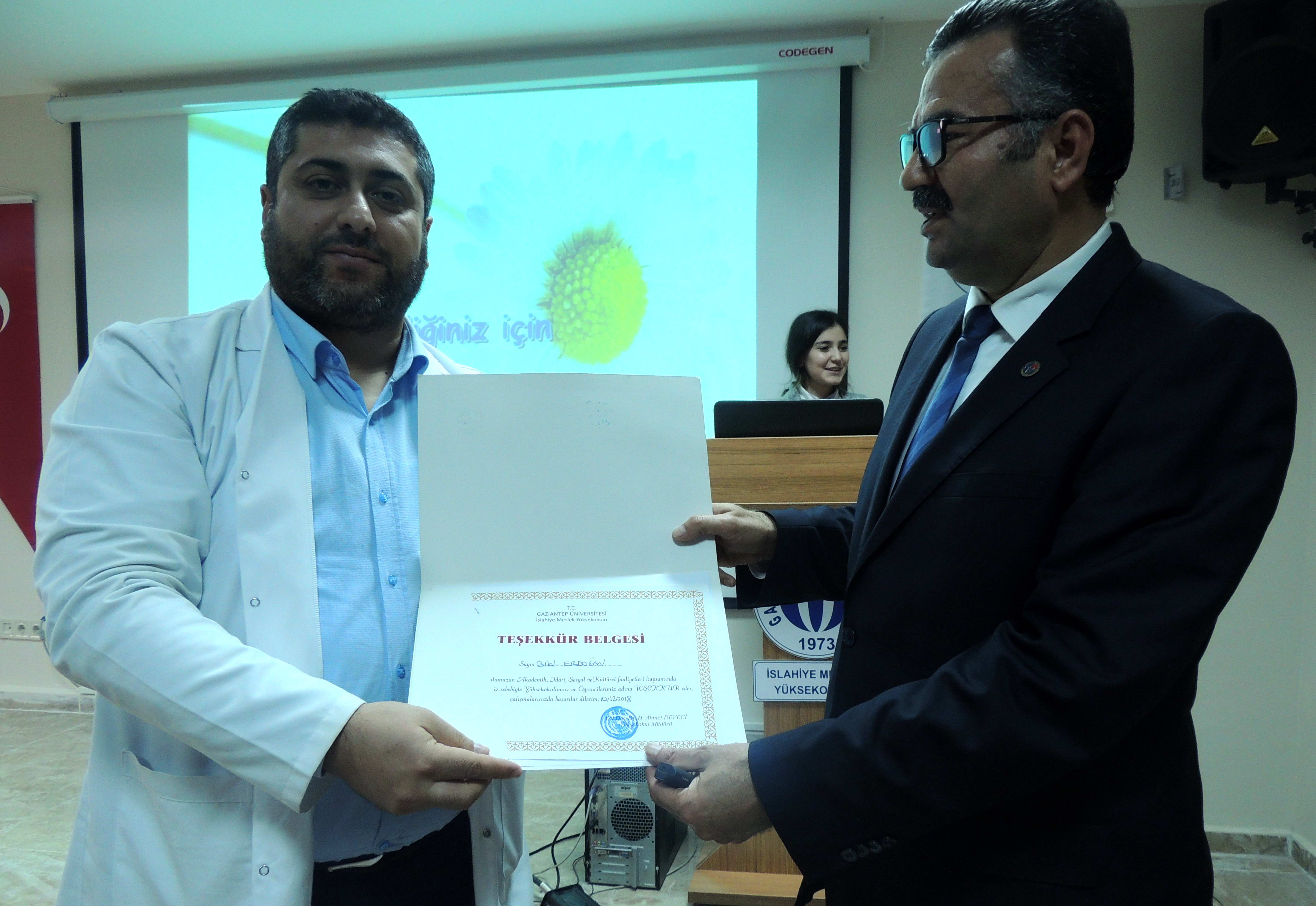 Seminerden sonra GAÜN İslahiye Meslek Yüksekokulu Müdür Yardımcısı Dr. Öğretim Üyesi Gökhan Nur tarafından Bilal Erdoğan’a teşekkür belgesi takdim edildi.