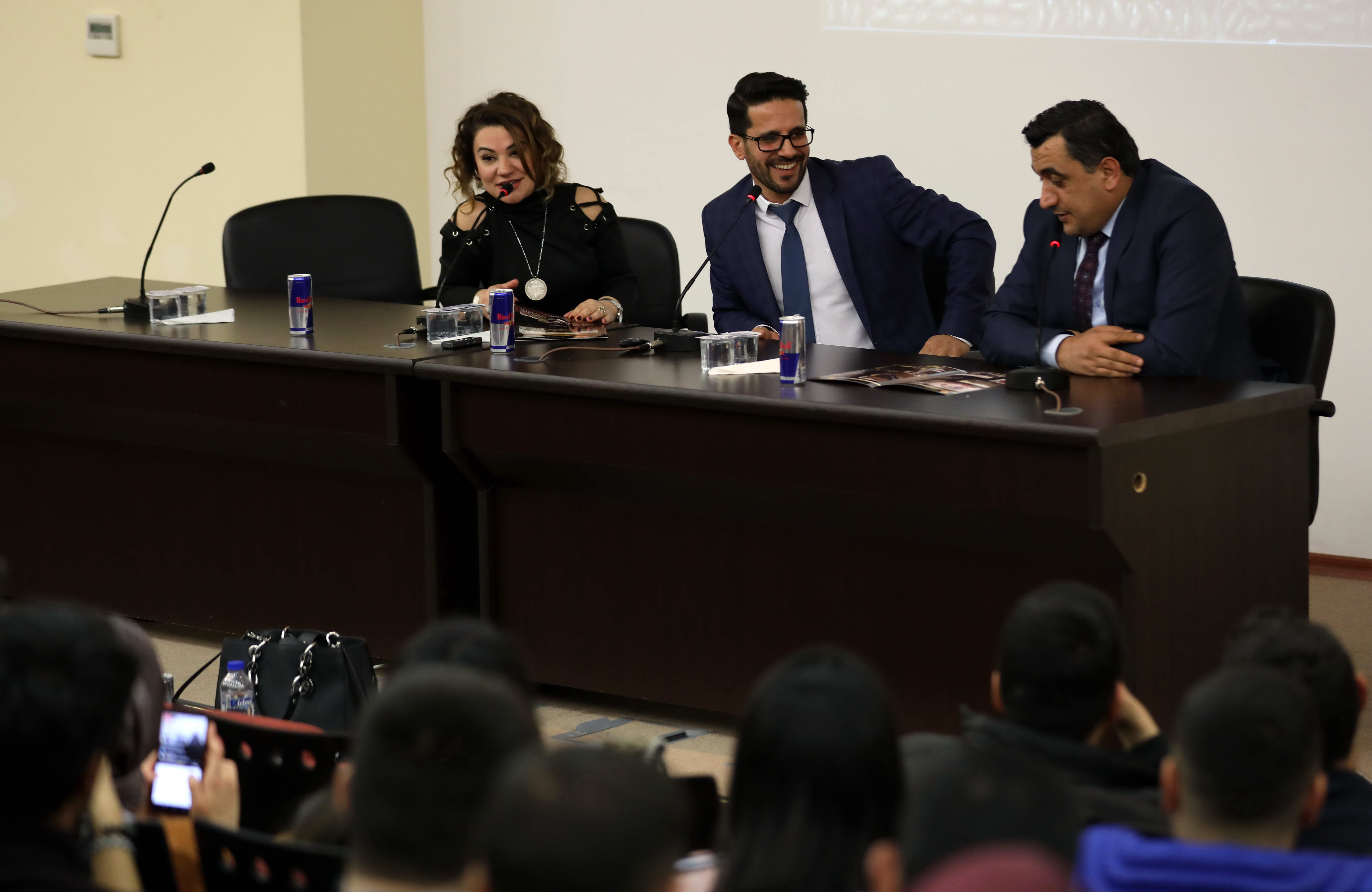 Söyleşiye konuşmacı olarak katılan Çeled Uşaglar Tiyatro Okulu Genel Sanat Yönetmeni Orhan Uslu ve Nilayen Sanat Kurucusu Nilay Gündüz öğrencilere kendi hayatlarından da örnekler vererek, başarıya giden yolda azim ve istikrarın önemine işaret etti.