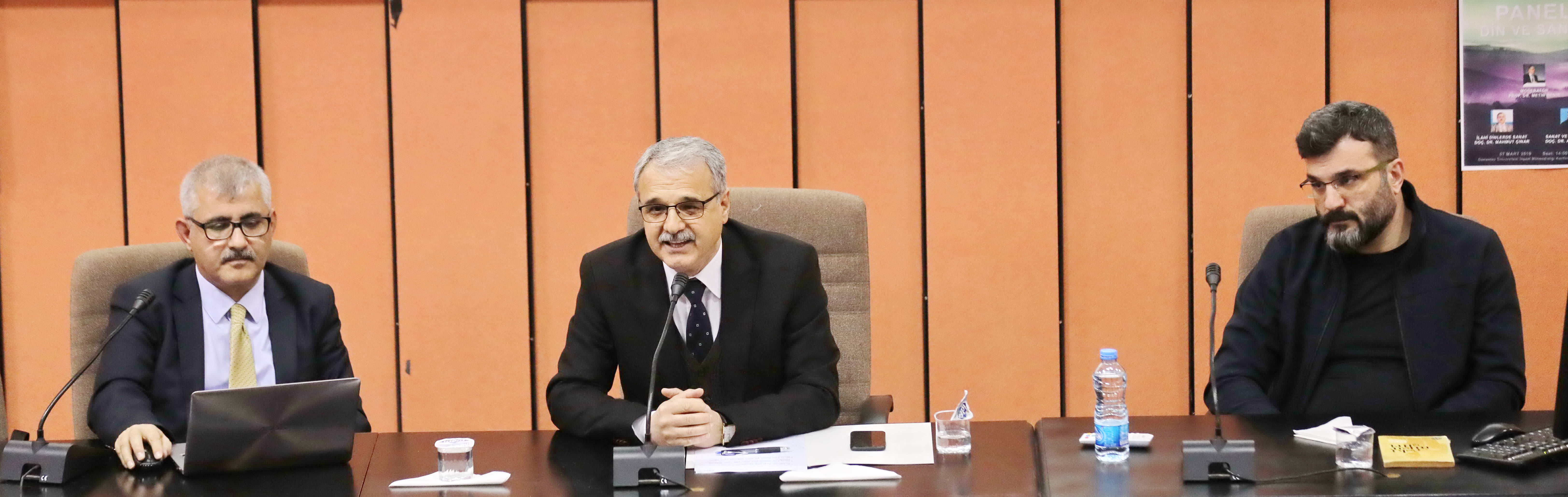Panelin açılışında konuşan GAÜN Rektörü Prof. Dr. Ali Gür, sanatın dinden ayrı düşünülemeyeceğini vurguladı. Rektör Gür, “Bir din kurallarını estetik, güzel ahlak üzerine kuruyorsa burada artık sanatsız bir din daha doğrusu dini algının ve sanatın birbirinden ayrışmayacağını siz de bilirsiniz. Temel sorunlardan birisi din hiçbir zaman yapılan işin alelade ve körü körüne yapılmasını istemez. Özellikle göz estetiğini bozacak düzeyde ve ruhu tırmalayacak bir yapıda hiçbir zaman var olanları kabul etmez. O yüzden dini kurallarla birlikte aynı zamanda estetizmi, romantizmi ve sanatsal harmanlamayı yapmak zorunluluğumuz var. Ancak öyle mütekamil bir ruh, insanı kâmil oluşturabiliriz” diye konuştu.