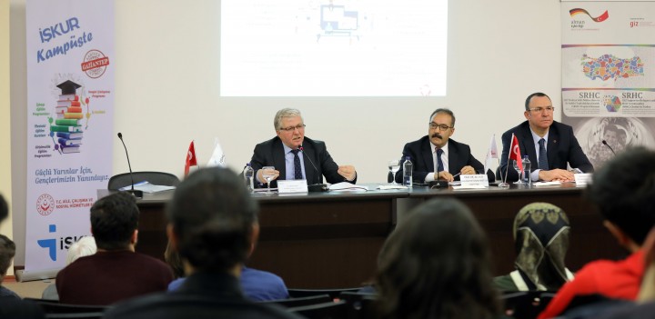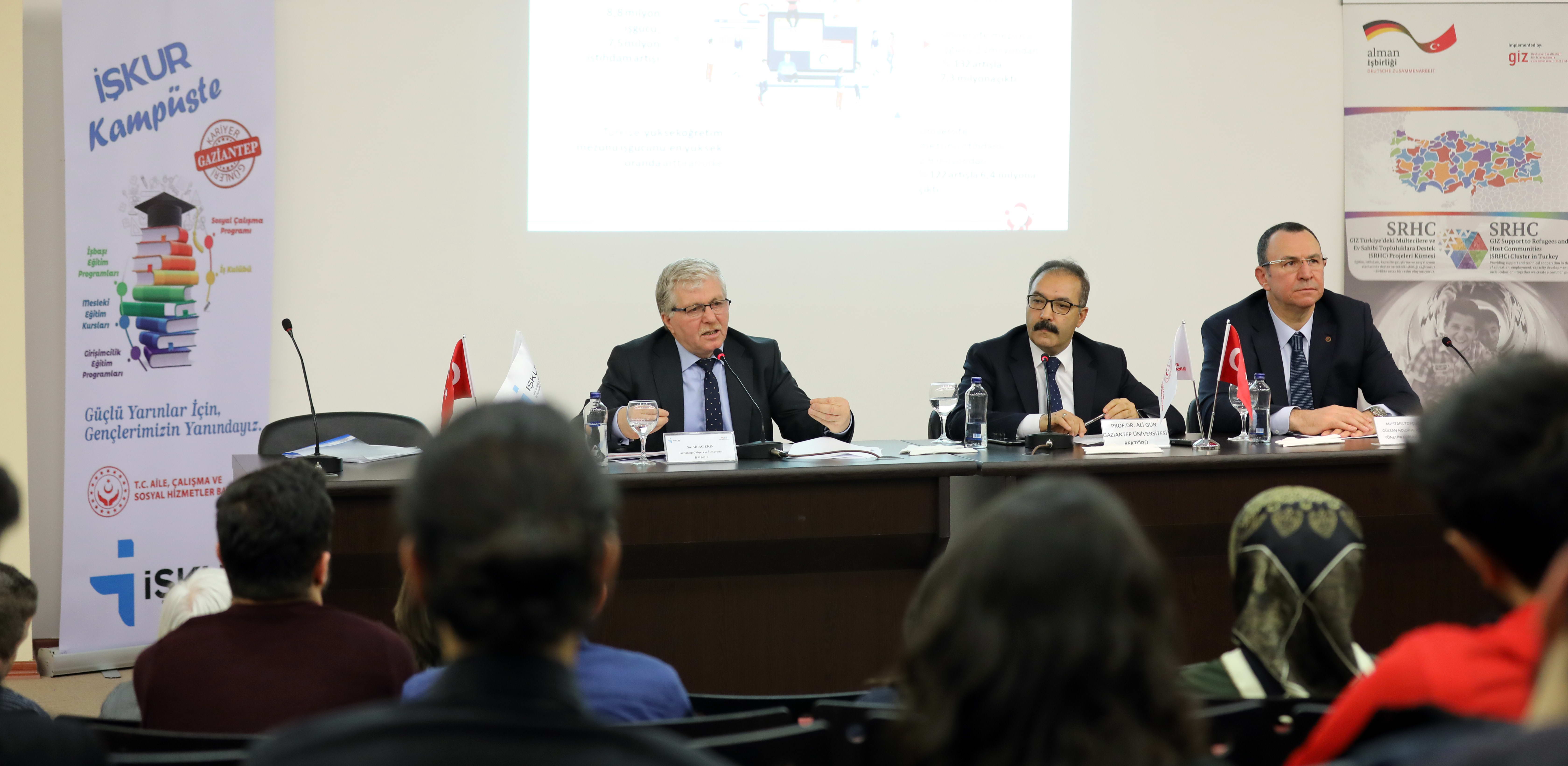 Topçuoğlu’ndan sonra konuşan İŞKUR Müdürü Sıraç Ekin ise, Gaziantep Üniversitesi ile son derece başarılı projelere imza attıklarını belirttiği açıklamasında özetle şunları söyledi: “İŞKUR olarak biz size nasıl bir fayda sağlarız? Şu anda eğitim hayatındasınız ama eğitim sonrasında ne yapacaksınız ve sizin için bizler ne yapabiliriz? Sizin için güçlü gelecek temin etmek adına beraber çalışmamız, size birtakım fırsatlar sunmamız gerekiyor. Dünya’da dijitalleşen 4.0 devrimi yayılıyor. Ülkemiz de bunun gerisinde kalmayacak 4.0’ı konuşmamız gerekiyor ve o alanda yetişmeniz gerekiyor. Yani geleceğin meslekleri unutmamamız gerekiyor. İŞKUR bünyesinde yurt sathında yayılmış işbaşı eğitim programlarımız öğrencilik ve mezuniyet sonrası, mezuniyet öncesinde de kullanılan bir program. Hem staj imkanlarımızın engellenmemesini de sağlıyor hem de size maddi imkan sunuyor. Hem de tecrübe kazanmanıza sebebiyet veriyor. İş kulüpleri oluşturduk. Bu iş kulüplerinde bizim meslek danışmanlarımız sizlere daha geniş imkân sunma, daha büyük fırsat tanıma imkanları tanıyacak ki daha çok konuşma ve iş arama teknikleri yöntemlerini tecrübe edeceklerdir ve iş tecrübesi sahibi olmaya sevk edeceklerdir. Mesleki eğitim programlarımız var ve en önemlisi işe ilk adım projesi diye nitelendirdiğimiz ve tamamen üniversite mezunu gençleri ilgilendiren bir projemiz. Bu proje yeni hayata geçiyor. Bu projeyle beraber sanayicilerimize bir takım teşvikler uygulanacak ki siz değerli üniversite mezunları istihdamda daha fazla kalasınız.”
