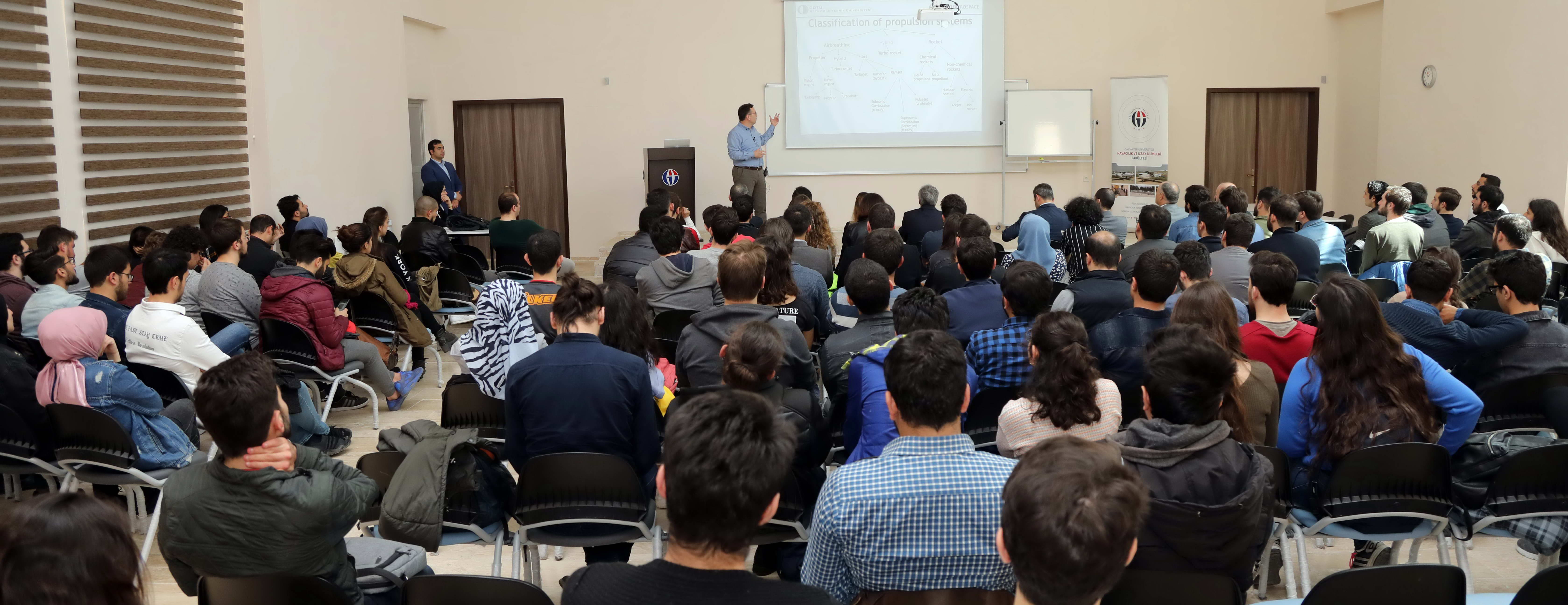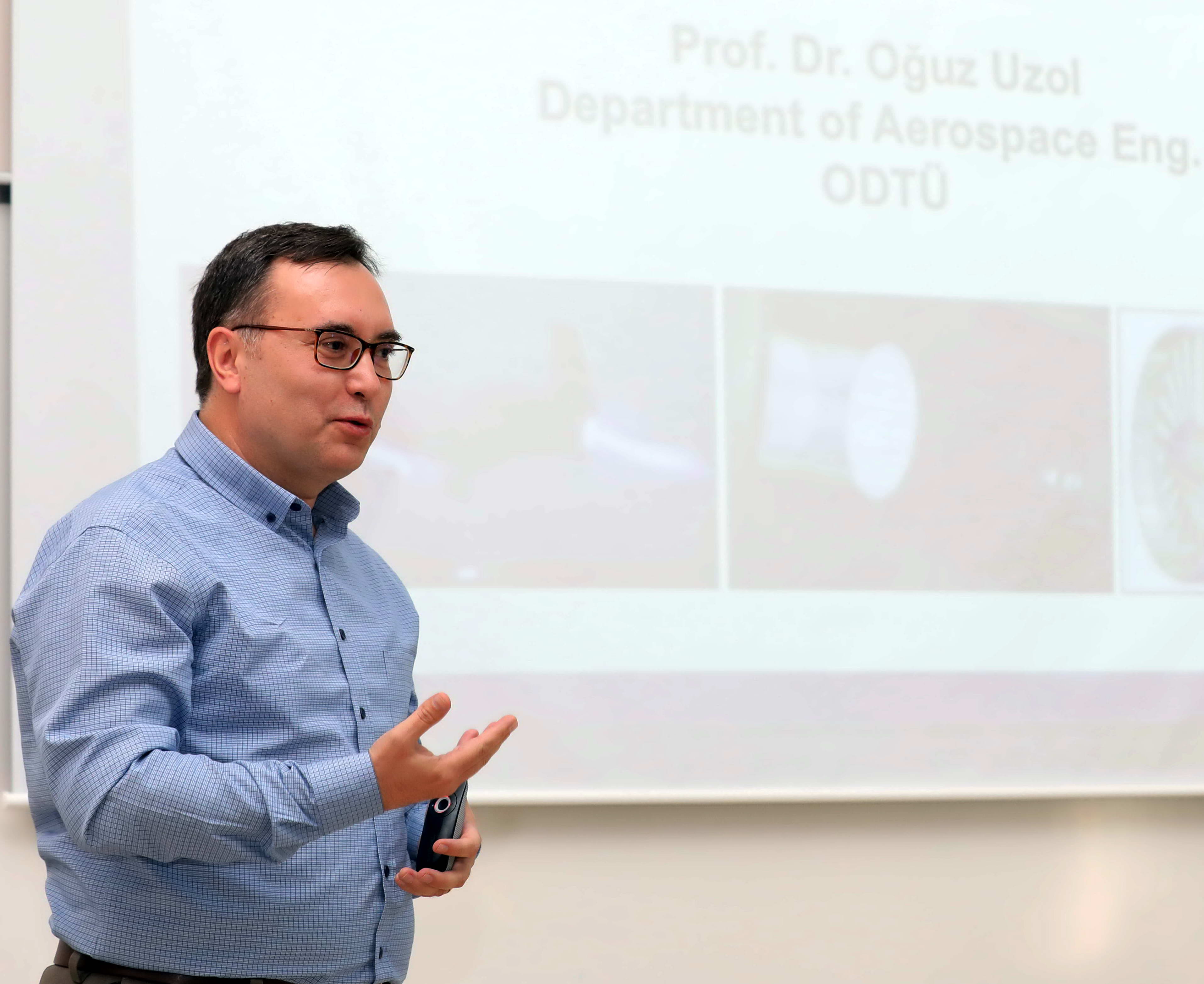 Ortadoğu Teknik Üniversitesi Öğretim Üyesi Prof. Dr. Oğuz Uzol, öğrencilere İngilizce bir sunum yaparak, Uçak ve Uzay Mühendisliği alanında kullanılan değişik tiplerdeki motor ve güç-itki üretim sistemleri tarihsel geçmişi, güncel ve gelecek çalışma alanları konusunda öğrencileri bilgilendirdi.