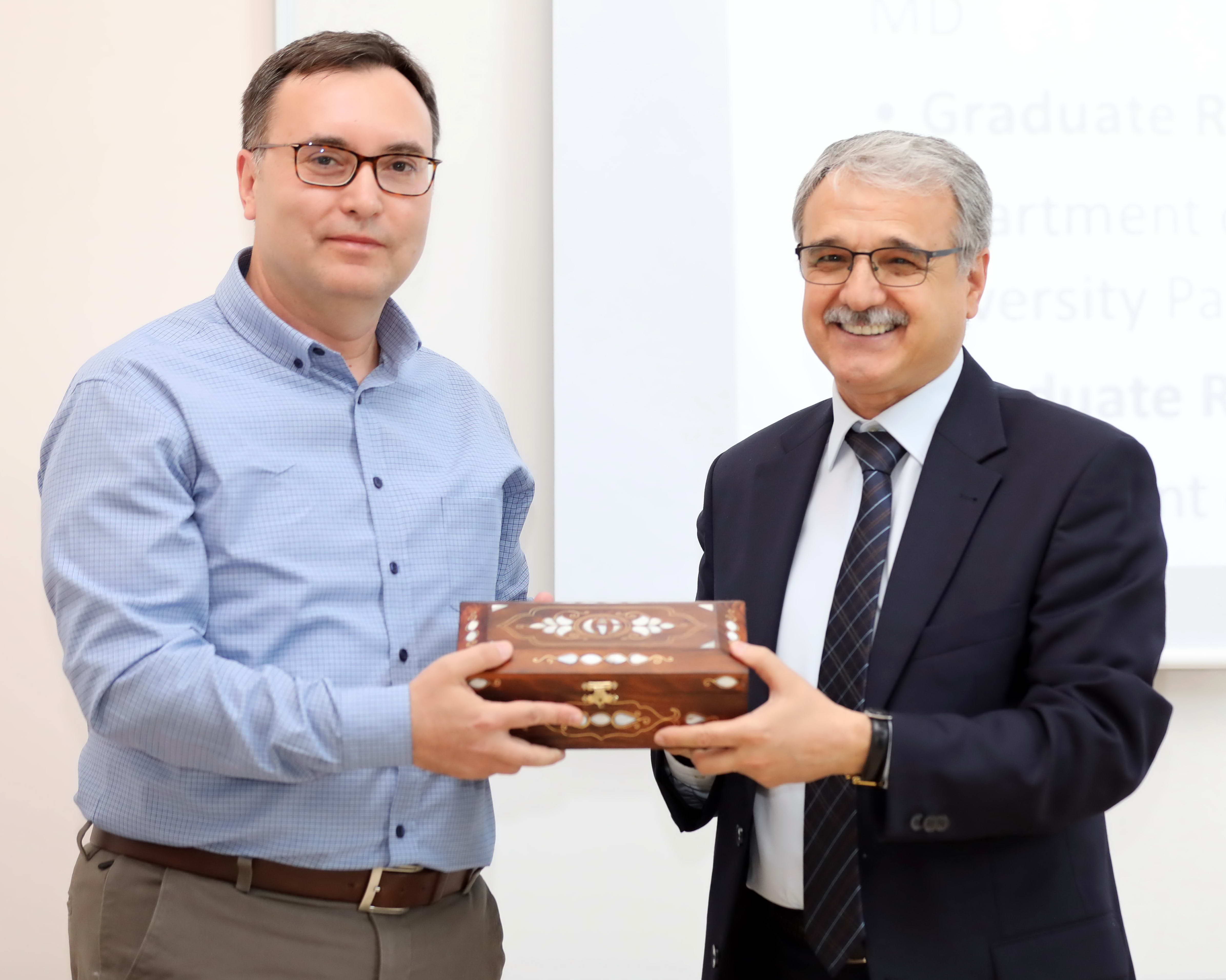 Seminerde, GAÜN Rektör Yardımcısı Prof. Dr. Metin Bedir, Ortadoğu Teknik Üniversitesi Öğretim Üyesi Prof. Dr. Oğuz Uzol’a hediye takdim etti.