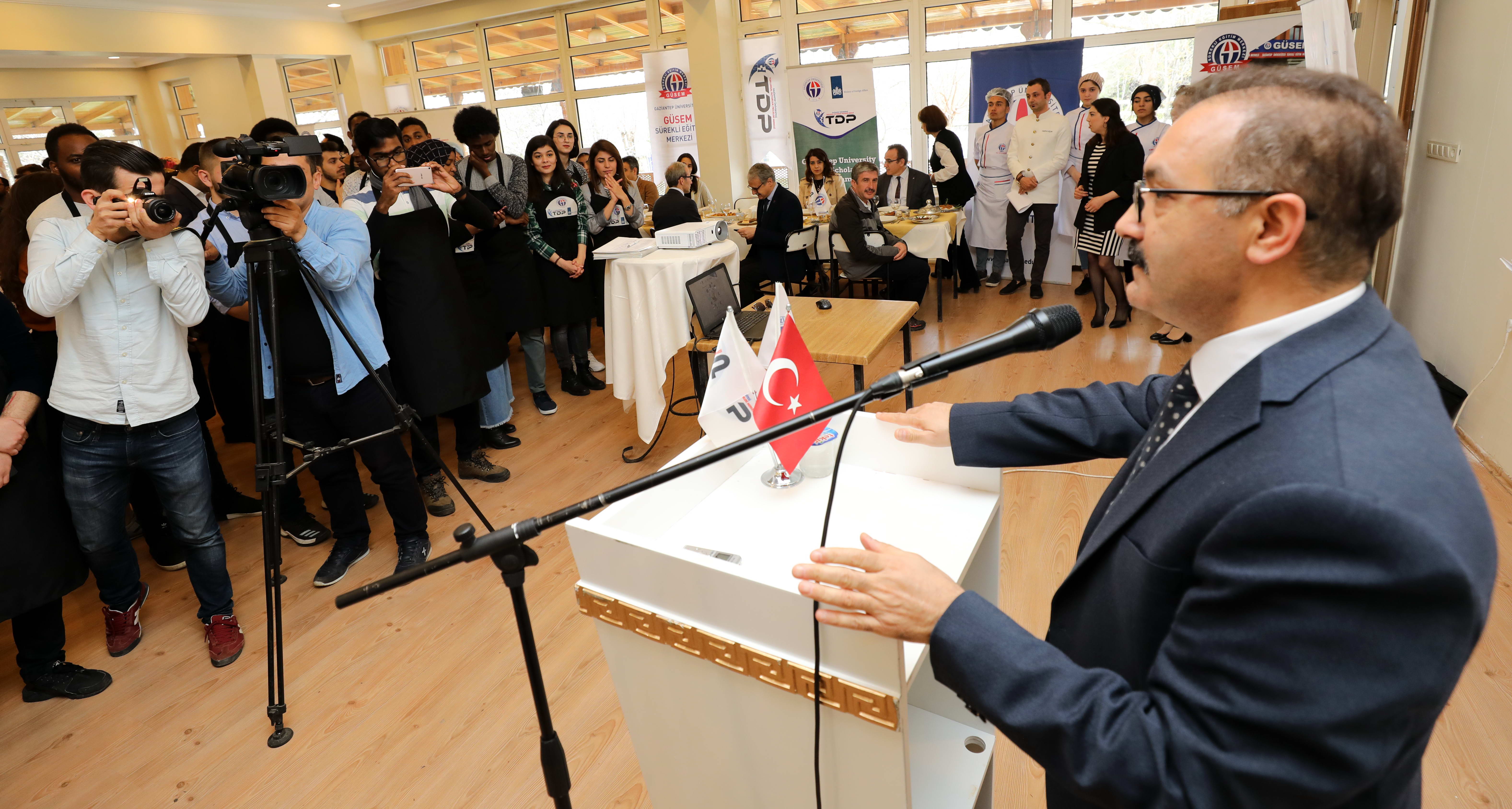 GAÜN Güzel Sanatlar Fakültesi Gastronomi Bölümü Mutfağında düzenlen festivalin açılış konuşmasını yapan GAÜN Rektörü Prof. Dr. Ali Gür, Gaziantep Üniversitesi’nin uluslararası saygınlığı olan, Türkçe, Arapça ve İngilizce eğitim veren, 107 ülkeden 4 binin üzerinde öğrencisi olan bir üniversite olduğunu vurguladı. Prof. Dr. Gür, “Biz sadece öğrencilerimize eğitim vermiyoruz aynı zamanda Gaziantep’in ve Türkiye’nin kültürlerini de tanıtıyoruz. Bununla ilgili üniversitemizde güzel bir proje yürütülüyor. Hollanda Dış İşleri Bakanlığı’ndan aldığımız kaynakla, yabancı uyruklu öğrencilerimize 72 saatlik süresi içerisinde Gaziantep yemeklerini öğrettik. Aldıkları yemek eğitimi sonrası müthiş yemek hazırladılar. Böylelikle hem Gaziantep kültürünü tanımış oldular hem de Gaziantep yemeklerini alıp kendi ülkelerine götürecekler. Böyle projelerle hem eğitim almış oluyorlar hem de kültürümüzle birlikte Türkiye’yi daha sıcak bir şekilde ülkelerine aktarmış olacaklar.”