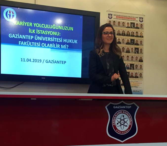 GAÜN Hukuk Fakültesi Dekan Yardımcısı Dr. Öğretim Üyesi Ahmet Bozdağ ve Araştırma Görevlisi Duygu Dağlıoğlu, Şehitkamil Abdülkadir Güllüoğlu Fen Lisesi ve Şehitkamil Kız İmam Hatip Lisesinde sunum eşliğinde gerçekleştirdikleri paylaşım toplantısında, lise son sınıf öğrencilerine Hukuk Fakültesini tanıtarak, mezuniyet sonrasında çalışabilecekleri iş ve kariyer alanları hakkında öğrencileri bilgilendirdi.