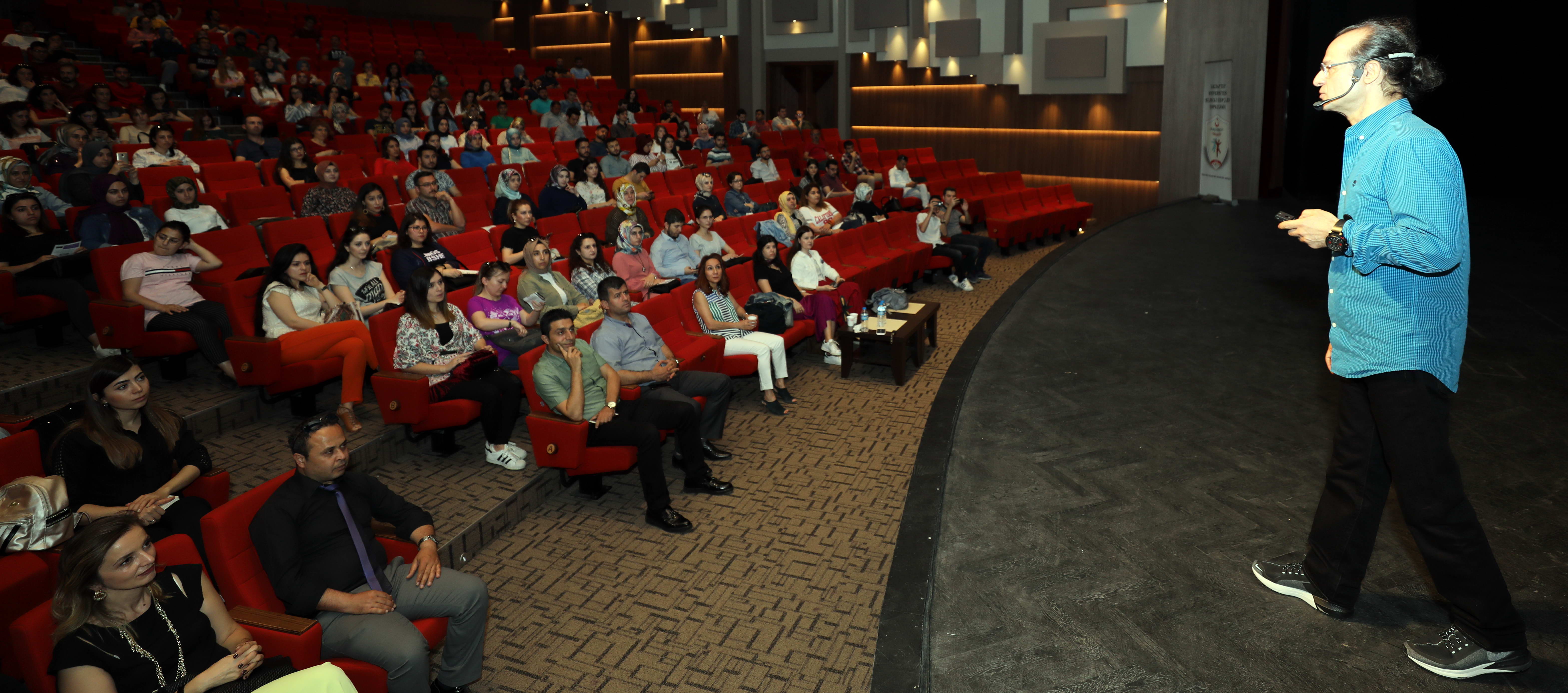 Uzm. Psk. Dan. Deniz Altunay tarafından GAÜN Atatürk Kültür Sahnesinde gerçekleştirilen konferansta Grup Psikoterapistinin kurucusu Moreno’nun geliştirdiği Psikodrama Grup Psikoterapisi sistemi hakkında öğrencilere bilgi verildi. Rol kavramı çok önemli olduğunu belirten Uzm. Psk. Dan. Altunay, hayatımızda rolün olmadığı hiçbir anın olmadığını söyleyerek, rol ve rol analizleriyle ilgili bilgilendirdi. Konferans içinde tüm gruplarla uygulamalar yapacaklarını ifade eden Altunay, Psikodramanın eylem yöntemi olduğunu, en hızlı, en donanımlı Grup Psikoterapisti sistemlerinden birisi olduğunu belirtti. Altunay sözlerinin devamında şunları söyledi: “Rol bizim için bir davranış birliği ve kültürün oluşmasını sağlayan en önemli unsur. Rolün alt bileşenleri tüm duygusal, sosyal, somatik roller gibi alt bölümleri var. Bu rollerin içinde nasıl bir varoluşumuz, duruşumuz var bunları inceliyoruz.”