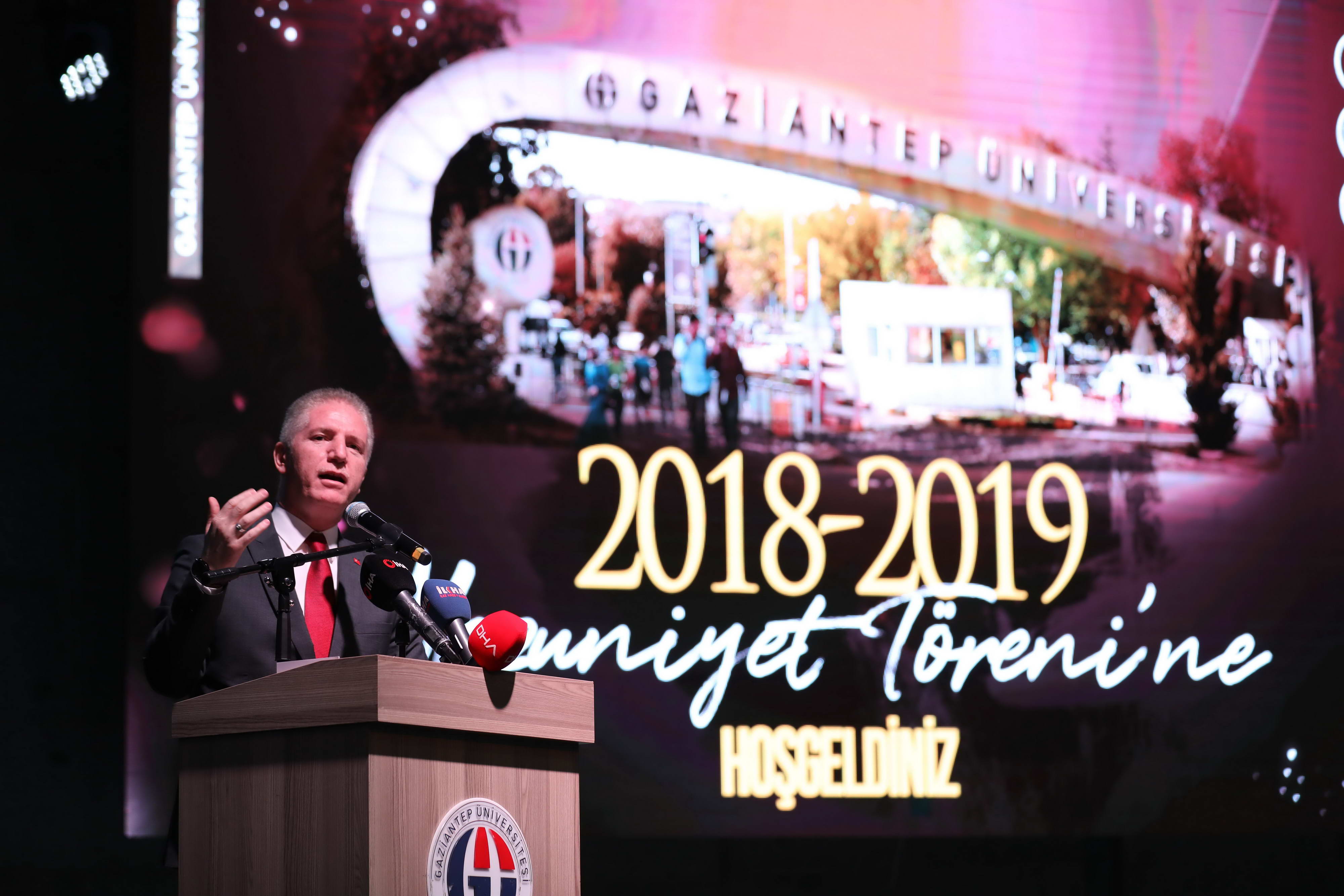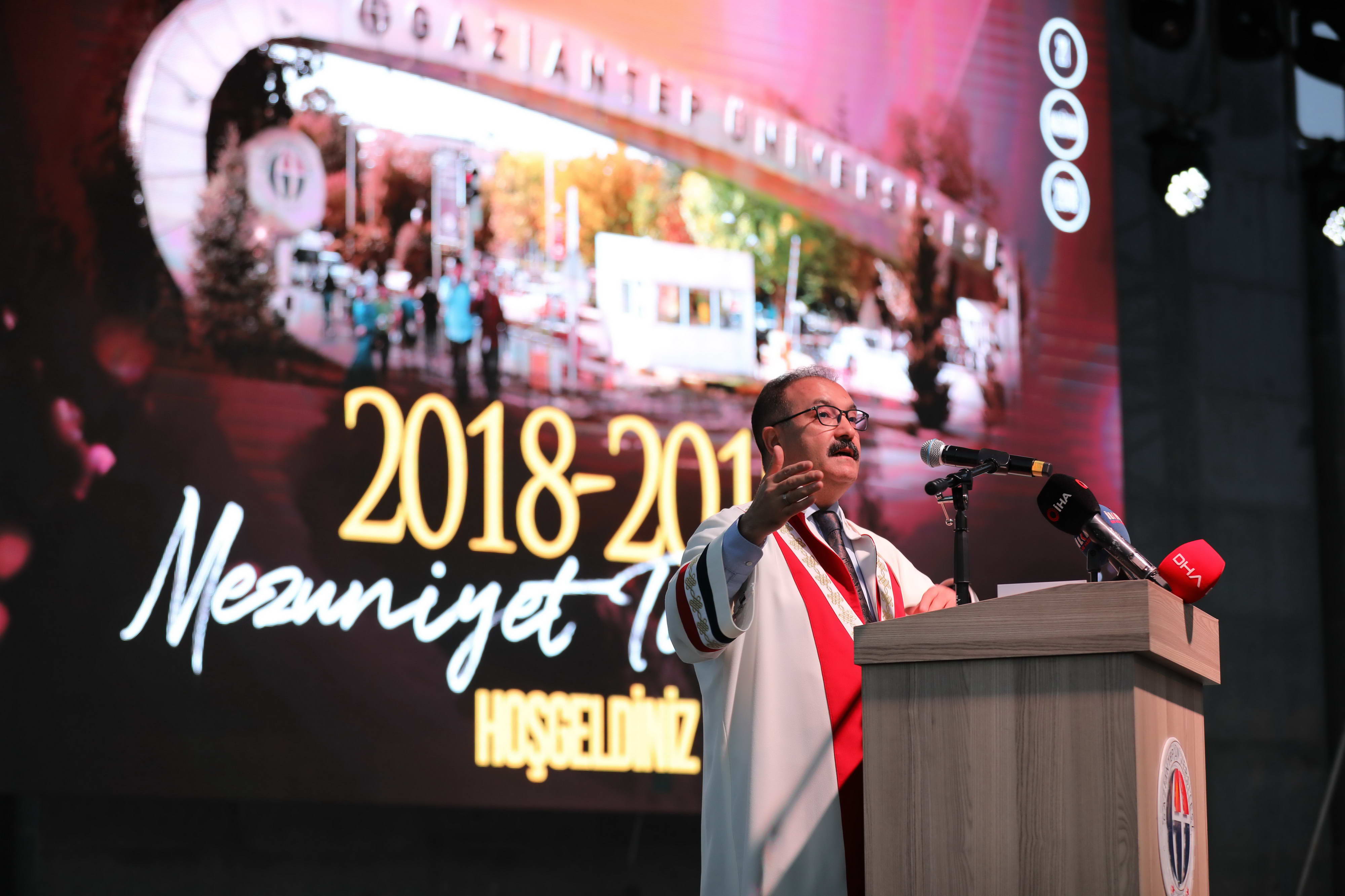 Gaziantep Üniversitesinin sağlık, mühendislik ve fen bilimlerinde başarısını kanıtladığını, buna sosyal bilimlerin de eklendiğini ifade eden Rektör Prof. Dr. Ali Gür konuşmasını şöyle sürdürdü: “Toplumsal Duyarlılık Projeleri ile insanımıza dokunuyoruz. Sadece bu yıl 11 bin 550 öğrencimiz, 300 projeyi başarıyla uyguladı. Göç Enstitümüz başarılı araştırma ve çalışmalara imza atıyor. Projelerimizle Türkiye’nin geleceğine yön veriyoruz. Uluslararası, inovatif, girişimci ve güvenlikli bir üniversite olan Gaziantep Üniversitesi, dünyanın çeşitli ülkelerinden 4 binin üzerinde öğrencisiyle uluslararası bir üniversite olmanın gururunu yaşıyor. Türkçe, İngilizce ve Arapça olmak üzere 3 dilde eğitim yapan Türkiye’nin ilk ve tek üniversitesiyiz. Cerablus’ta açtığımız Meslek Yüksekokulu ile yurt dışında bölümü olan ilk üniversite olma ünvanını elde ettik. Bu o kadar ses getirdi ki bugün Lübnan ve Ürdünden de talepler var. Havacılık ve Uzay Bilimleri Fakültesi bu yıl ilk mezunlarını veriyor. Ailelerimiz gözünden bile sakındığı çocuklarını bize emanet etti. Biz de onları bilgiyle, vatan, millet sevdasıyla donattık ve gururla taşıyacakları diplomalarıyla geriye veriyoruz. Gençlerimiz bu gururu yaşayın ve sizi bugünlere getiren üniversitenizi de unutmayın.”