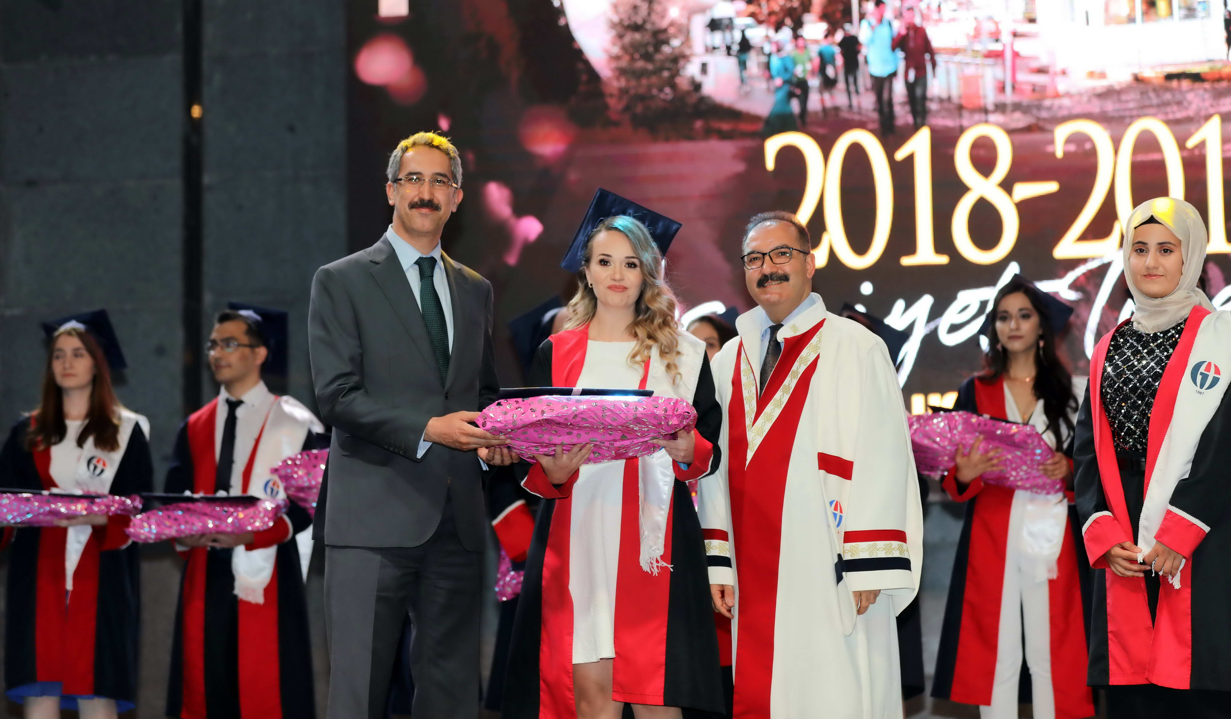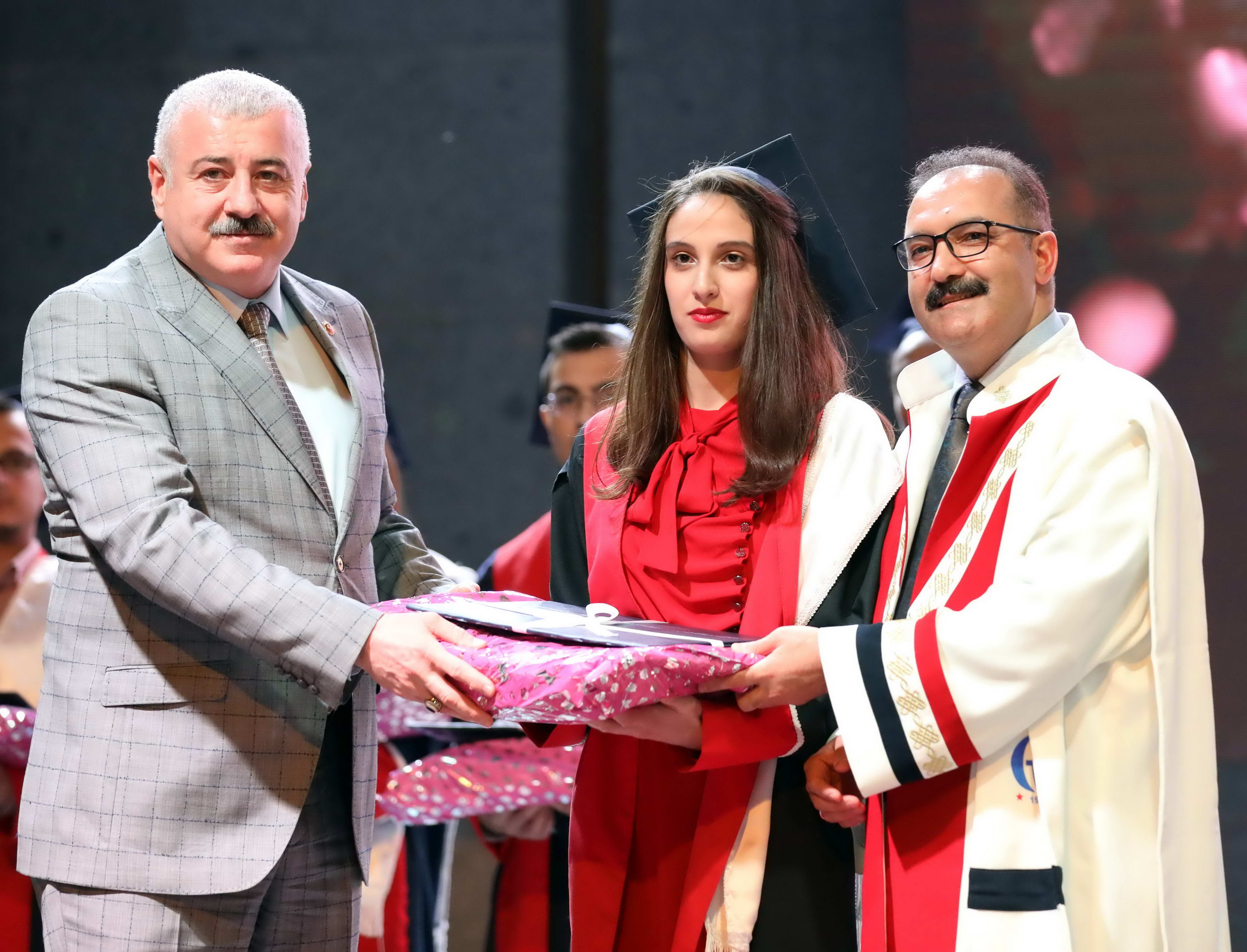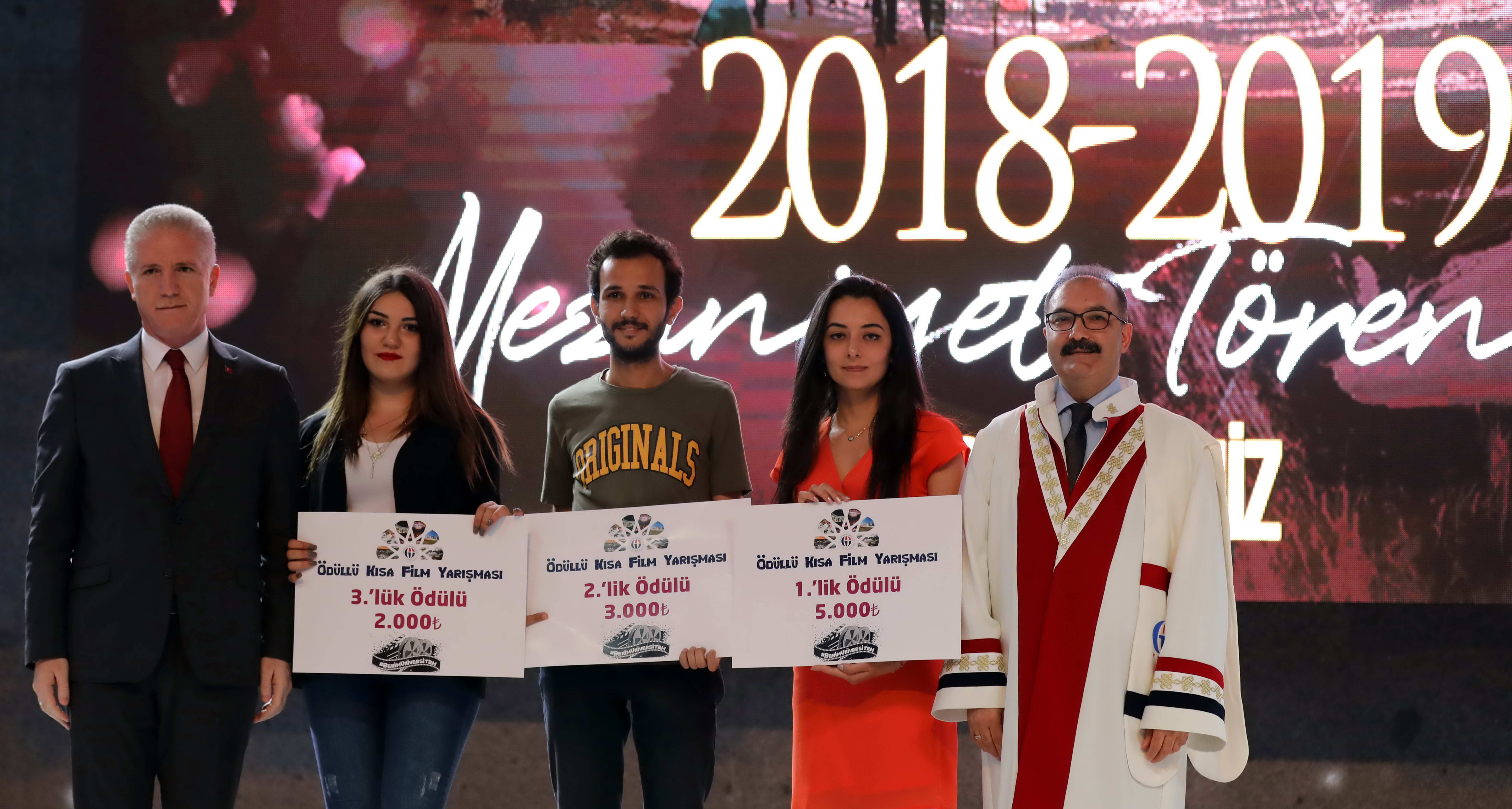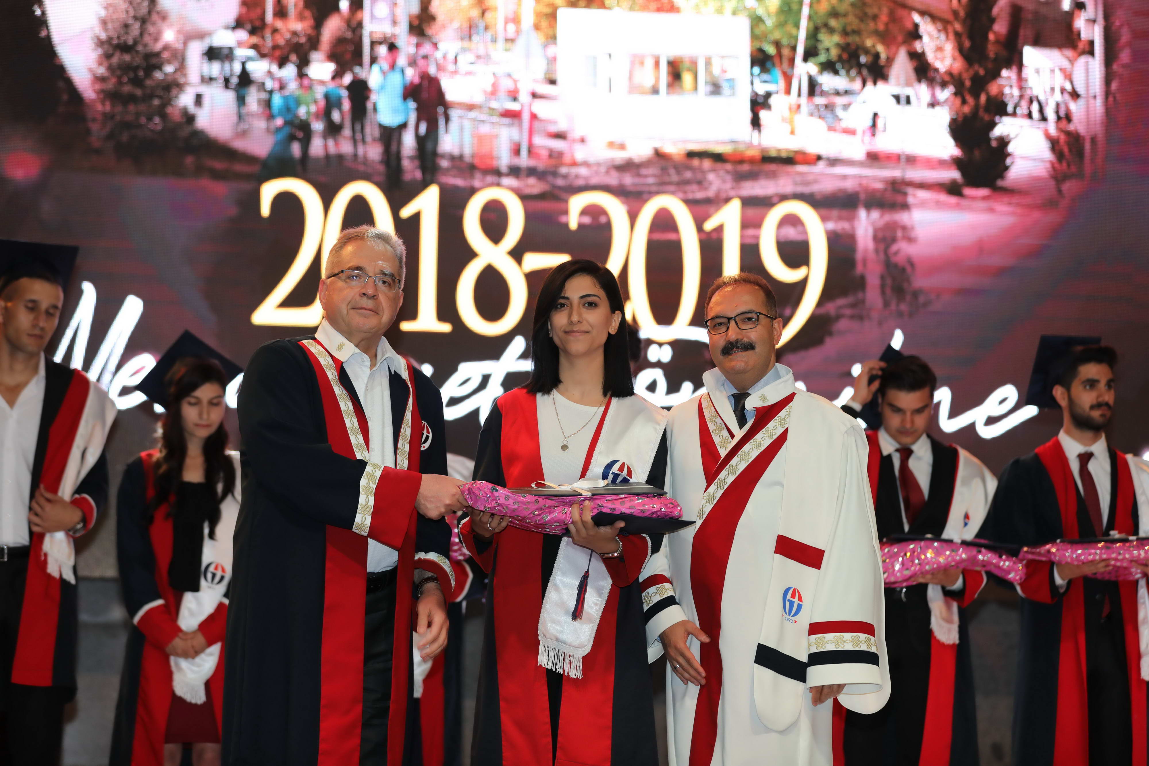 Öğrenci andının okunması ve dönem birincileri tarafından mezuniyet kütüğüne plaket çakılması sonrasında dereceye giren öğrencilere protokol üyeleri ve üniversite üst yönetimi tarafından diploma ve ödülleri verildi.