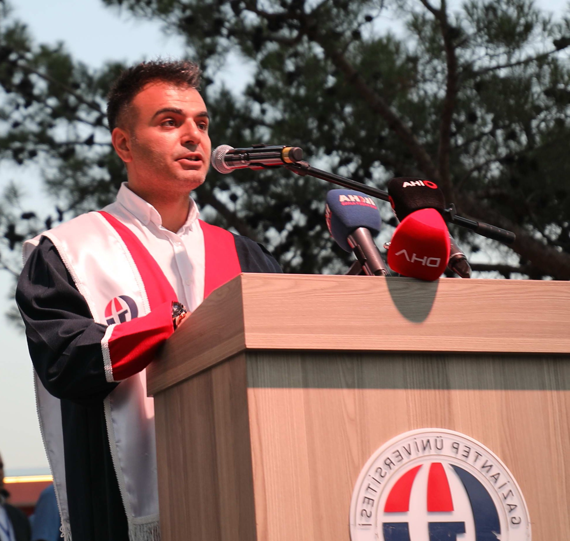 Mezun öğrenciler adına konuşan Güzel Sanatlar Fakültesi Öğrencisi Ali Özerol, Gaziantep Üniversitesi’nde, eğitim hayatına başladığı ilk günden itibaren, böylesine güçlü bir aileye mensup olmaktan çok büyük mutluluk duyduğunu belirtti. Eğitimin belirli bir yaş ve süreyi kapsayan bir süreç olmadığını, insanın nefes aldığı sürece, istemli veya istemsiz olarak gerçekleştirdiği bir olgu olduğunu söyleyen Ali Özerol, “Şimdi, öğrendiklerimizi gelecek nesillere aktarma ve bilgilerimizin üzerine yeni bilgiler ekleyerek kendimizi geliştirme zamanı. Gelecek nesillerimize, evlatlarımıza ve ülkemize bırakacağımız mirasların en önemlilerinden biri de, hatta en önemlisi, şüphesiz, bilgidir. Ülkemizin hedefini ‘çağdaş medeniyetlerin seviyesi’ olarak işaret eden Mustafa Kemal Atatürk’ün gösterdiği yoldan gitmek ancak bu şekilde mümkündür” şeklinde konuştu.