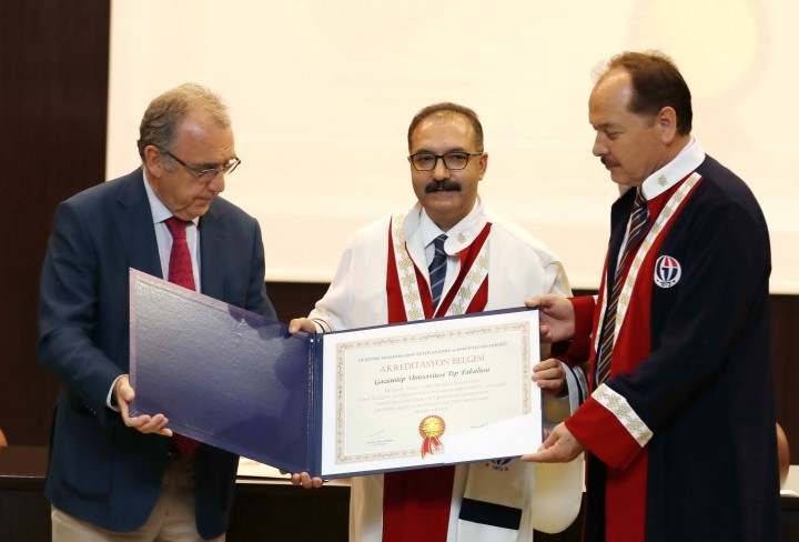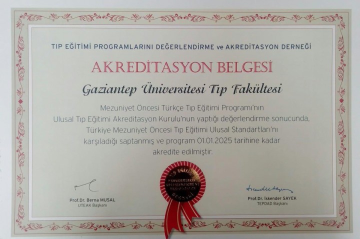 Ulusal Tıp Eğitimi Akreditasyon Kurulu (UTEAK) tarafından yapılan değerlendirme sonucu Gaziantep Üniversitesi (GAÜN) Türkçe Tıp Programı 2025 yılına kadar akredite edildi. GAÜN Şahinbey Araştırma ve Uygulama Hastanesi Oditoryumda gerçekleştirilen törende, UTEAK Başkanı Prof. Dr. İskender Sayek tarafından Gaziantep Üniversitesi Rektörü Prof. Dr. Ali Gür’e ve Tıp Fakültesi Dekanı Prof. Dr. Yusuf Zeki Çelen’e Akreditasyon Belgesi takdim edildi.