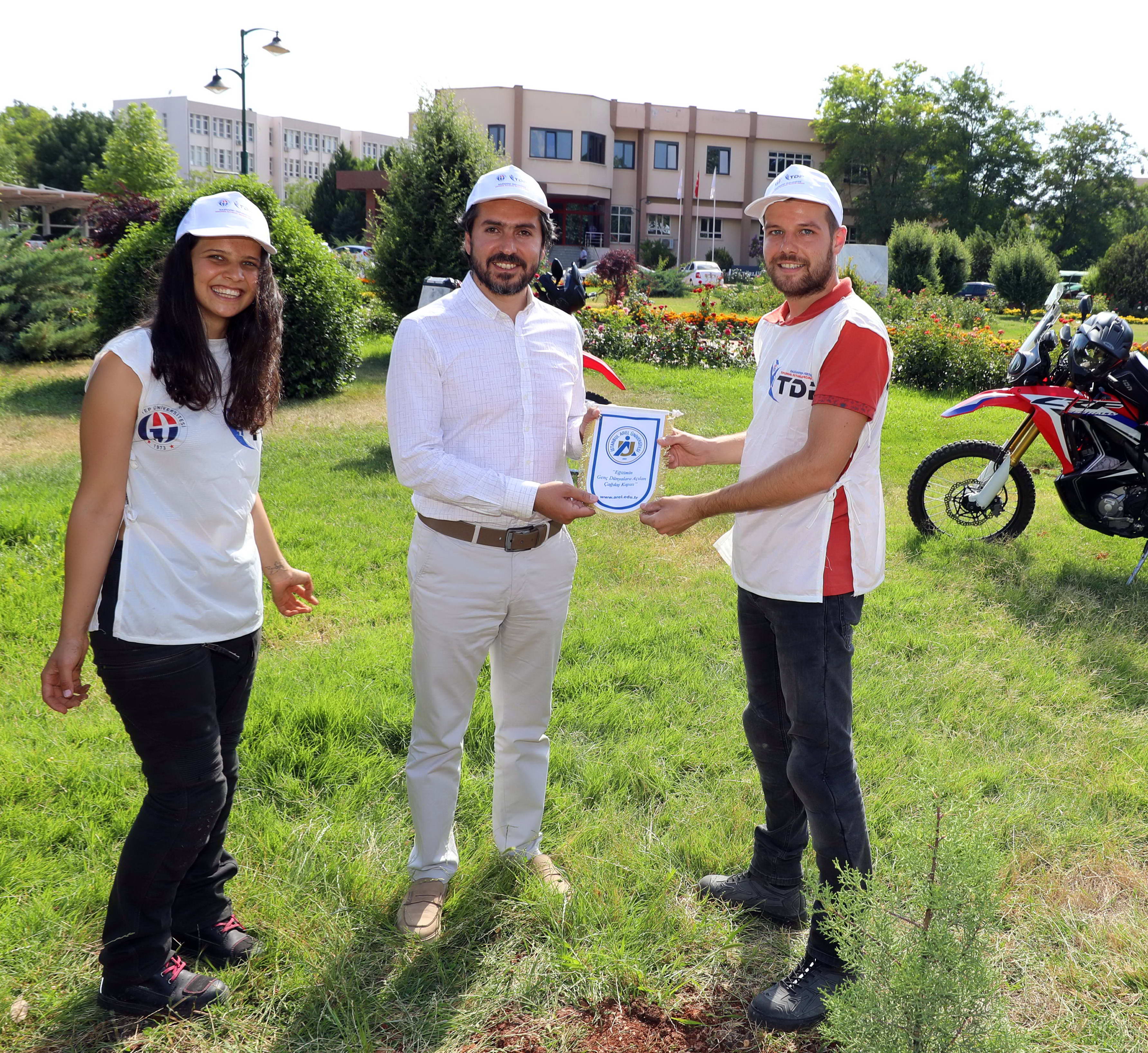 Daha yeşil bir dünyanın önemine dikkat çekmek adına motosiklet ile yola çıkan İstanbul Arel Üniversitesi Endüstri Mühendisliği Öğrencisi Su sezer ve aynı üniversiteden bu yıl mezun olan Berkay Sert Gaziantep Üniversitesi’ni ziyaret ederek, Rektörlük alanına fidan dikti.