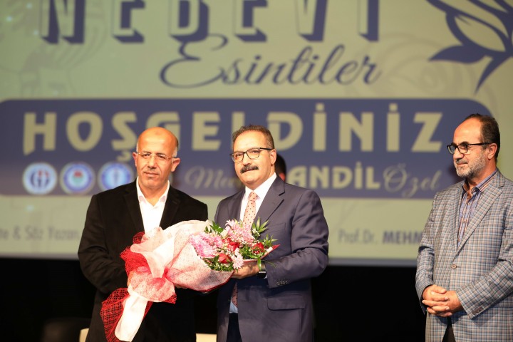 GAÜN Rektörü Prof. Dr. Ali Gür, Prof. Dr. Mehmet Akbaş’a çiçek takdim ederken, sanatçı Fatih Zirek’e plaket takdim etti. SAĞLIK-SEN Gaziantep Üniversitesi Hastanesi Şubesi Başkanı Cuma Kerkez tarafından da Prof. Dr. Ali Gür’e çiçek takdim etti. Prof. Dr. Gür, “İnşallah her daim böyle mutlu aynı zamanda Resulullah sevgisiyle daim olalım. Allah bugünümüze bize aratmasın. Yakın zamanda aranan, bu bölgede Bilal-i Şam’ı kurtaracak olan bu millet olsun” dedi.